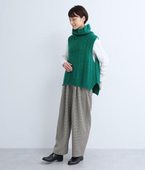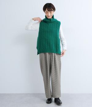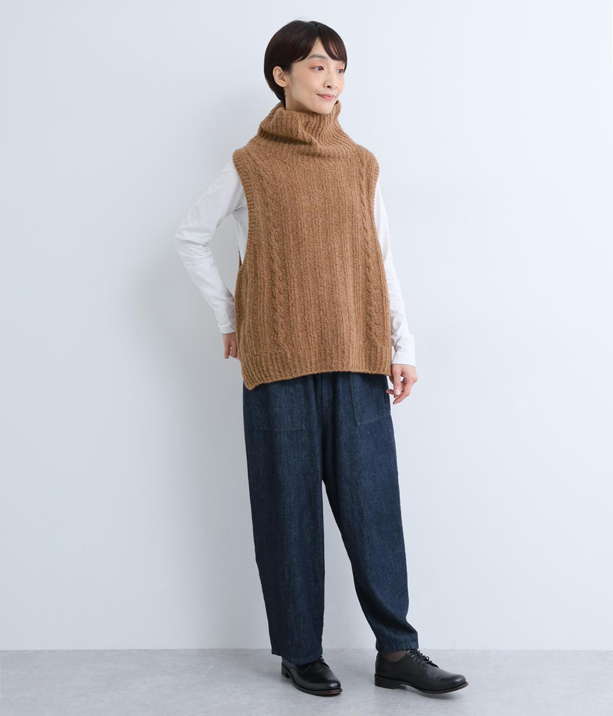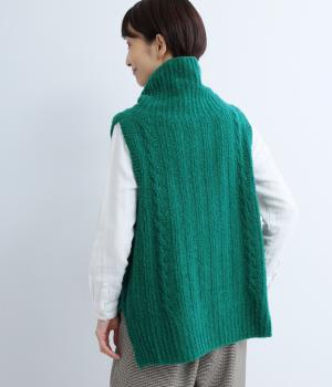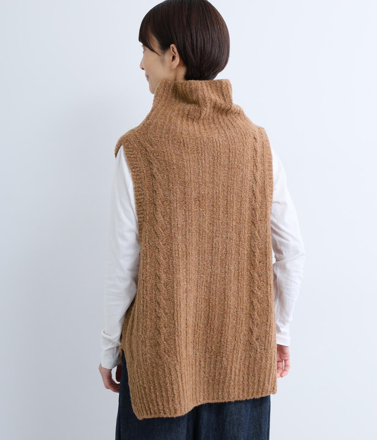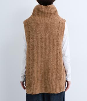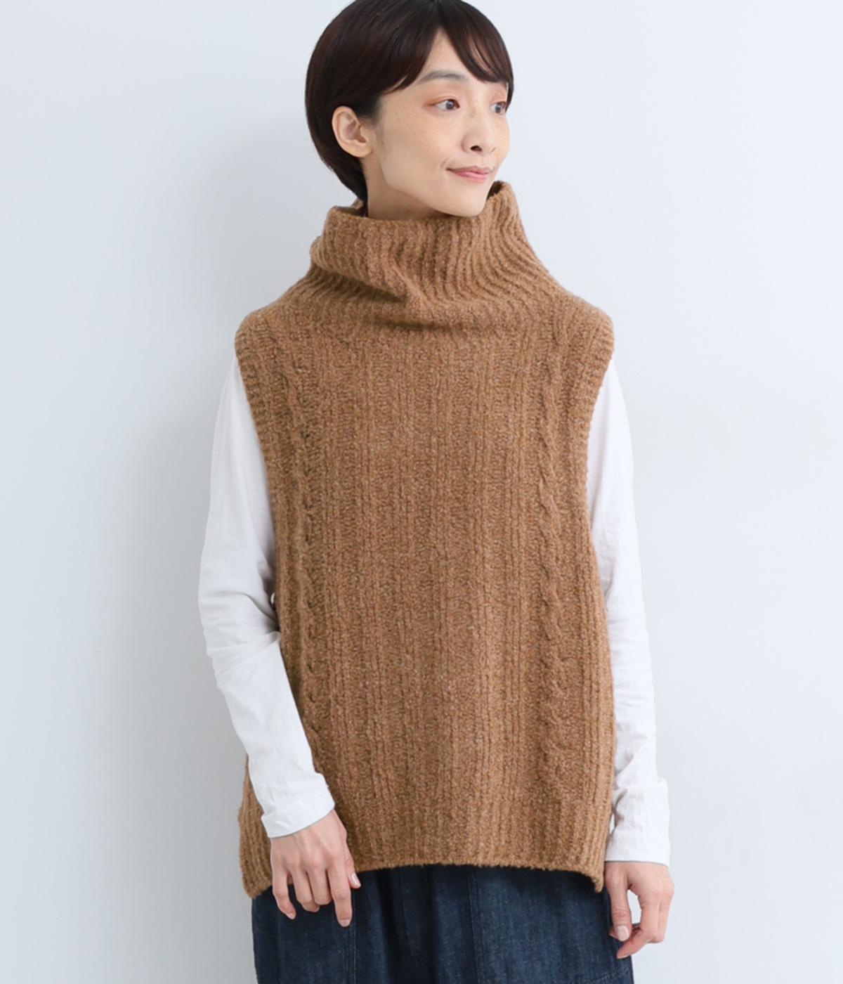 ボリュームのあるタートルネックがあたたかく、首まわりにほどよい存在感を添えるベストです。アームホールは広めで、どんなトップスともバランスよくレイヤードできます。裾のスリットが軽やかな抜け感を演出し、着こなしにリズムをプラス。編み地の表情がやさしく、ナチュラル感たっぷりに仕上がりました。