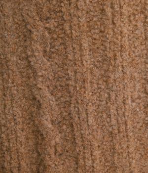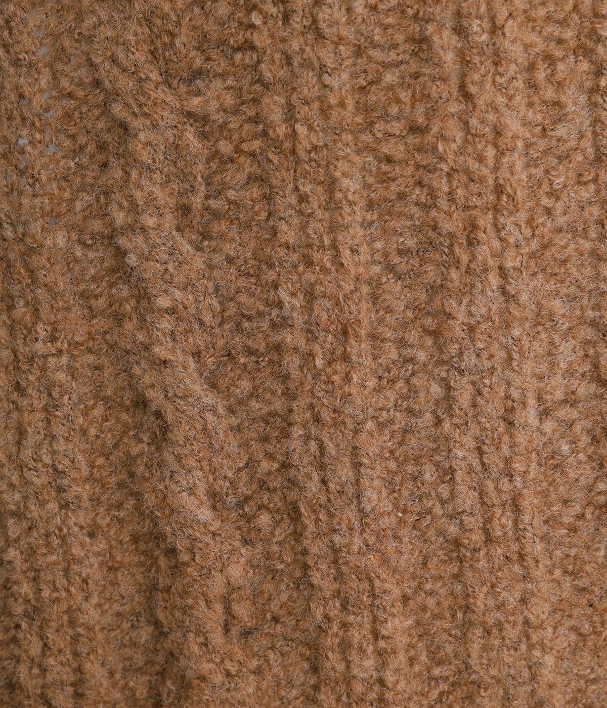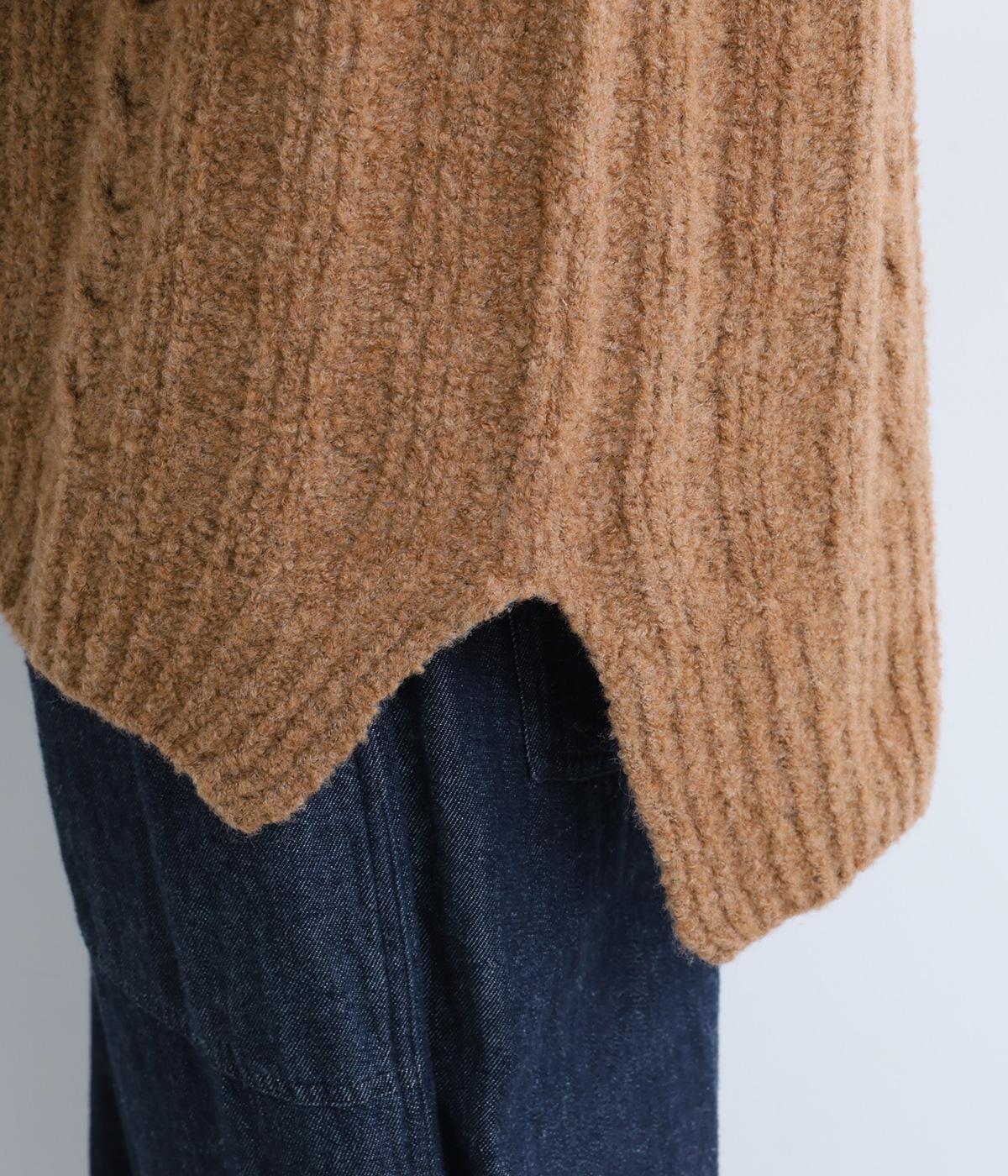 ループ状の糸で編み立てたブークレ素材を使用しました。表面にふんわりとした凹凸があり、チクチクしにくいやわらかさが魅力です。軽やかな着心地ながらしっかりとあたたかく、コーディネートに季節感を添えます。