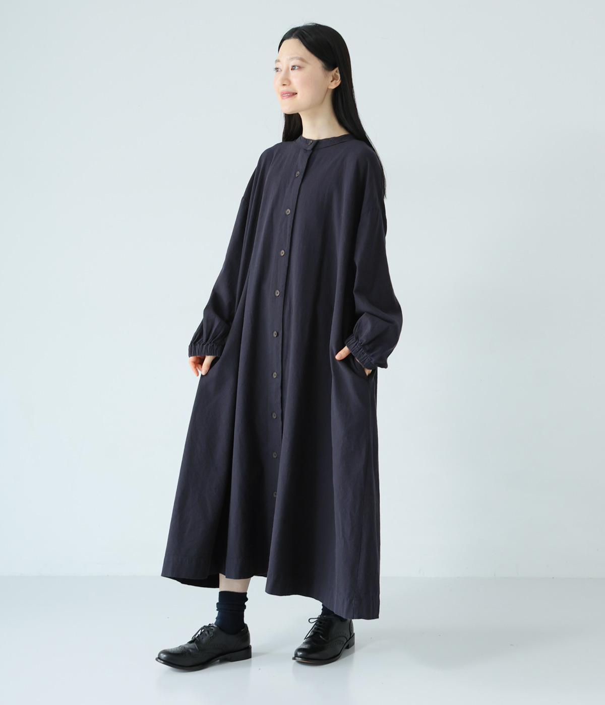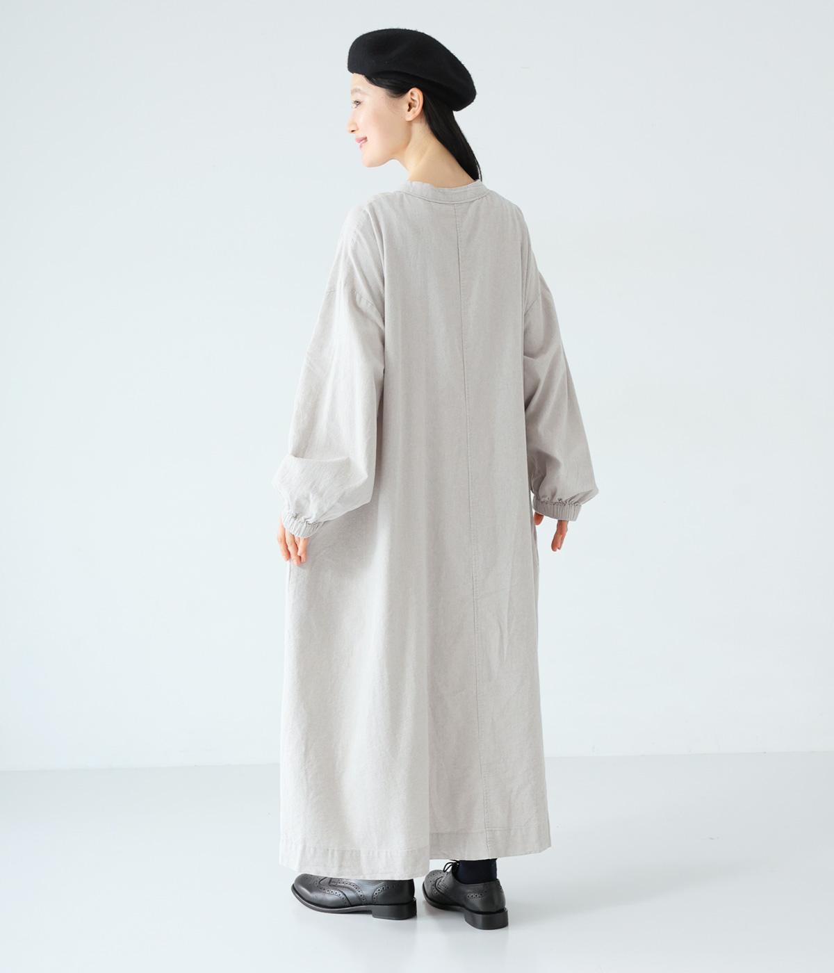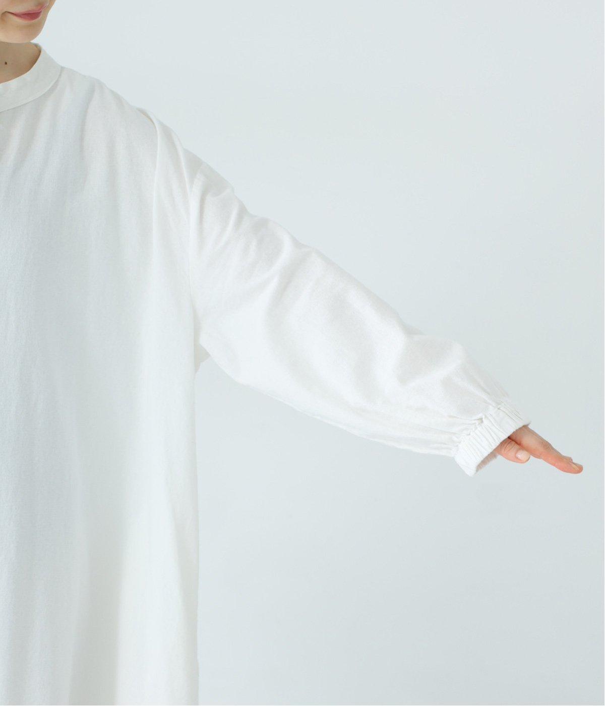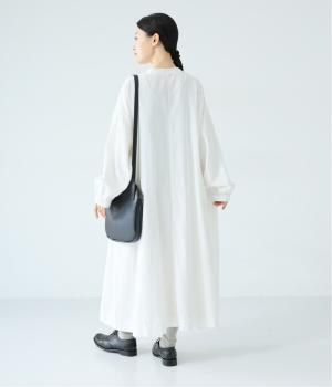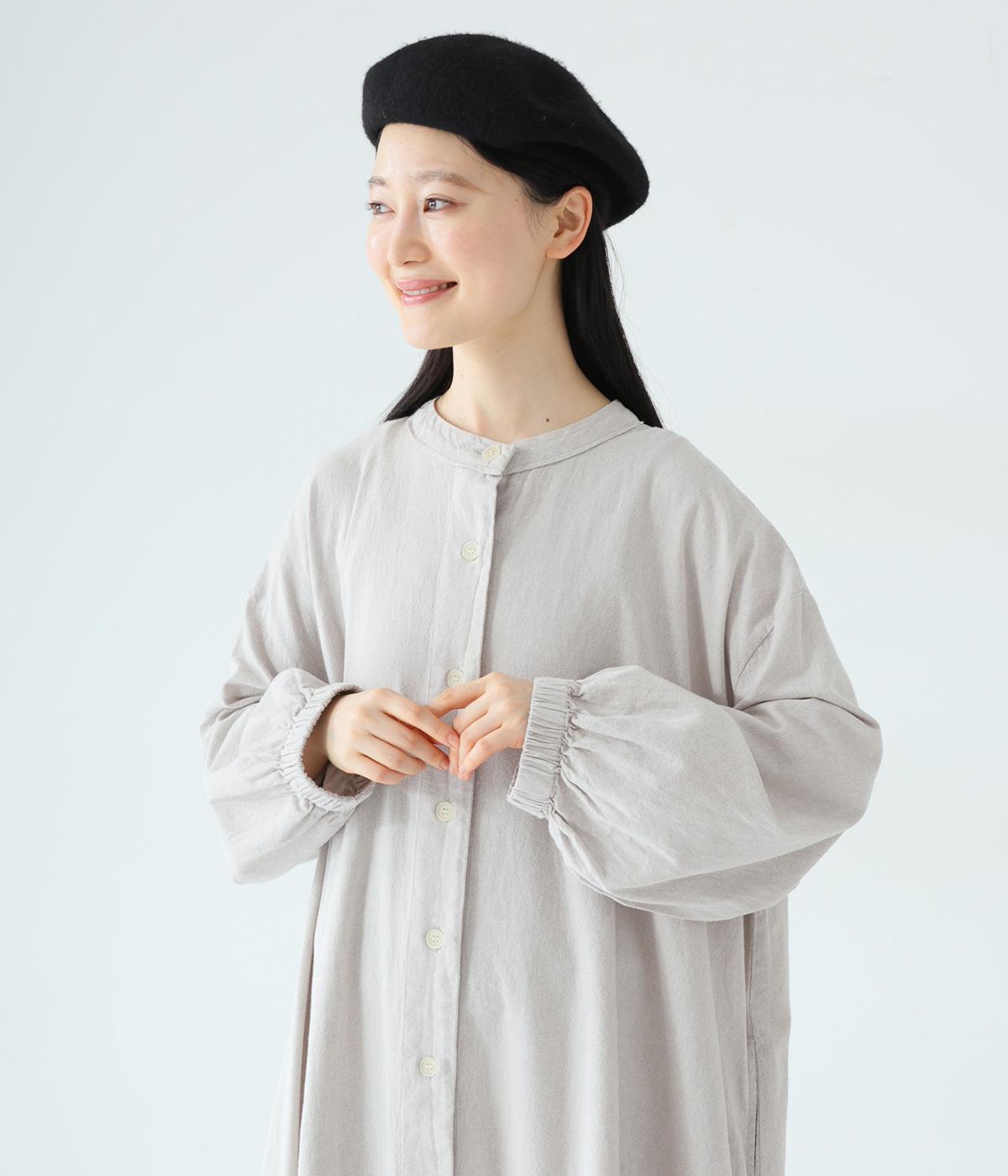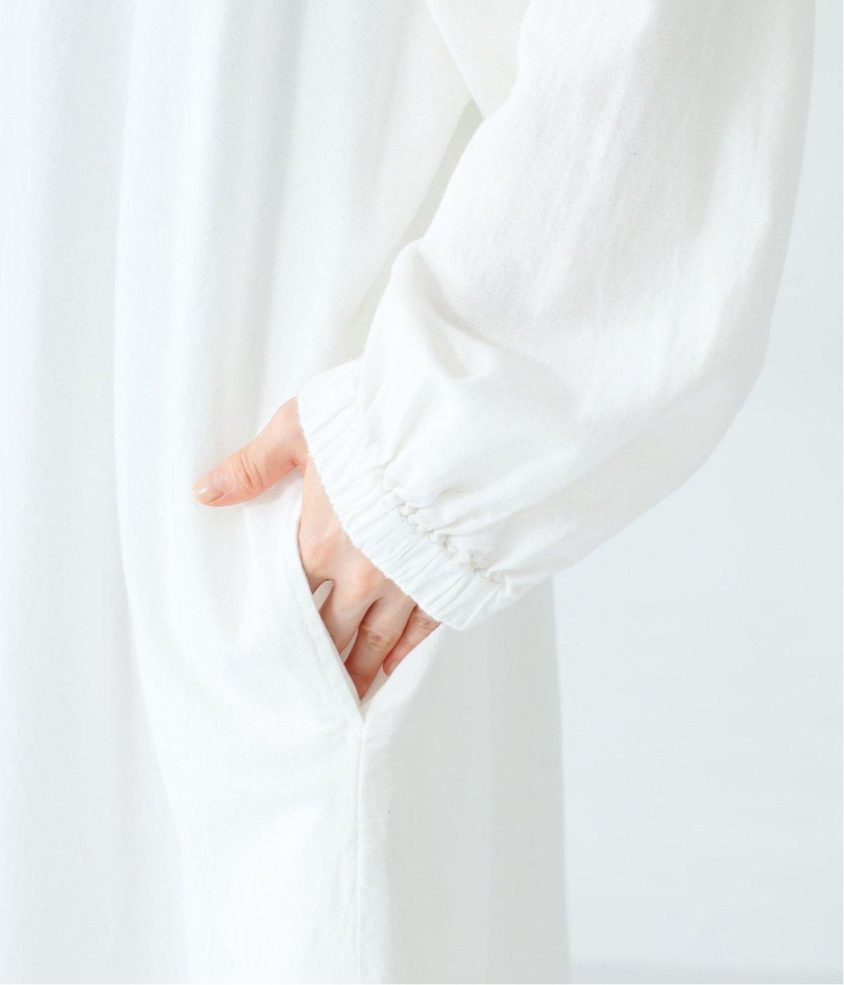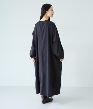 体がゆったりと泳ぐAラインシルエットのワンピース。ふくらみのあるギャザー袖が女性らしい柔らかな印象を醸します。袖口にはゴムを入れているので、袖をたくし上げても落ちてきにくいのが◎。両サイドには便利なポケットをつけました。