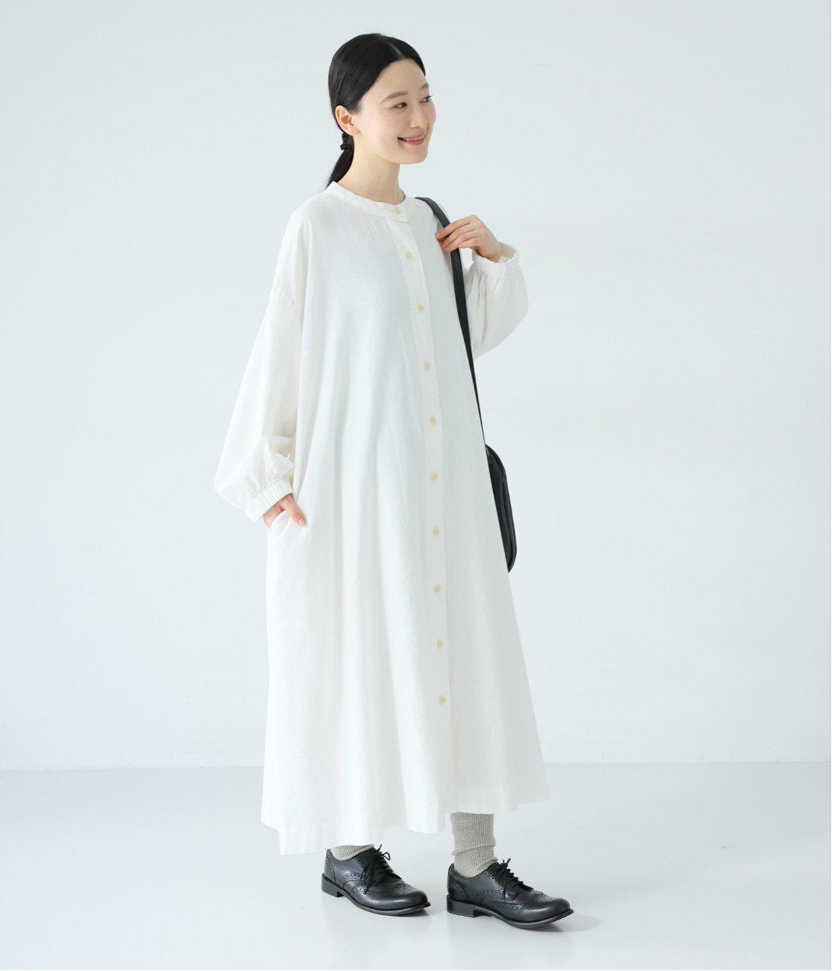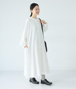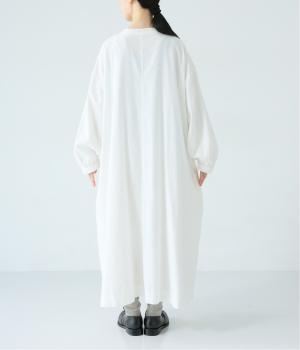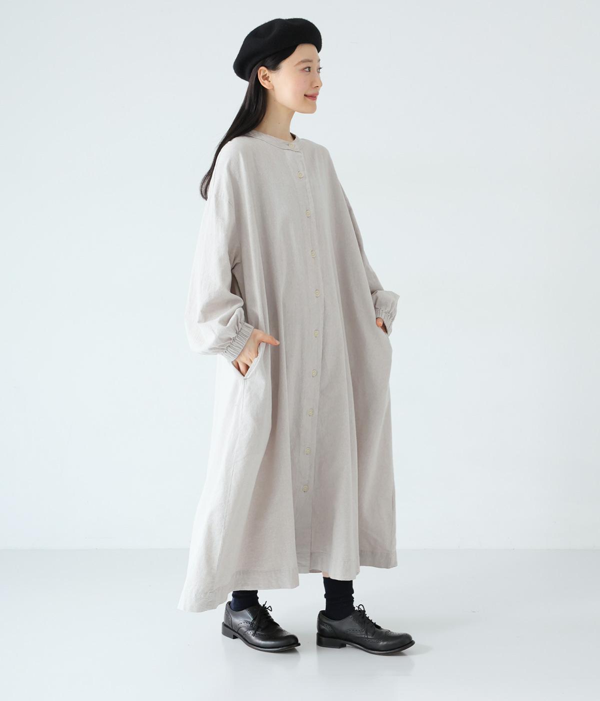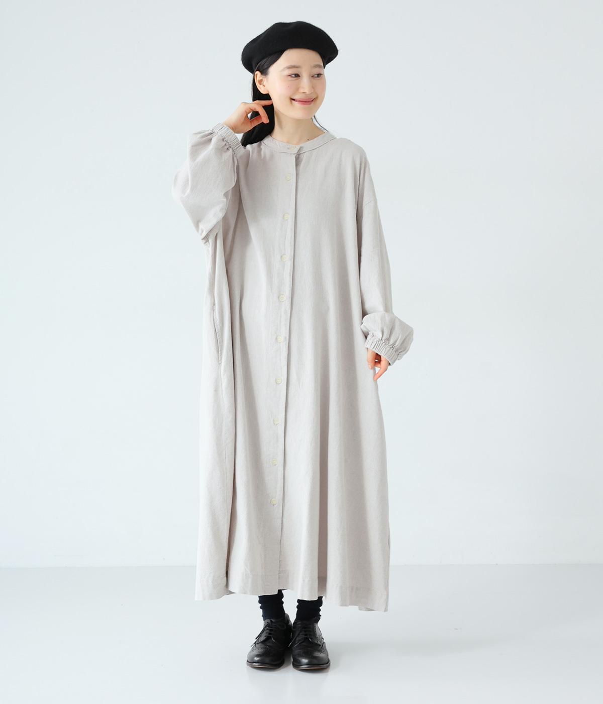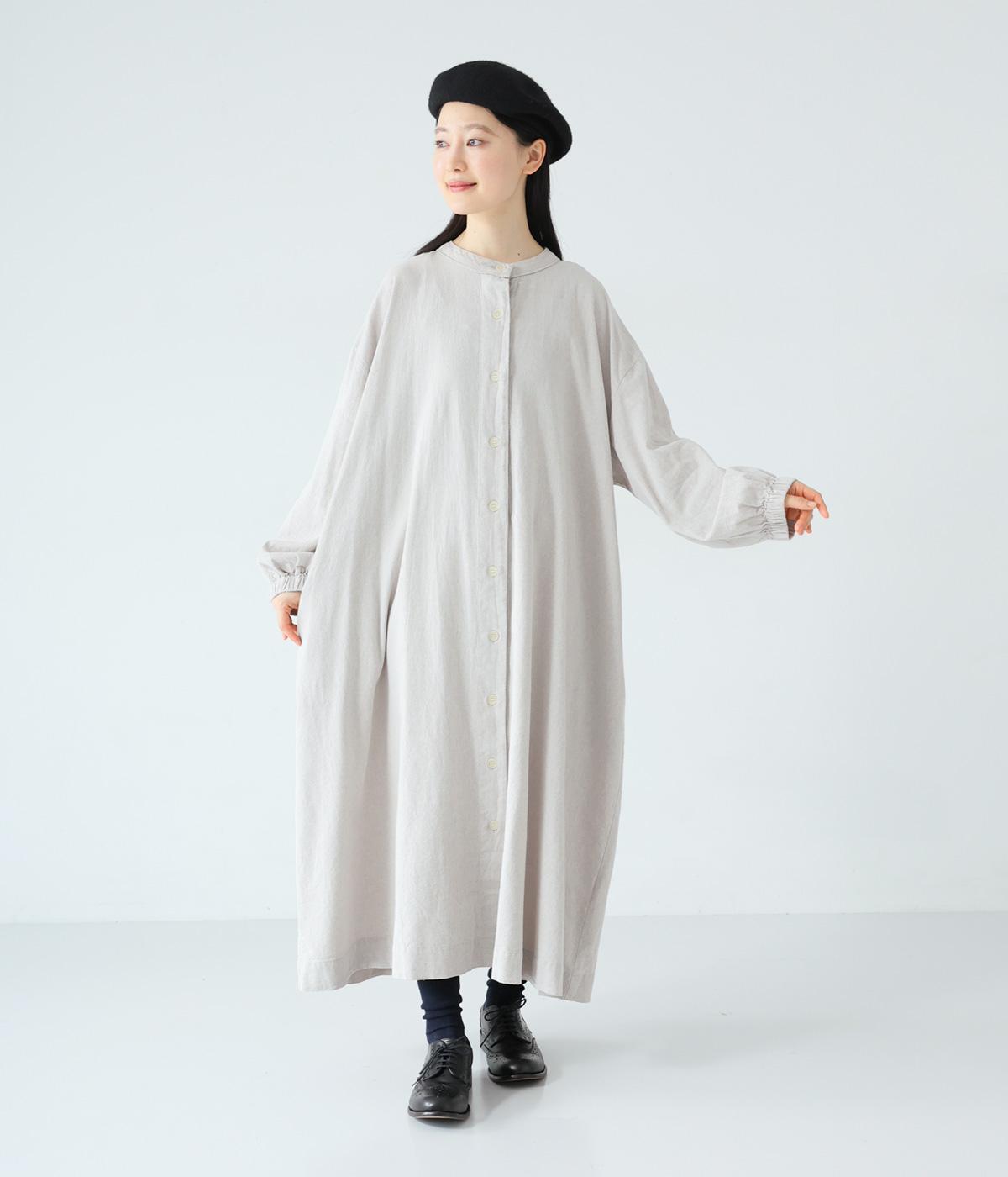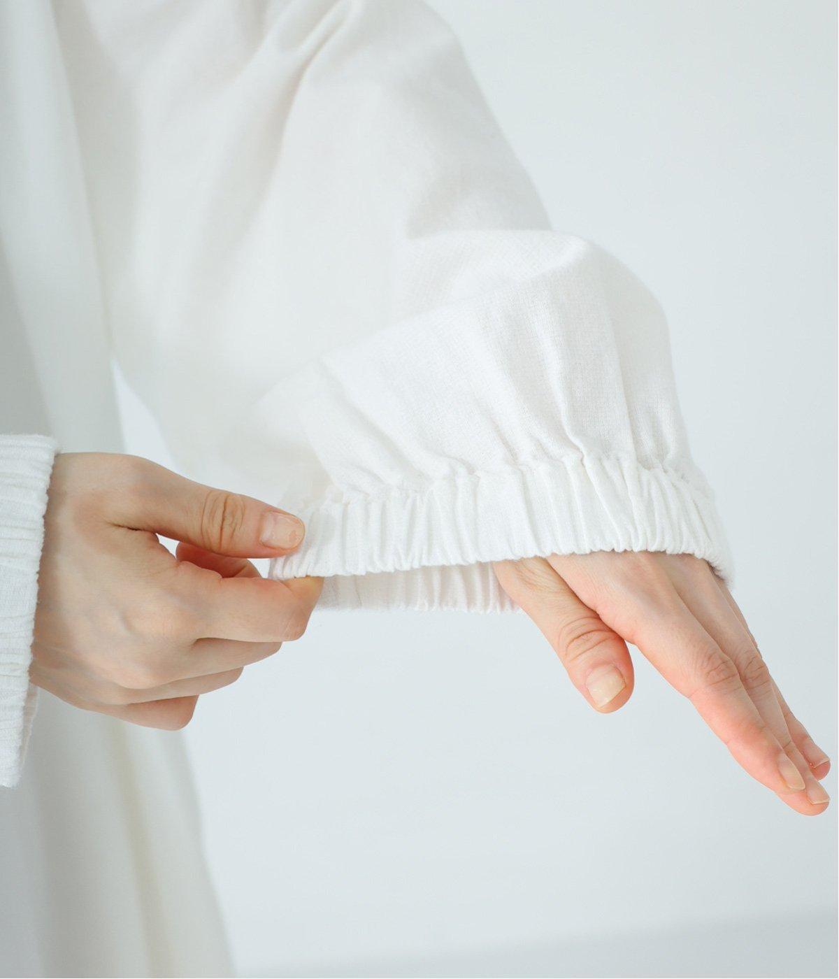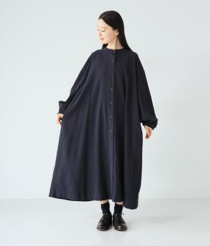 体がゆったりと泳ぐAラインシルエットのワンピース。ふくらみのあるギャザー袖が女性らしい柔らかな印象を醸します。袖口にはゴムを入れているので、袖をたくし上げても落ちてきにくいのが◎。両サイドには便利なポケットをつけました。