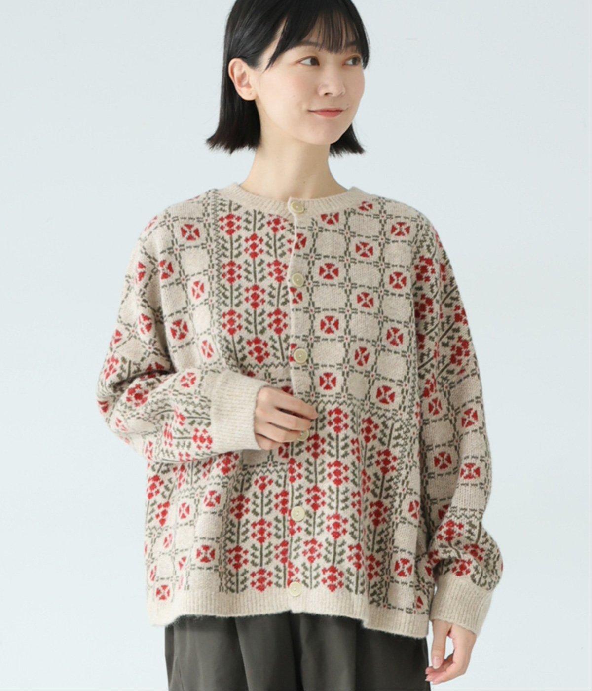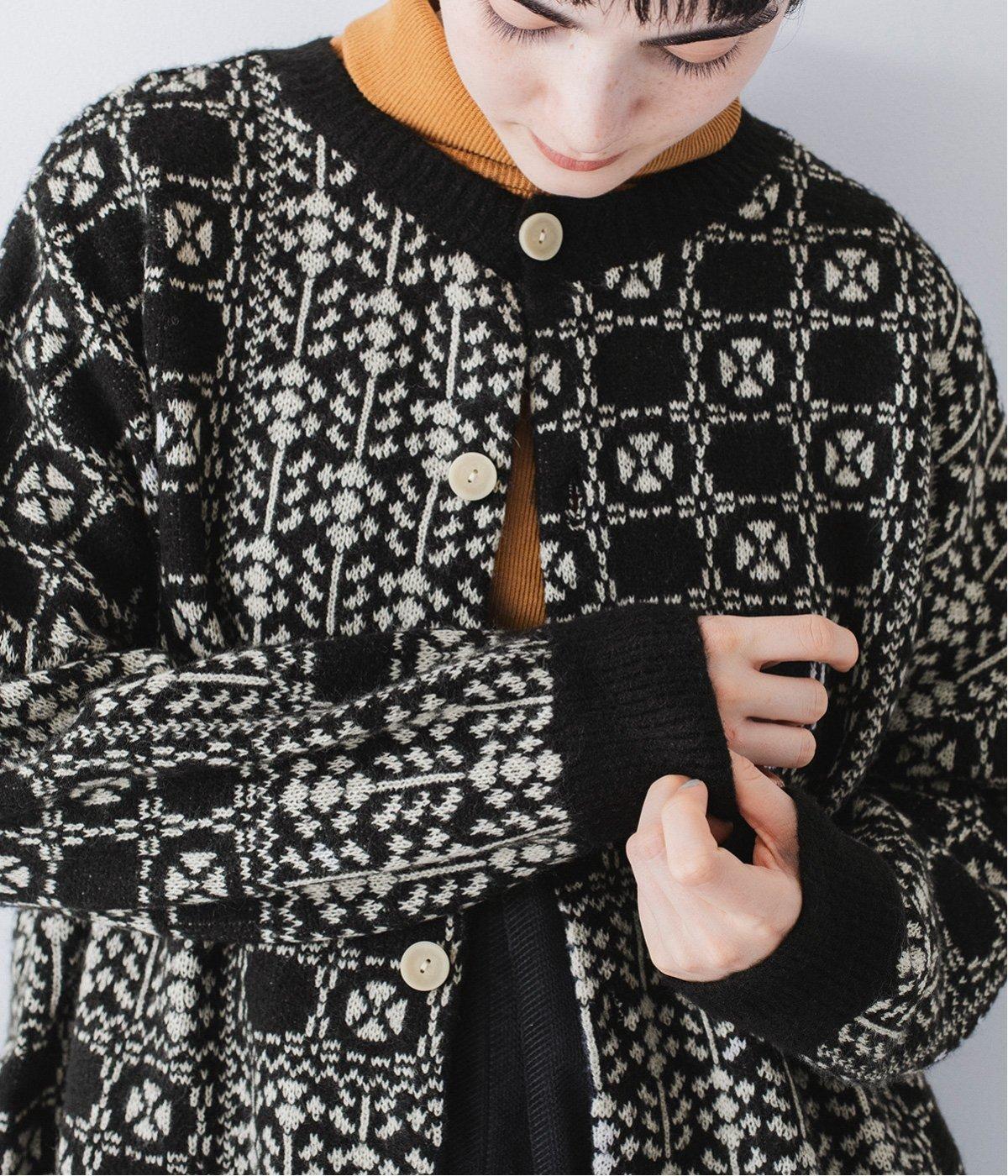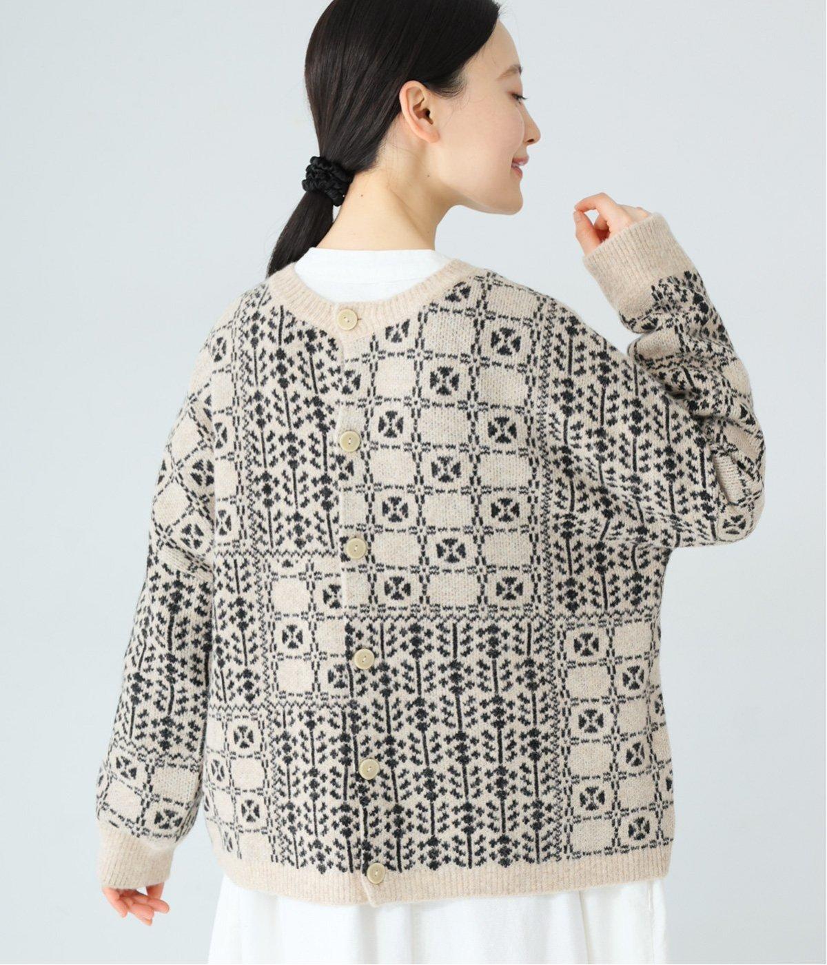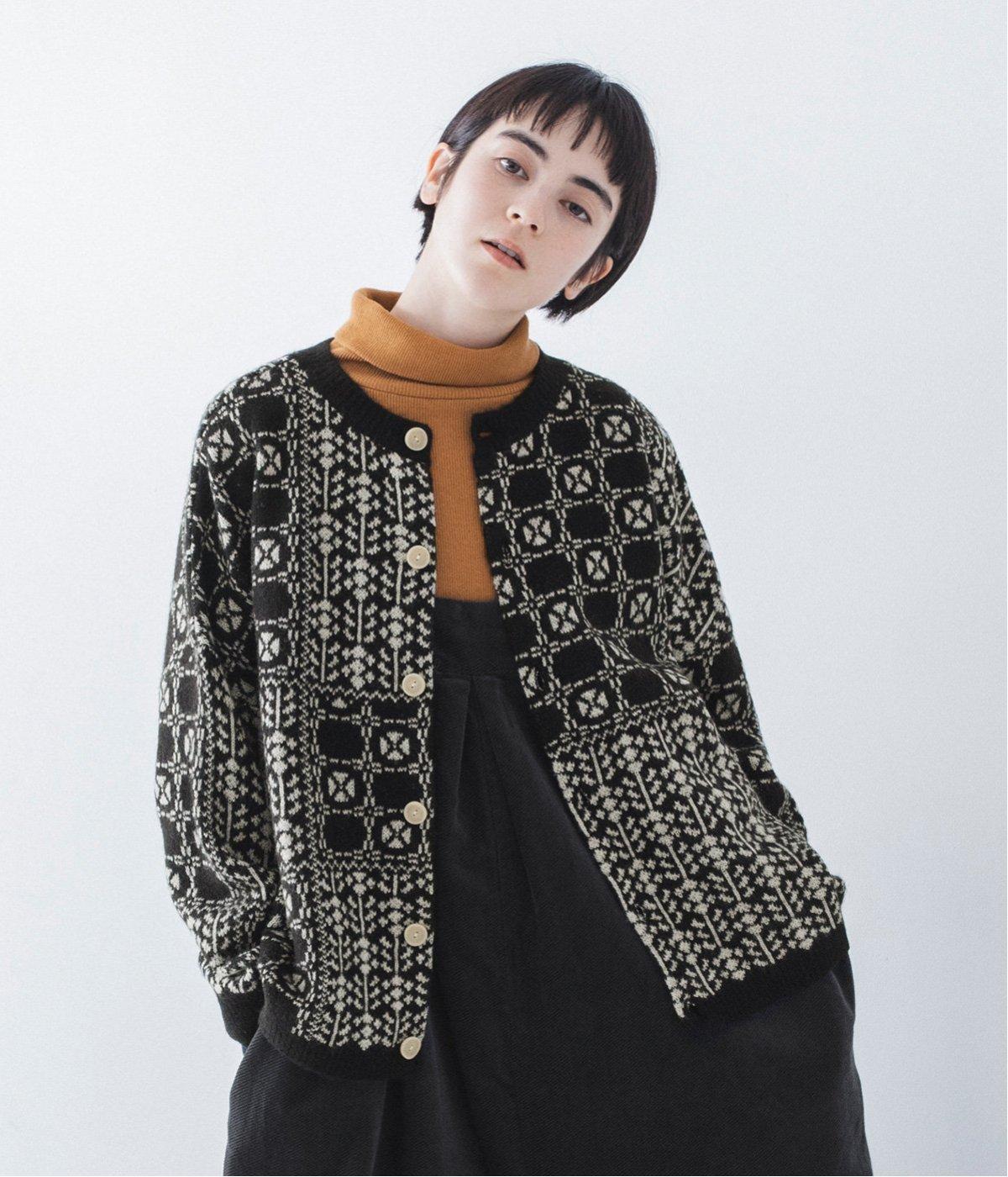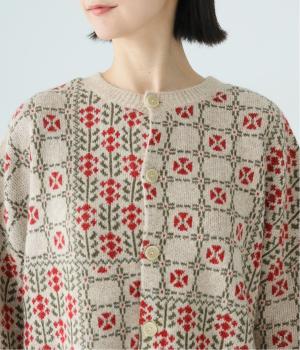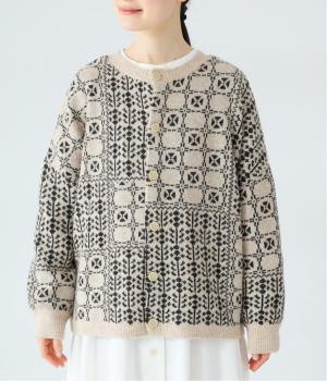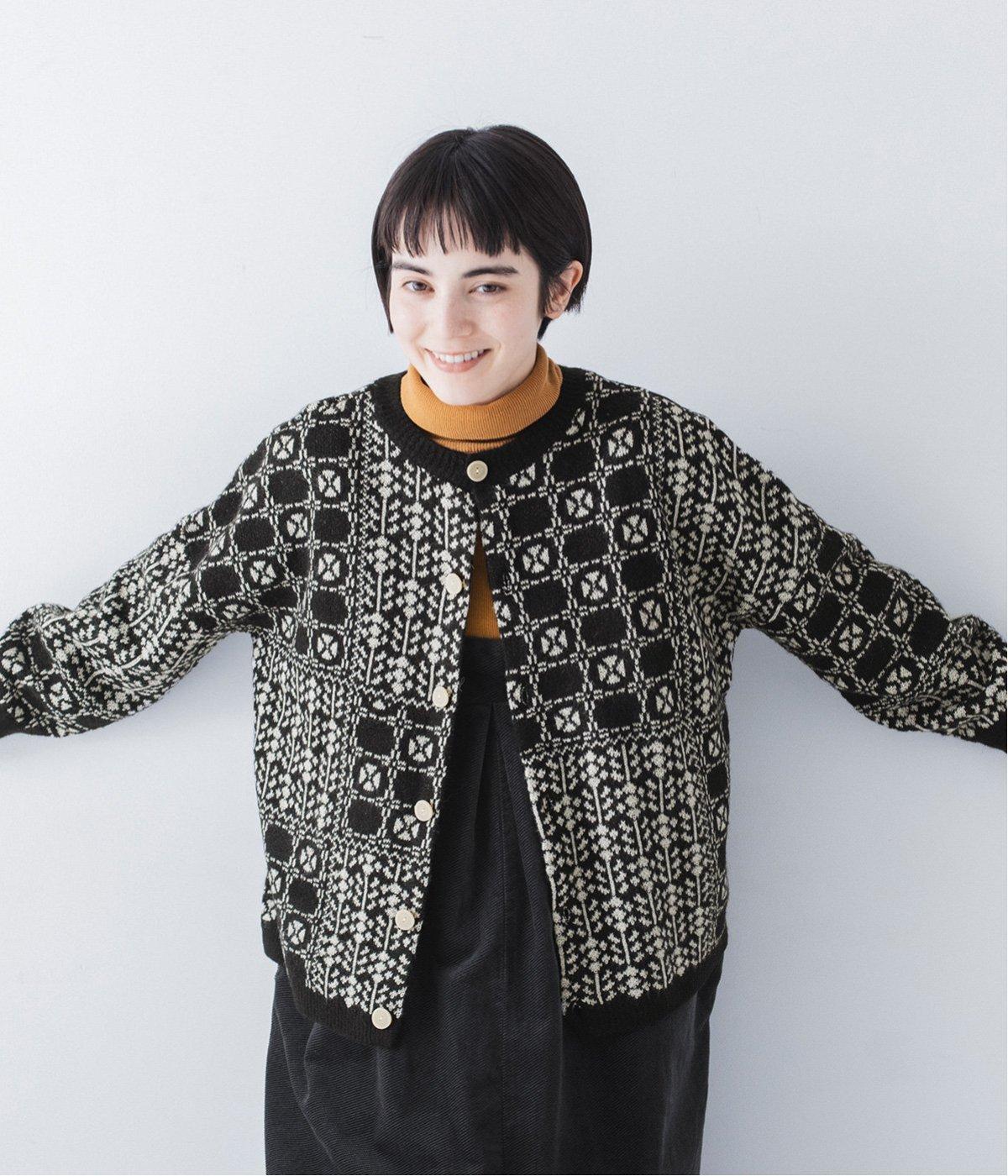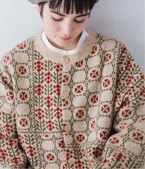 外と室内で寒暖差のあるこれからの時季、脱ぎ着しやすいカーディガンは必携のアイテム。ほっとするようなぬくもりを感じる柄が、ニットの風合いとやわらかく溶け込みます。