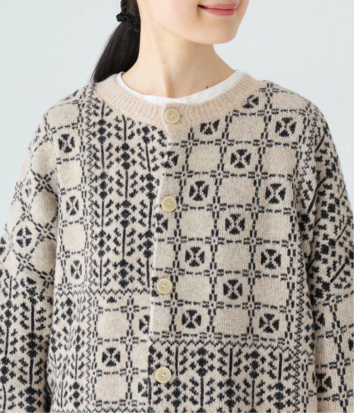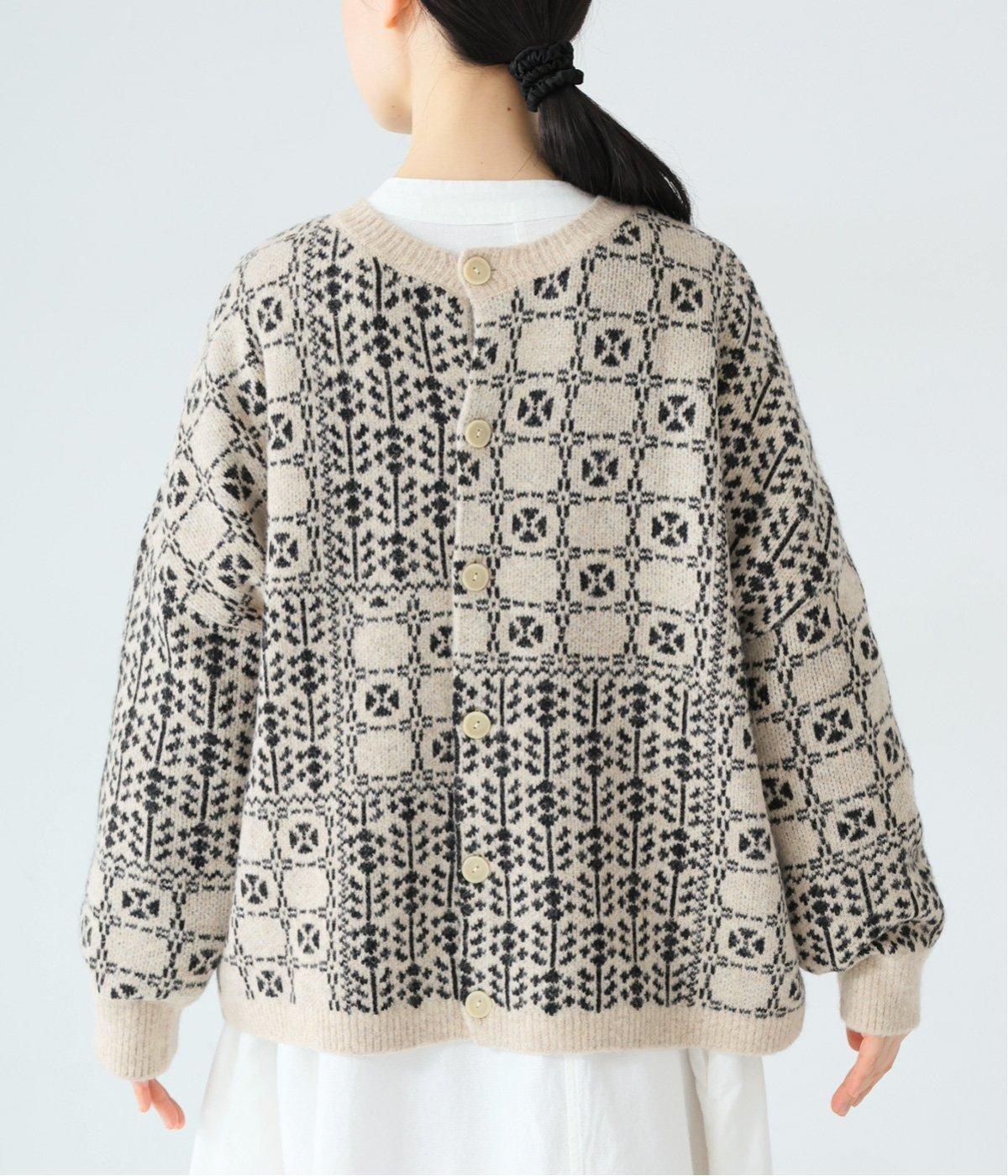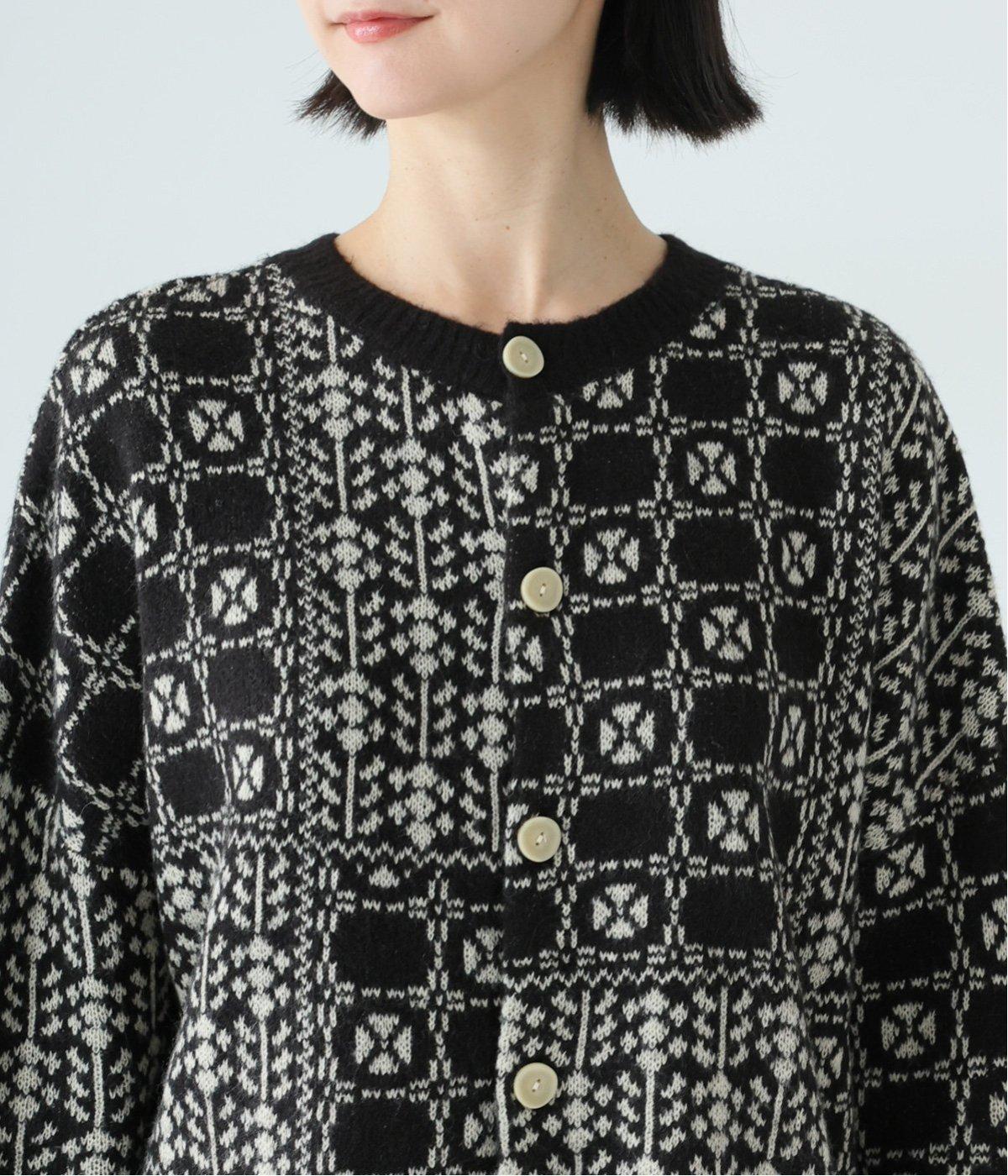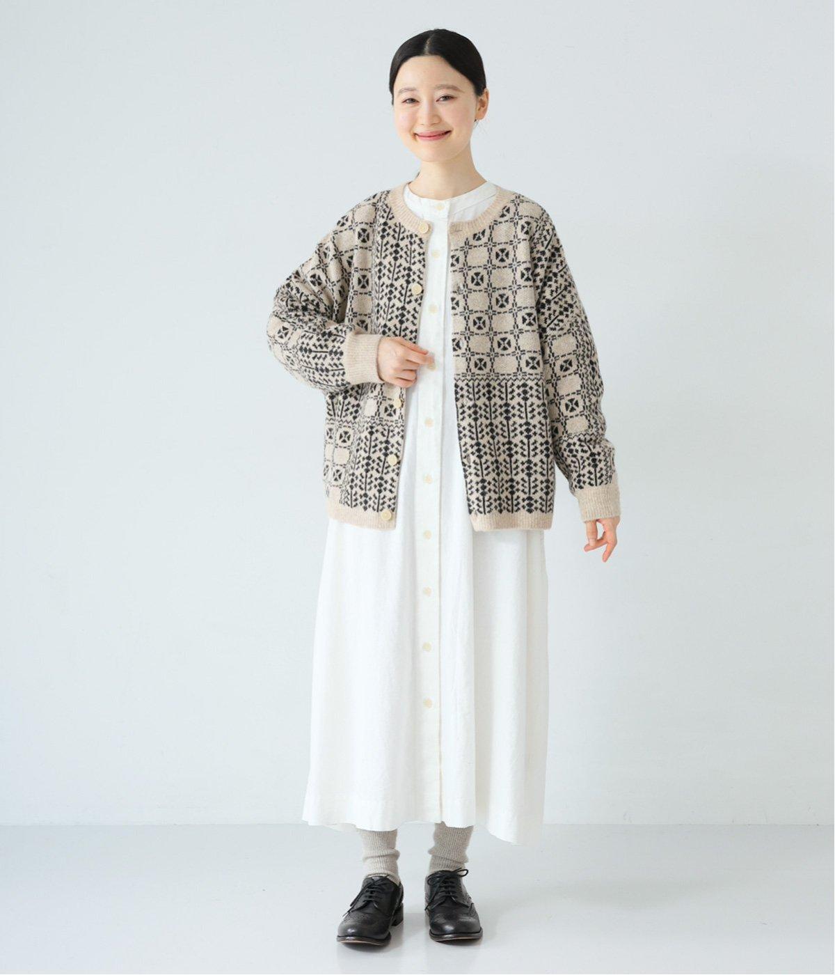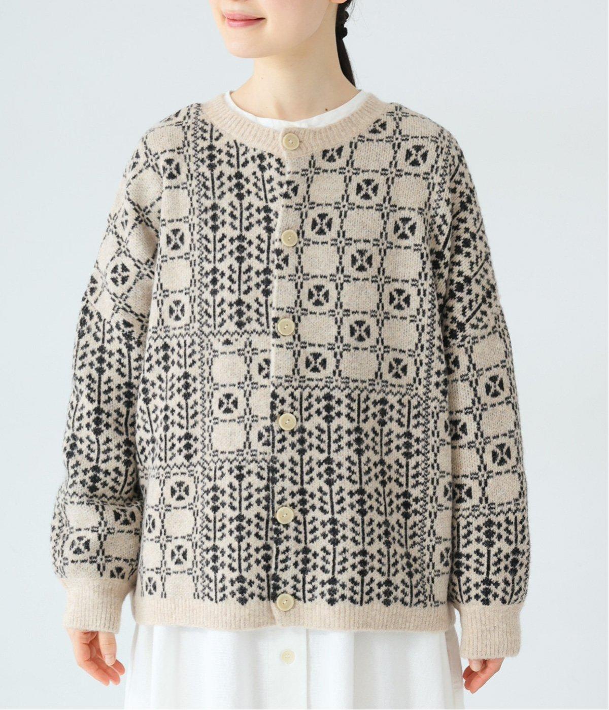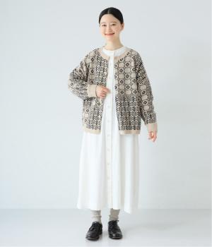 外と室内で寒暖差のあるこれからの時季、脱ぎ着しやすいカーディガンは必携のアイテム。ほっとするようなぬくもりを感じる柄が、ニットの風合いとやわらかく溶け込みます。