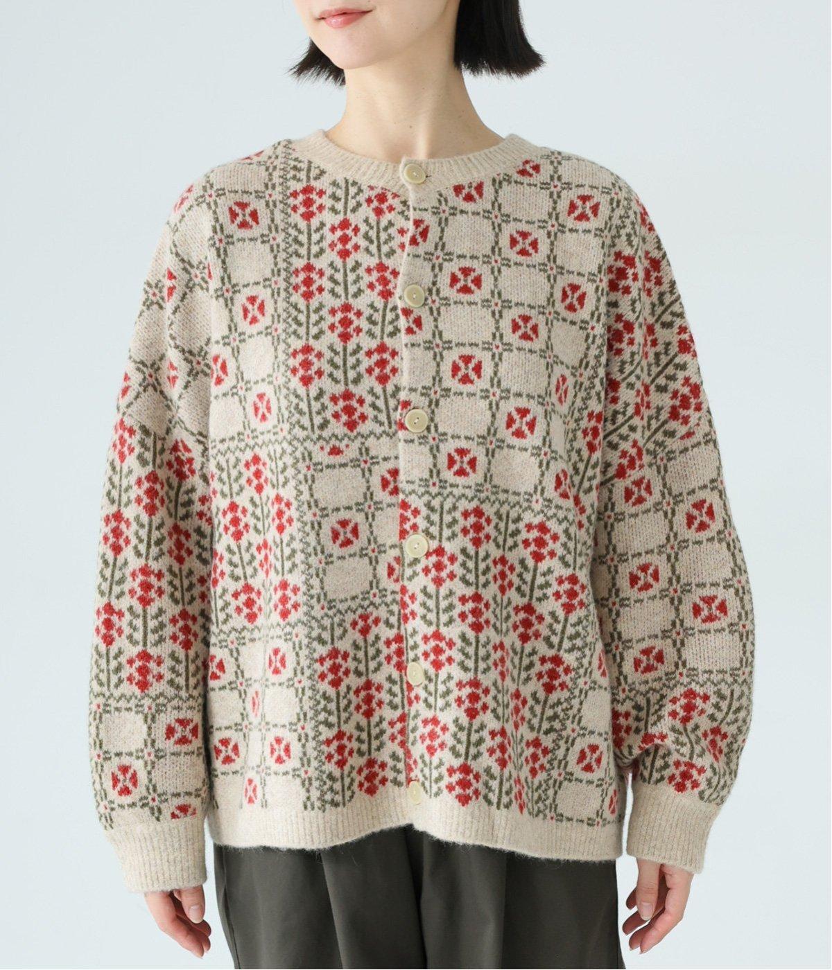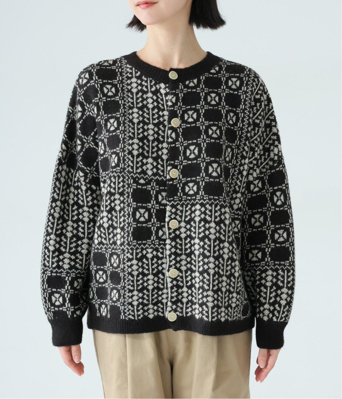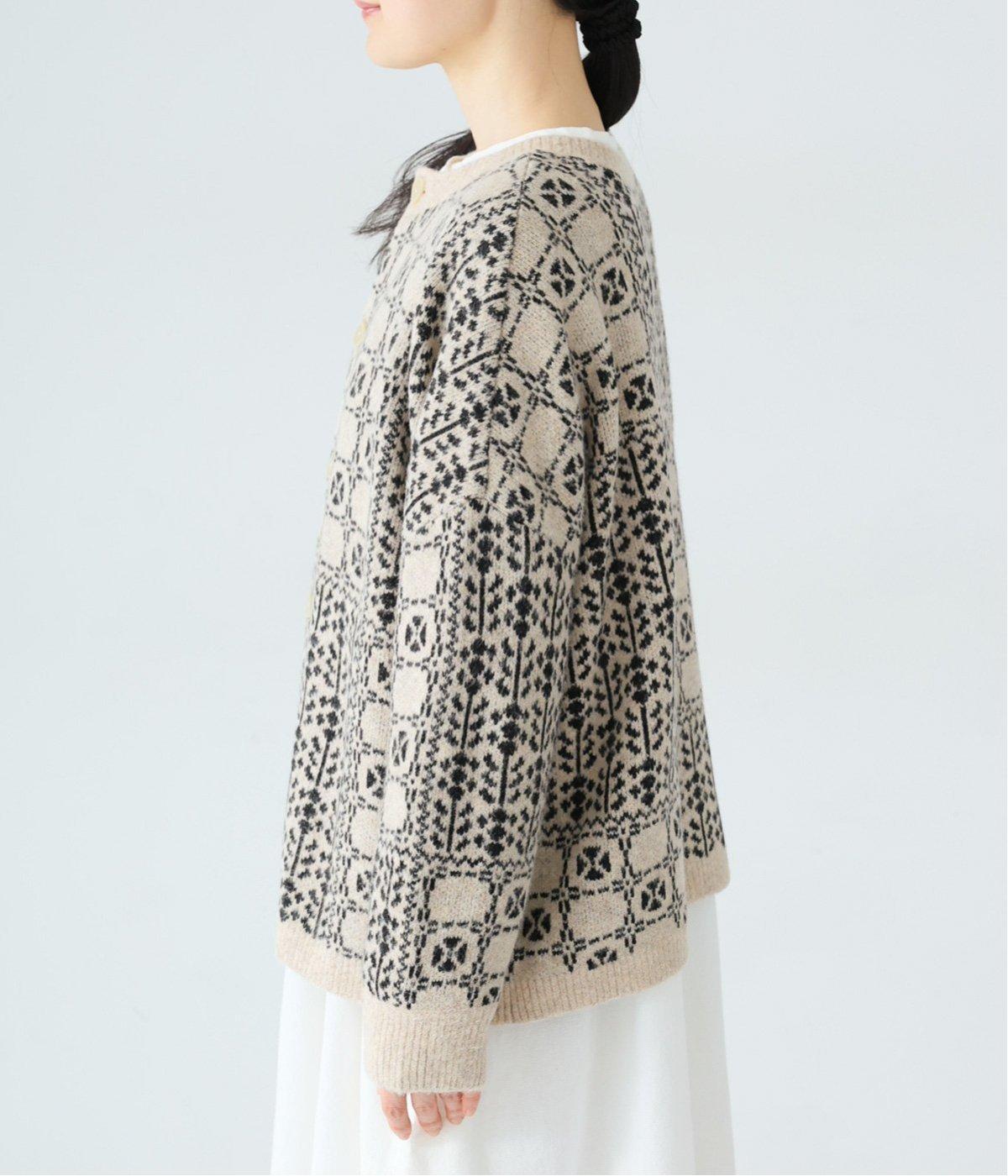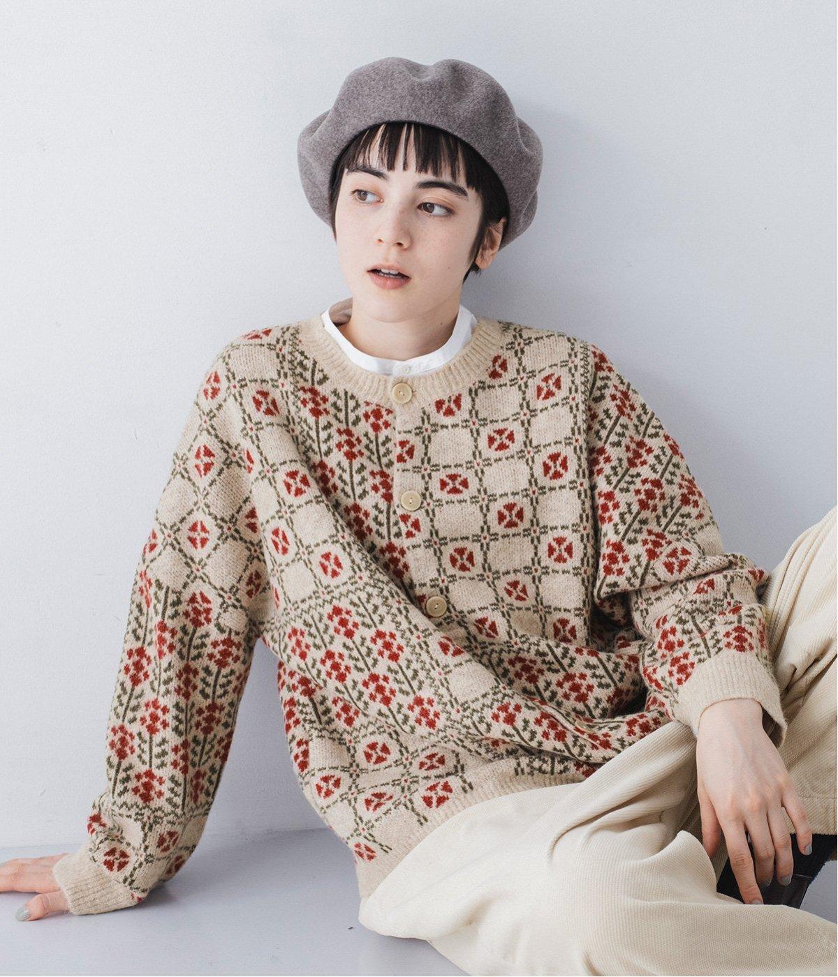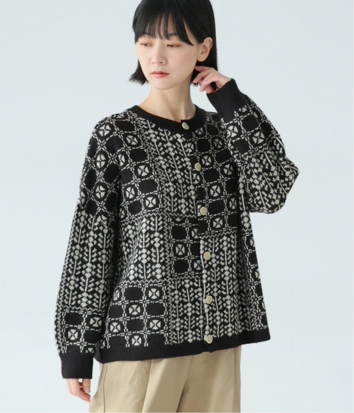 外と室内で寒暖差のあるこれからの時季、脱ぎ着しやすいカーディガンは必携のアイテム。ほっとするようなぬくもりを感じる柄が、ニットの風合いとやわらかく溶け込みます。