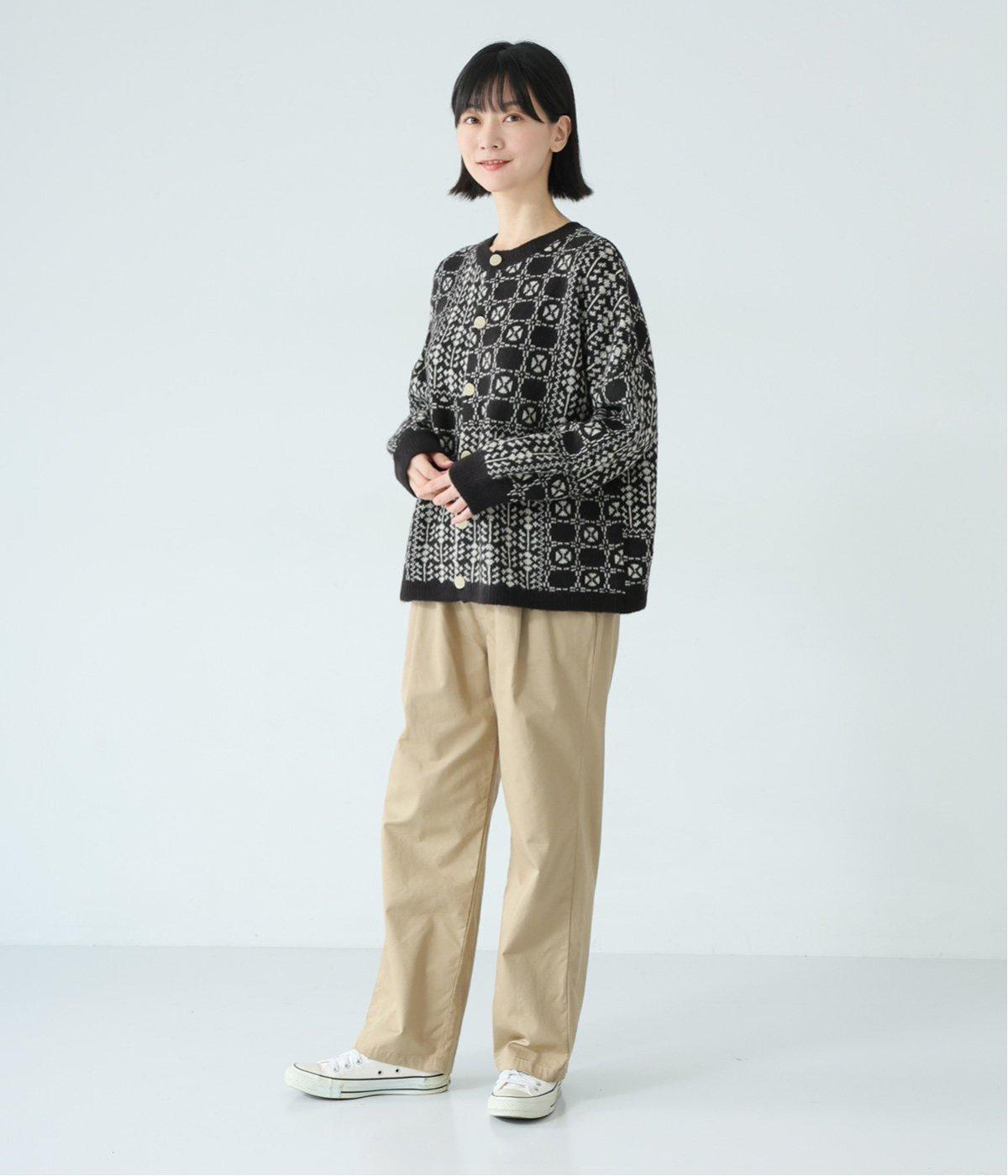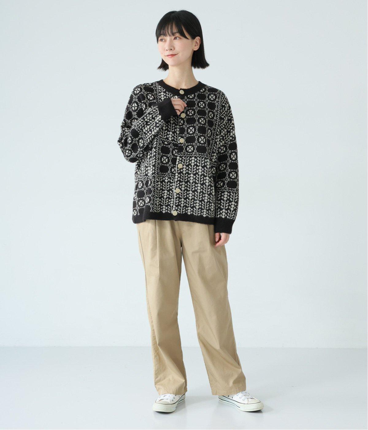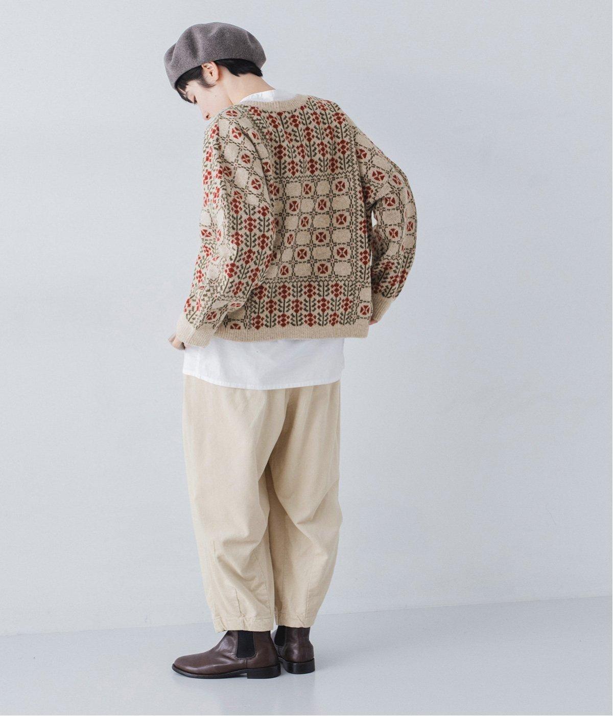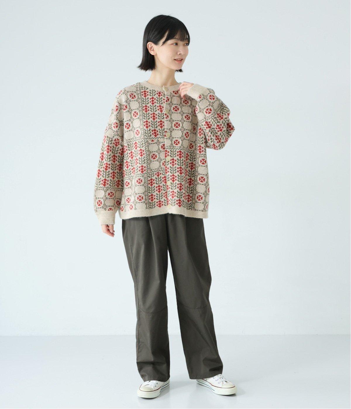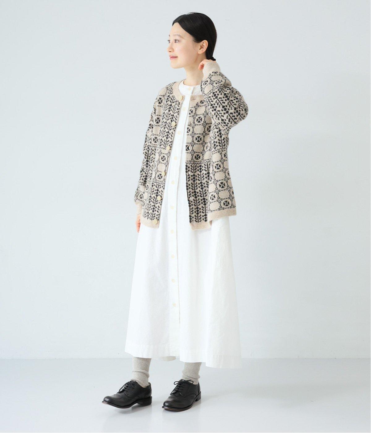 外と室内で寒暖差のあるこれからの時季、脱ぎ着しやすいカーディガンは必携のアイテム。ほっとするようなぬくもりを感じる柄が、ニットの風合いとやわらかく溶け込みます。