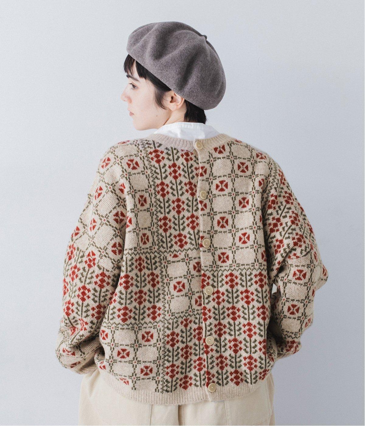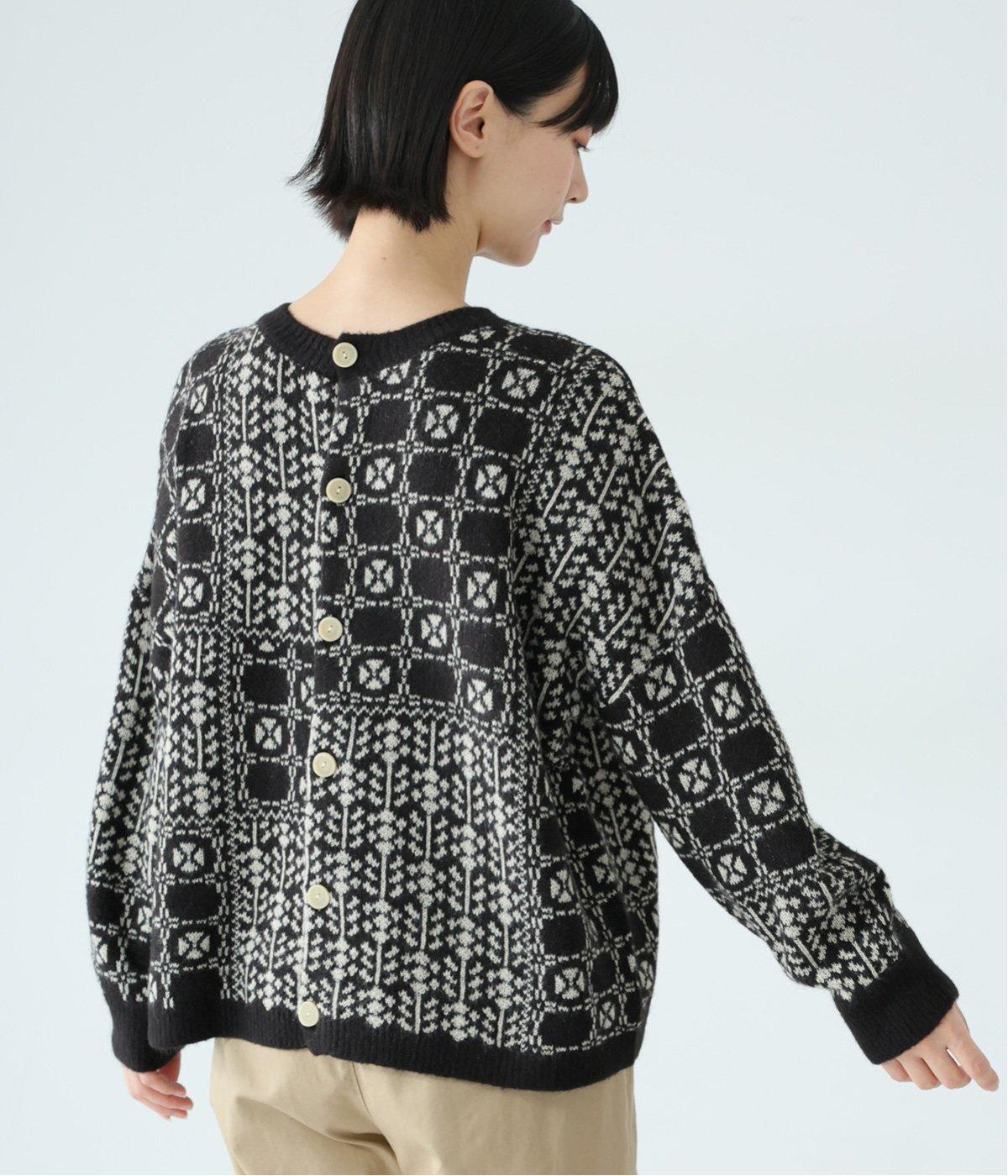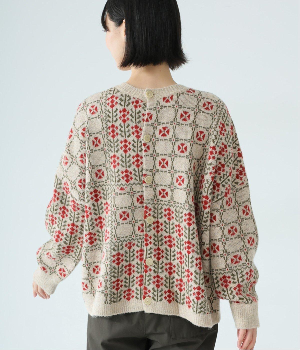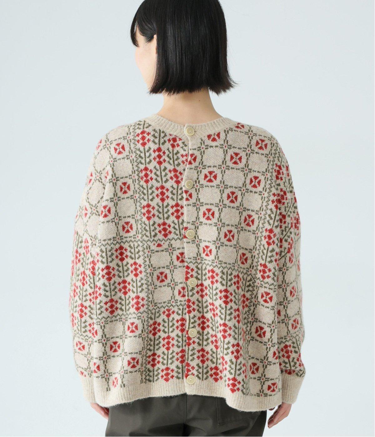 2種の花模様を組み合わせたパッチワーク柄が、甘すぎない大人の可愛らしさを添える一着。前ボタンでカーディガン、後ろボタンでプルオーバーとして楽しめる、着こなしが広がるデザインです。