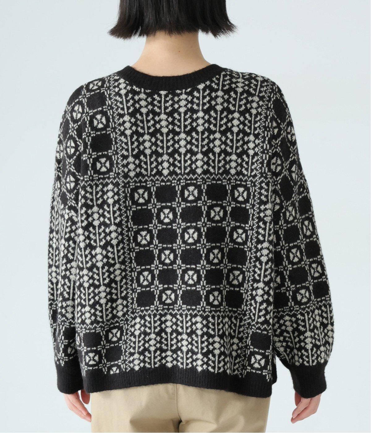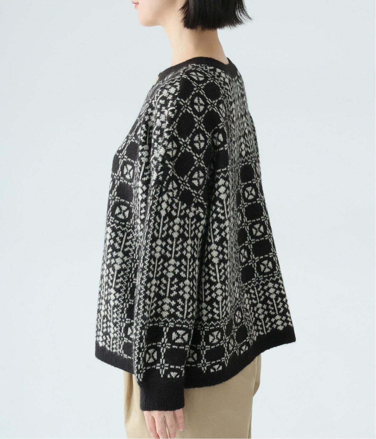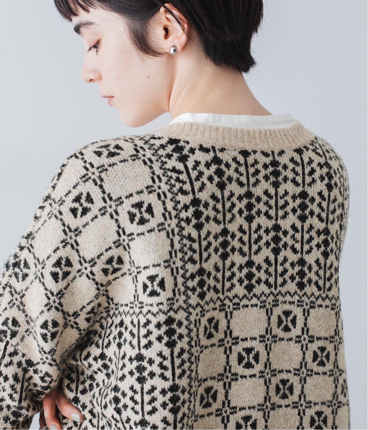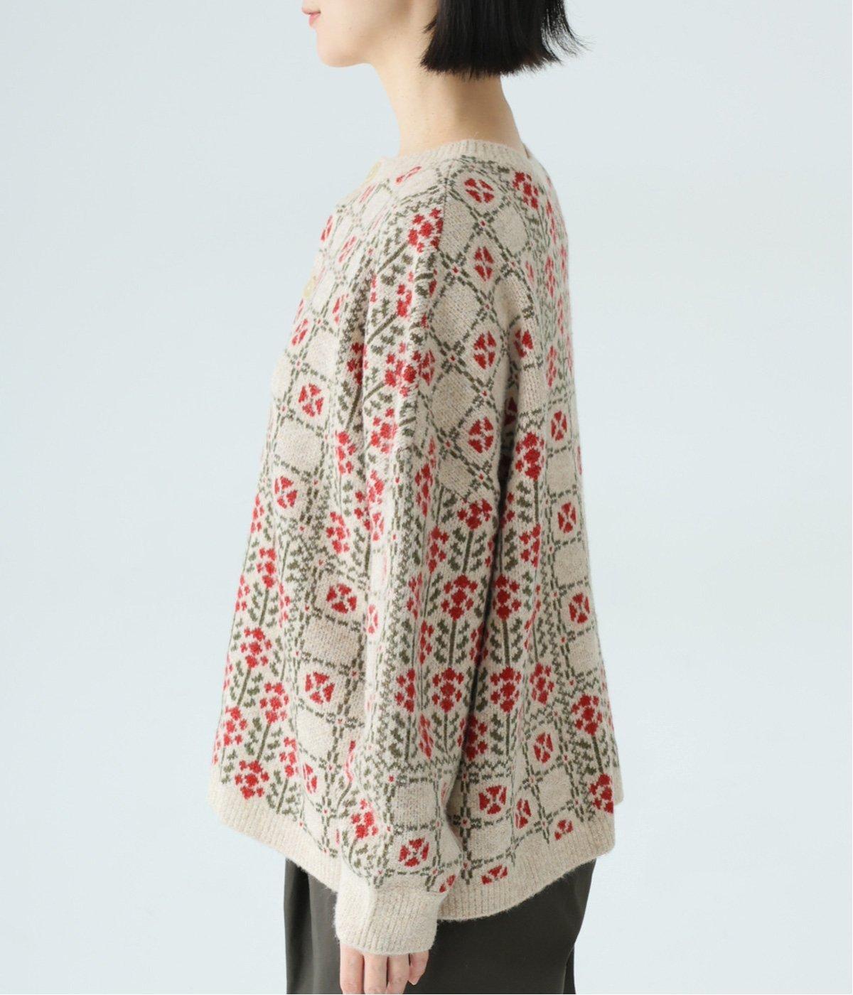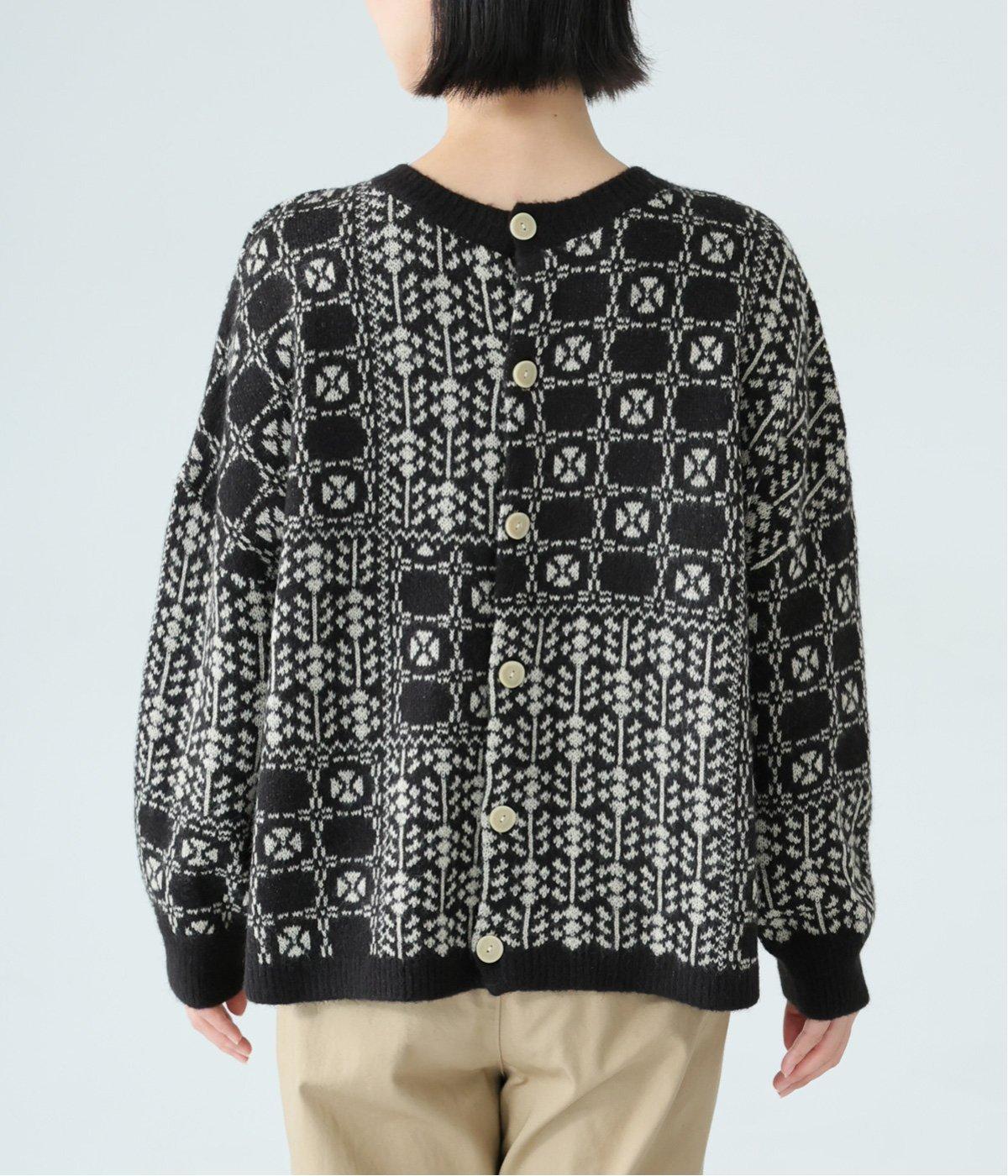 2種の花模様を組み合わせたパッチワーク柄が、甘すぎない大人の可愛らしさを添える一着。前ボタンでカーディガン、後ろボタンでプルオーバーとして楽しめる、着こなしが広がるデザインです。