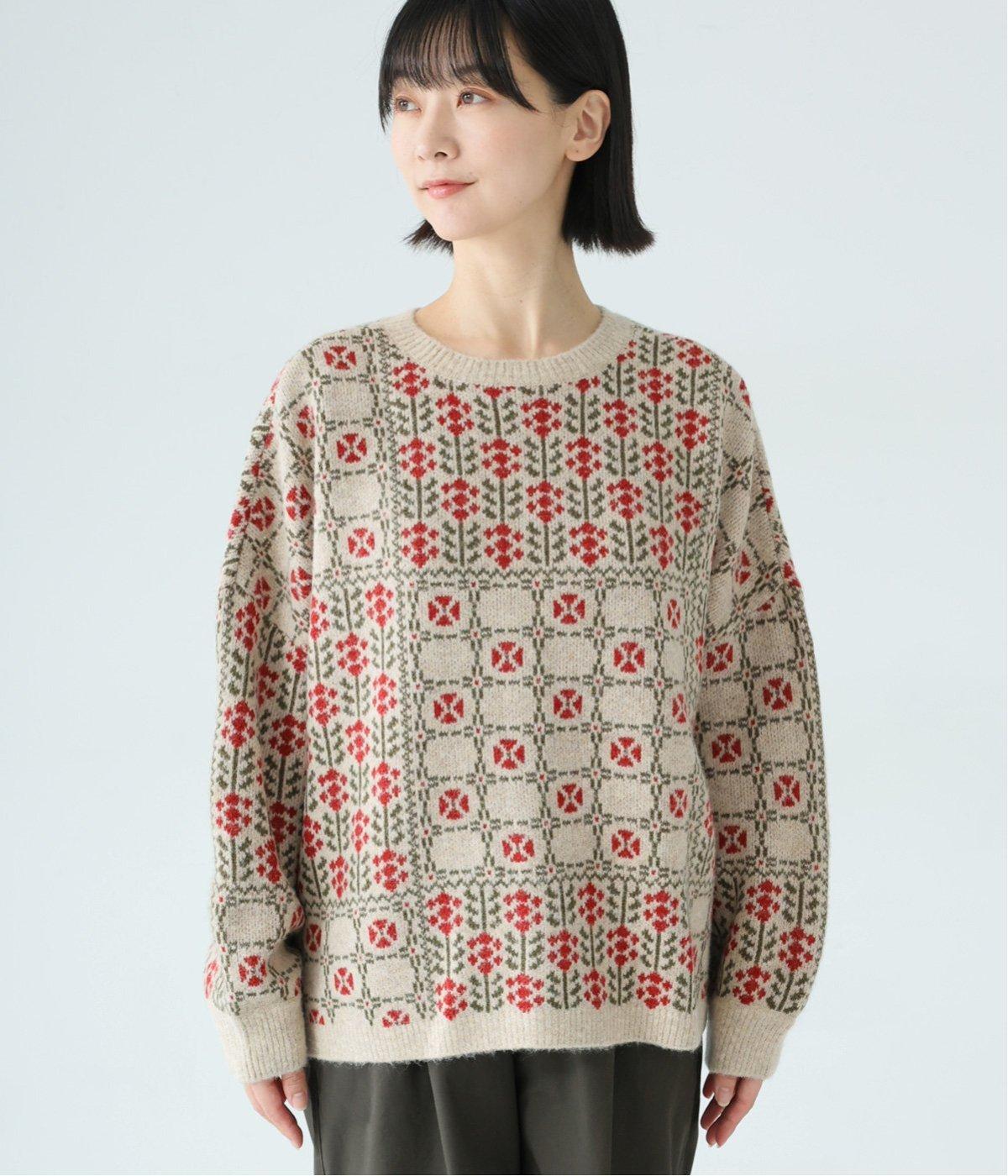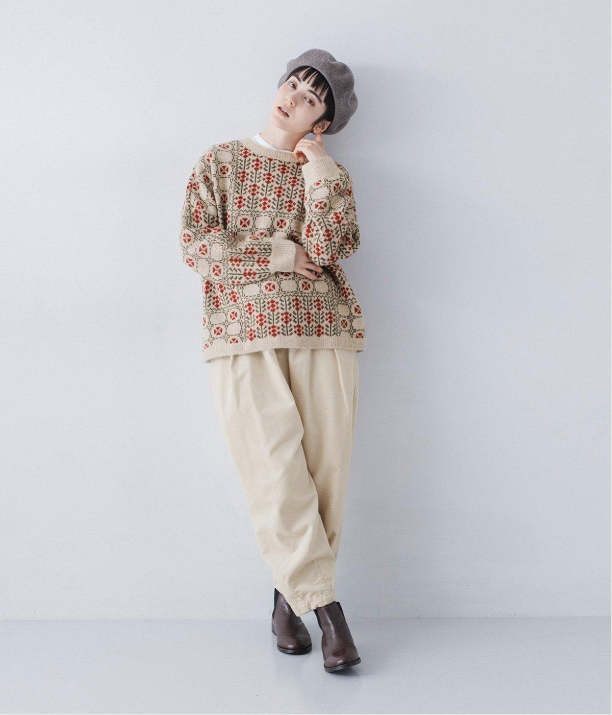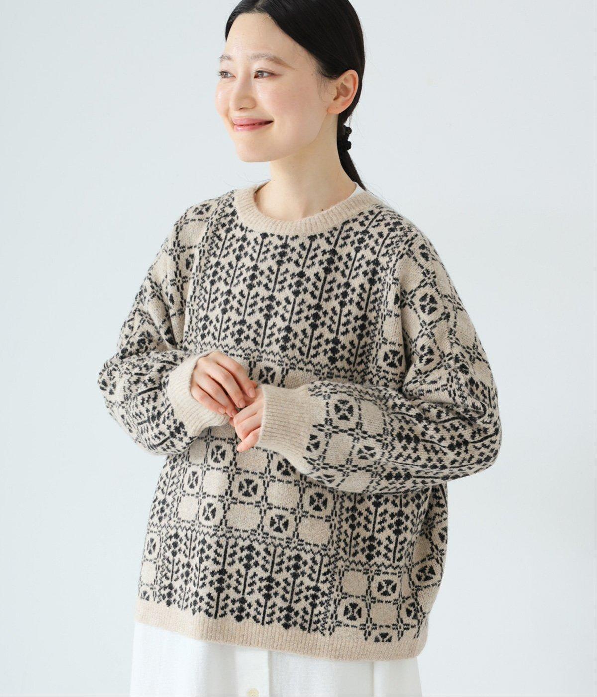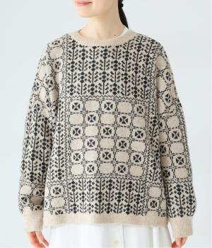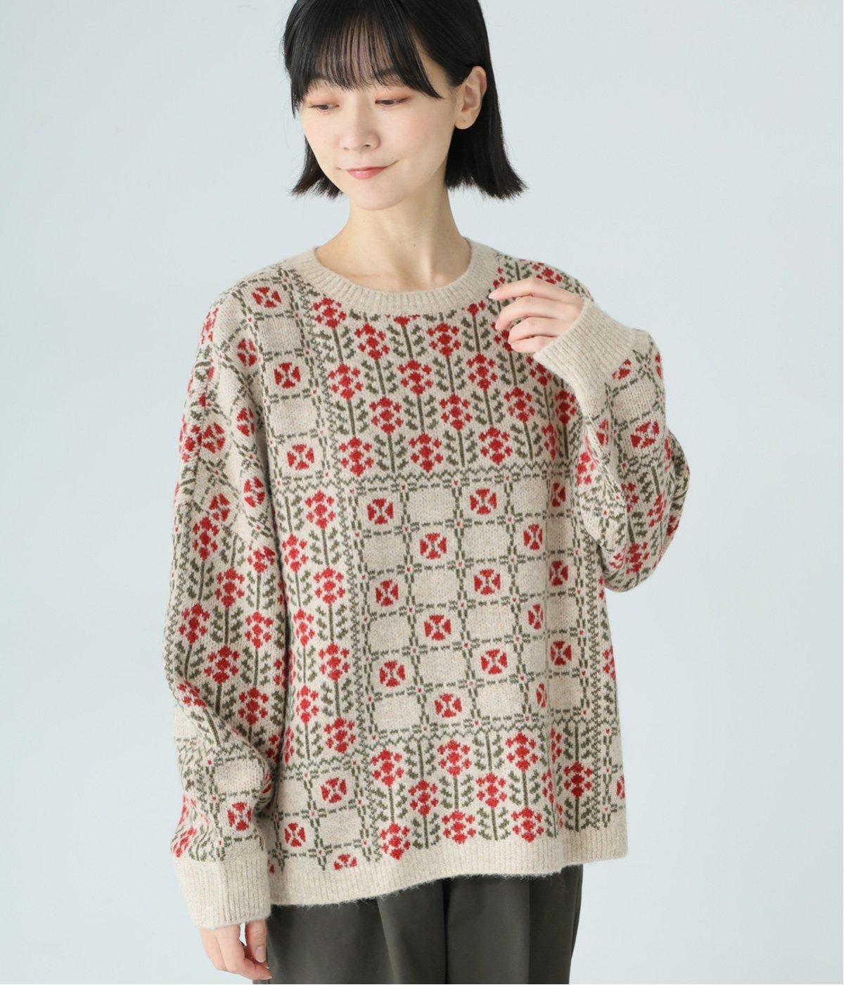 どこか懐かしさをまとった北欧タッチの総柄が、心を弾ませます。いつもの着こなしに加えるだけで、冬の装いをとっておきの印象に仕上げてくれる一着です。