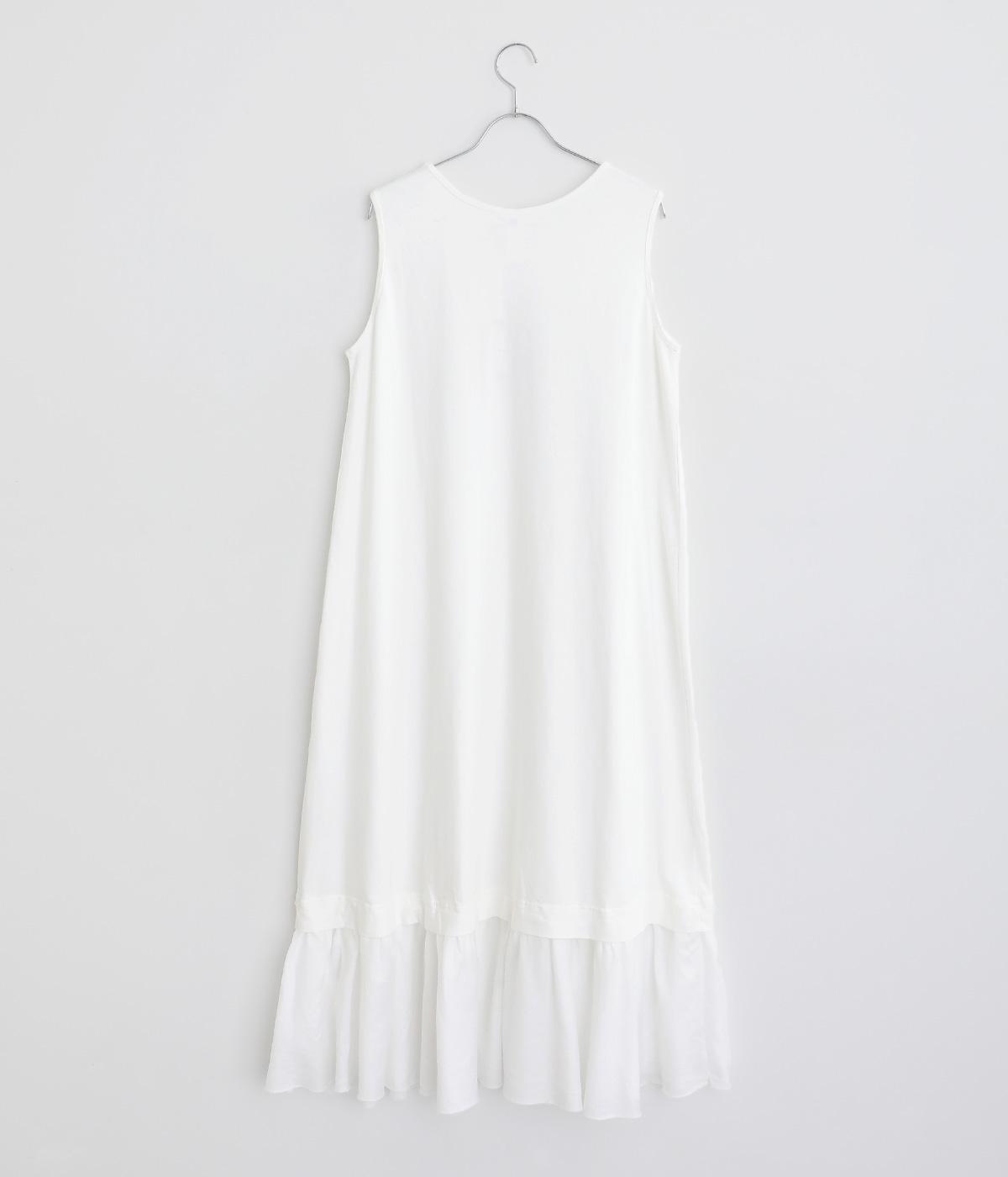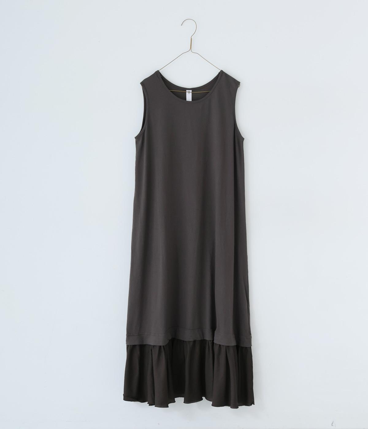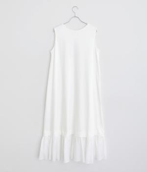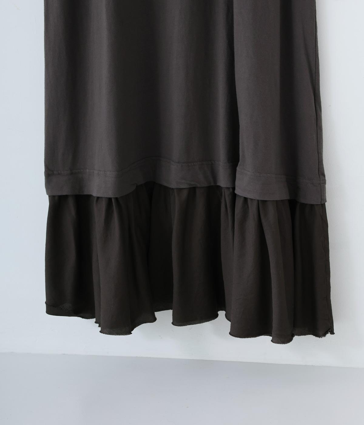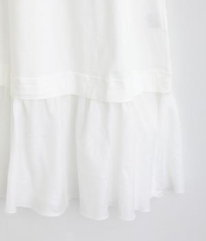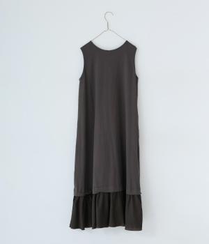 製品染めの風合いや素材ごとの色差が活きるよう、シンプルな形のワンピースに大ぶりなフリルをあしらいました。Tシャツや羽織りと合わせたメイン使いはもちろん、インナーワンピースとして裾のフリルをのぞかせた着まわしも◎。
