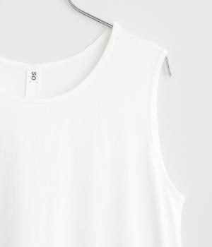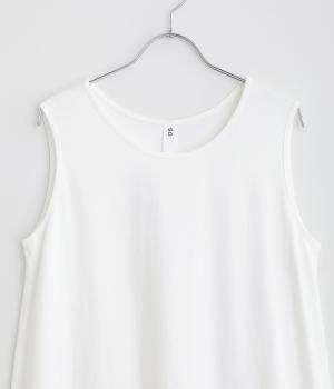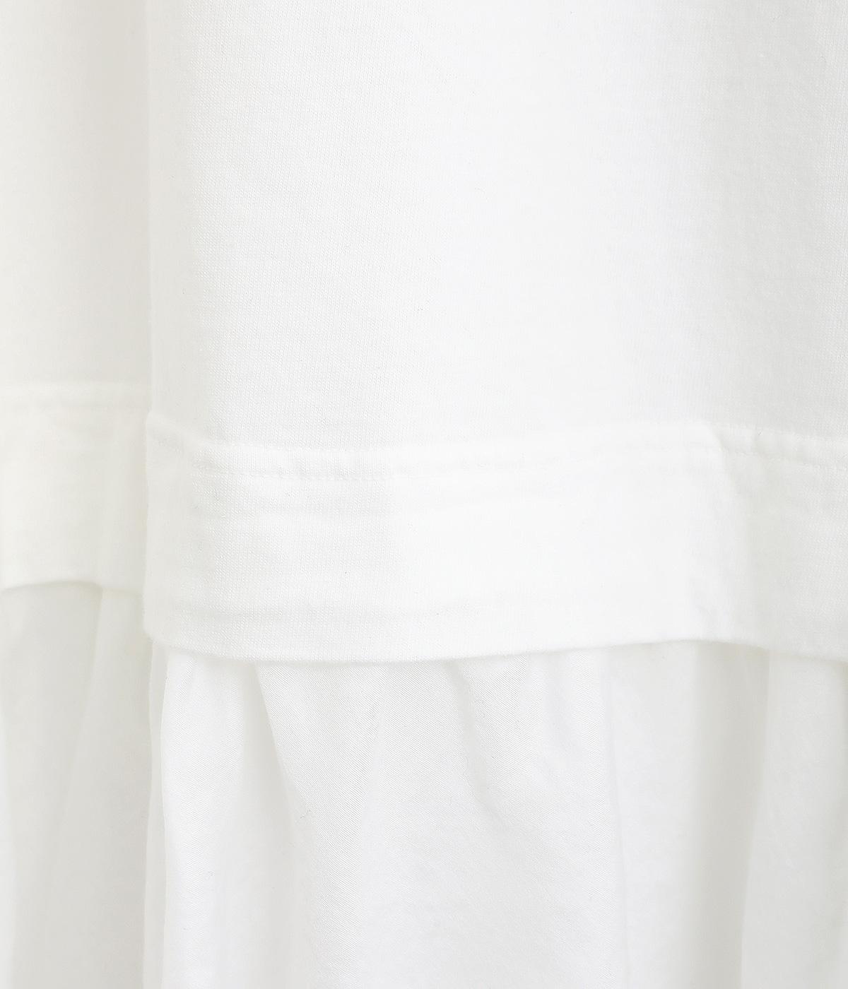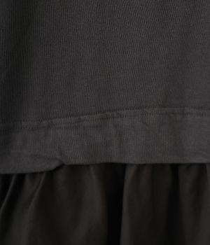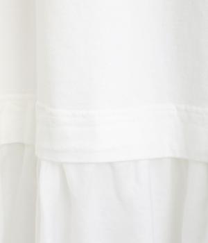 さらりとしたドライタッチなコットンカットソー生地をメインに使用し、肌あたりのよいラフな着用感にこだわっています。フリル部分には薄手のやわらかなコットン布帛生地を使用しました。