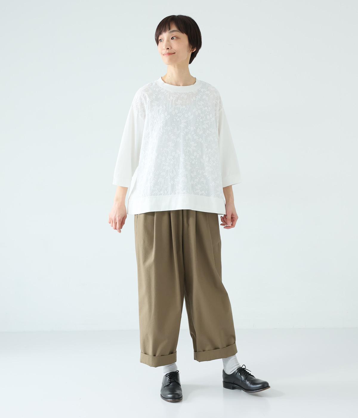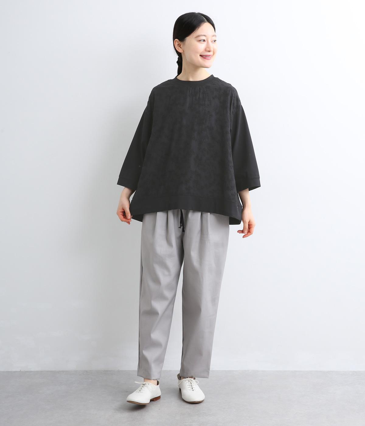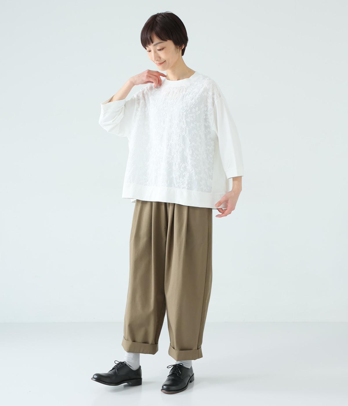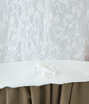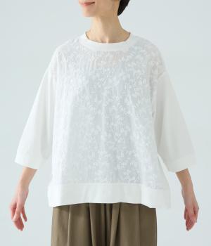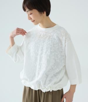 やわらかなコットン生地と繊細なレース柄を切り替えて軽やかな風合いに仕上げました。肌なじみがよく、ほどよい通気性で心地よく着られる、ナチュラルな素材感です。