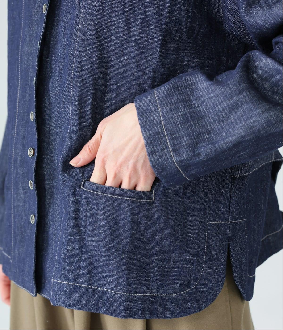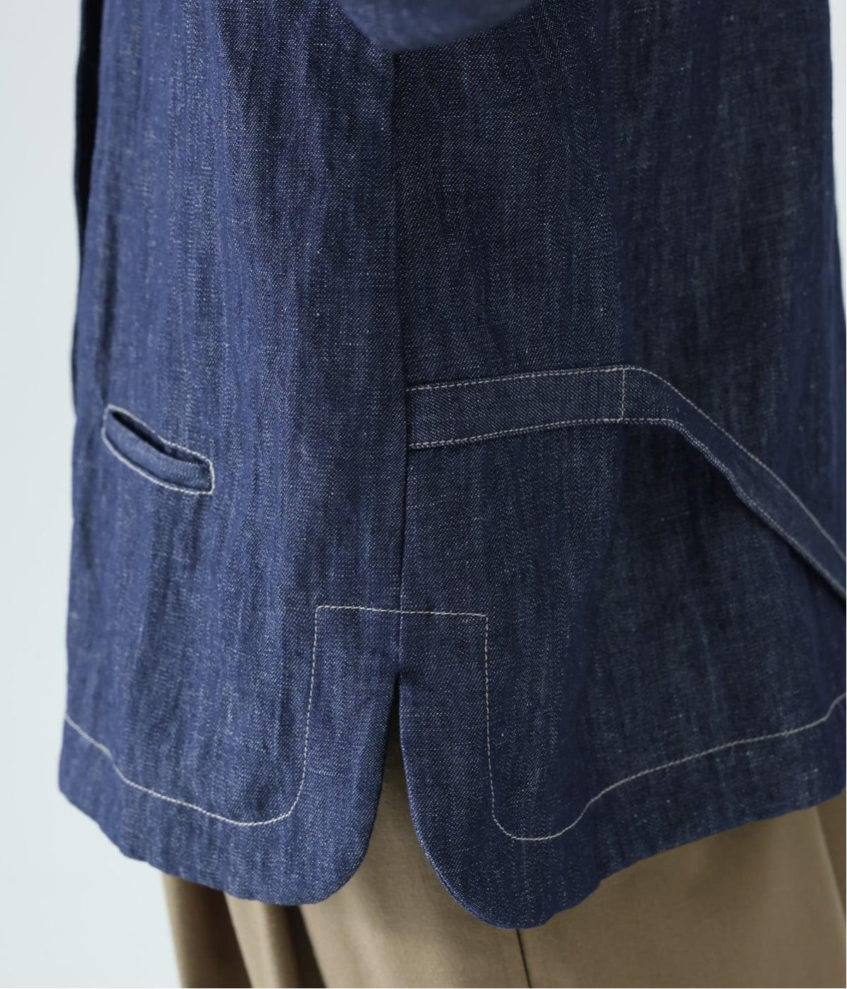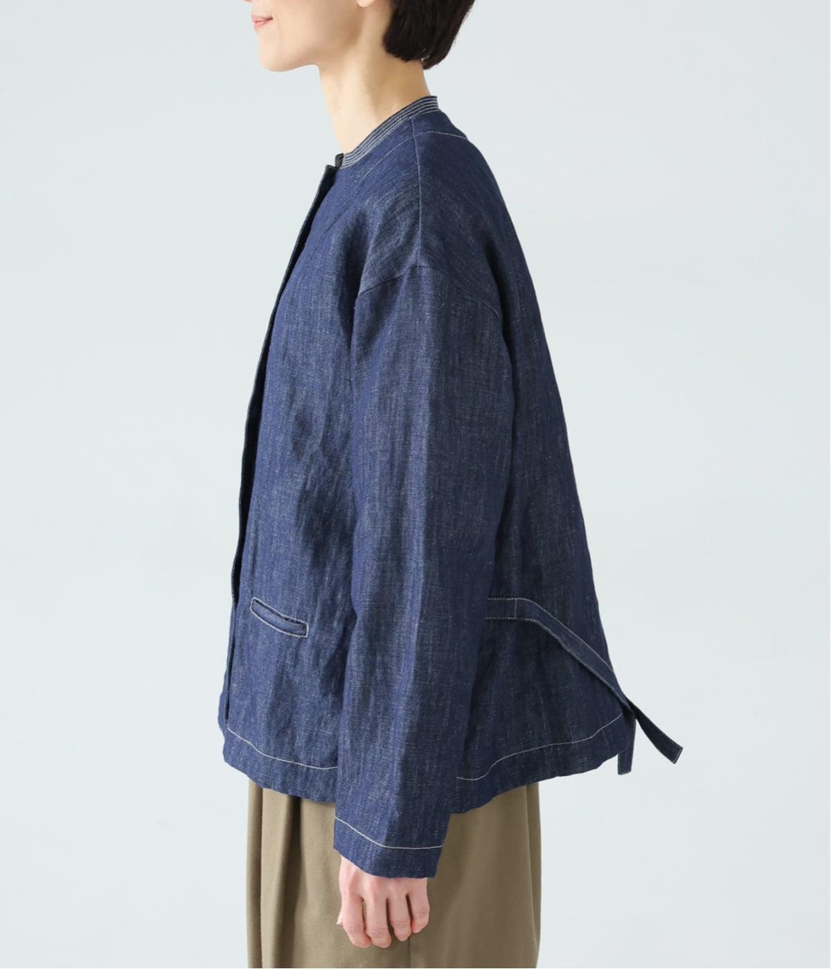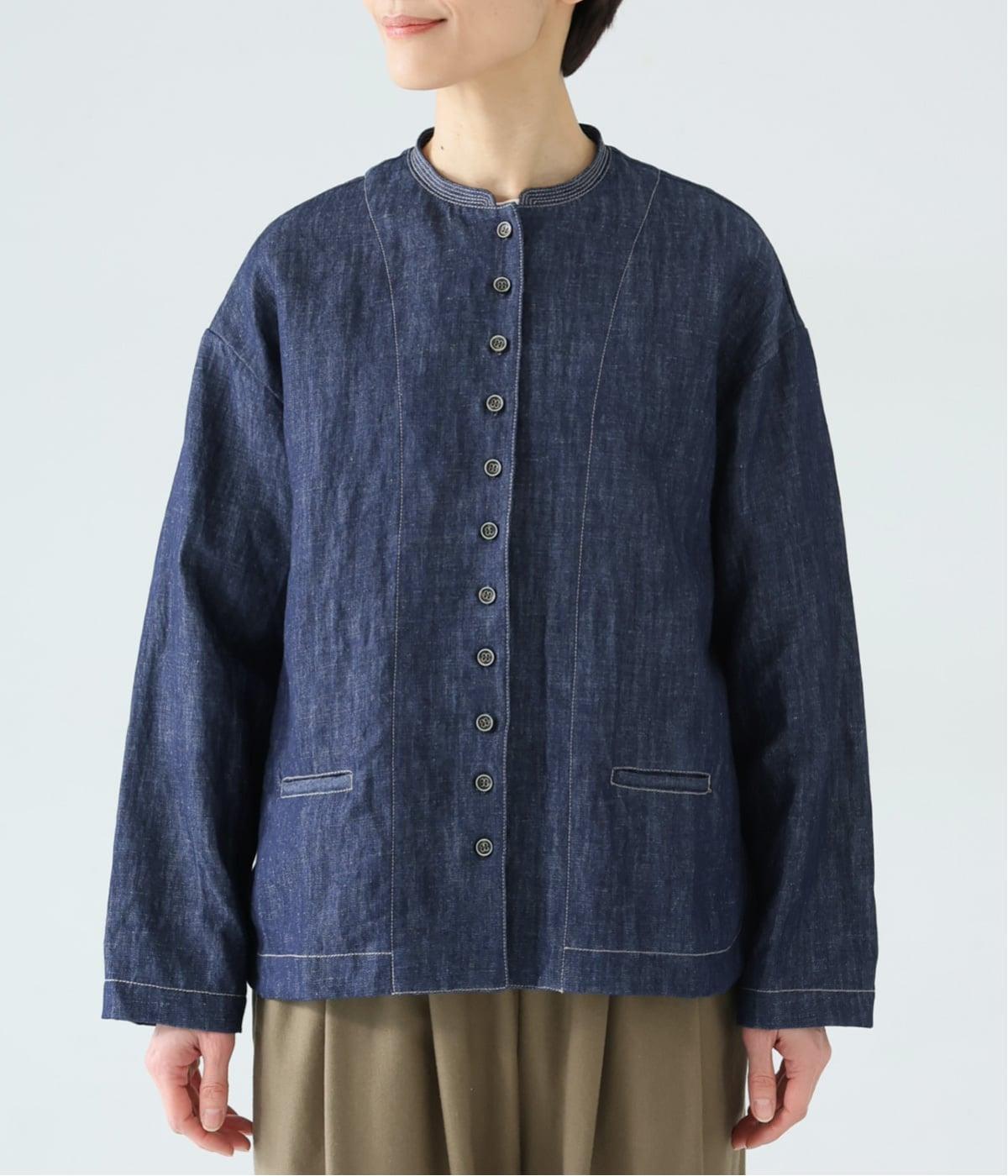 自然に馴染むグレーベージュのステッチと、ヴィンテージ調のボタンがポイント。着るほどに馴染む、コットンリネンデニムの表情を存分に楽しめるアイテムです。