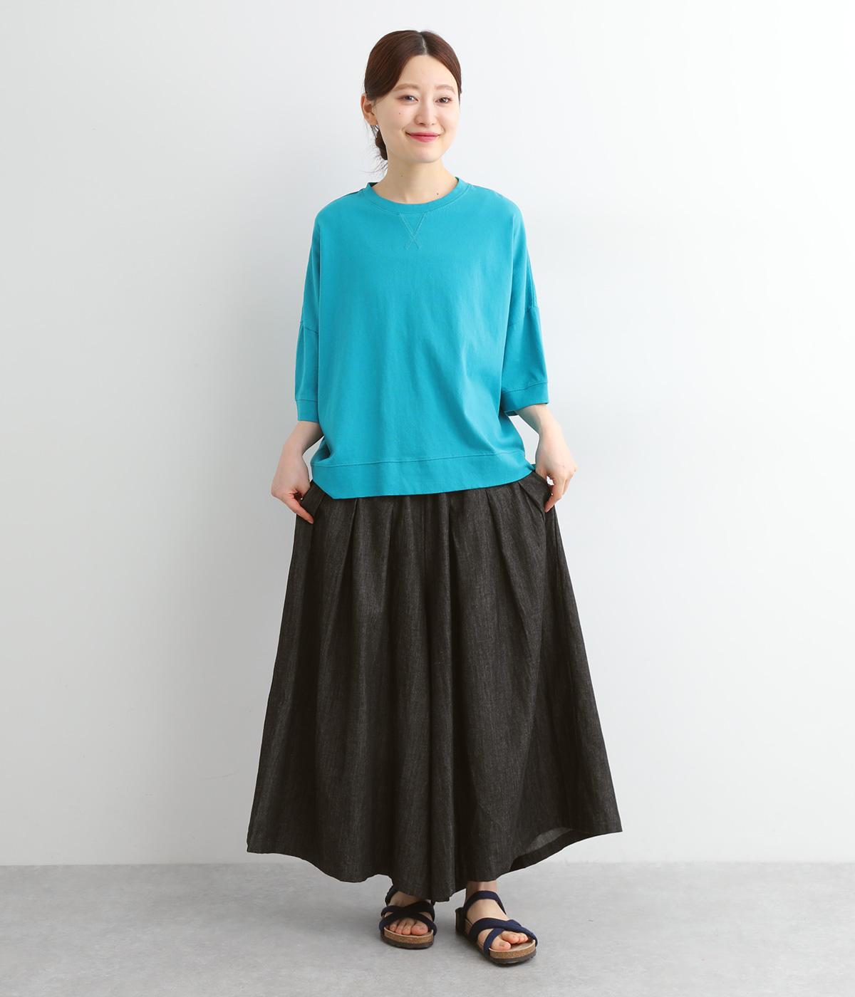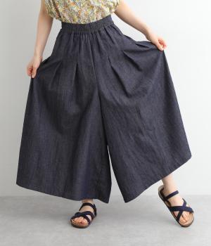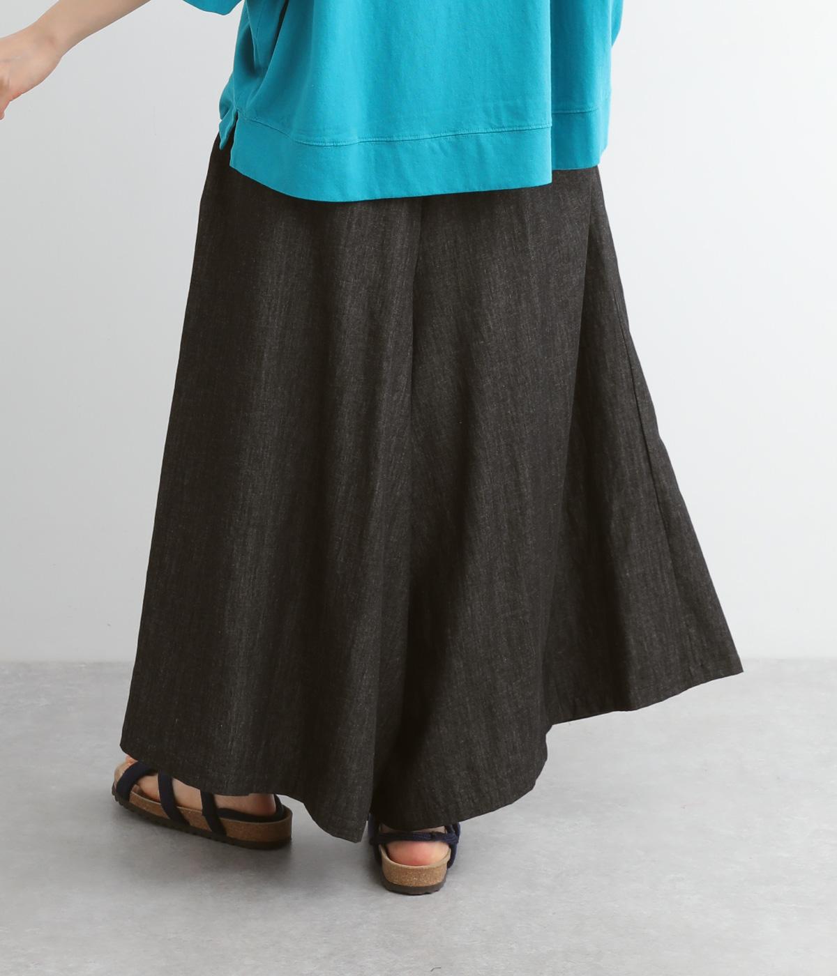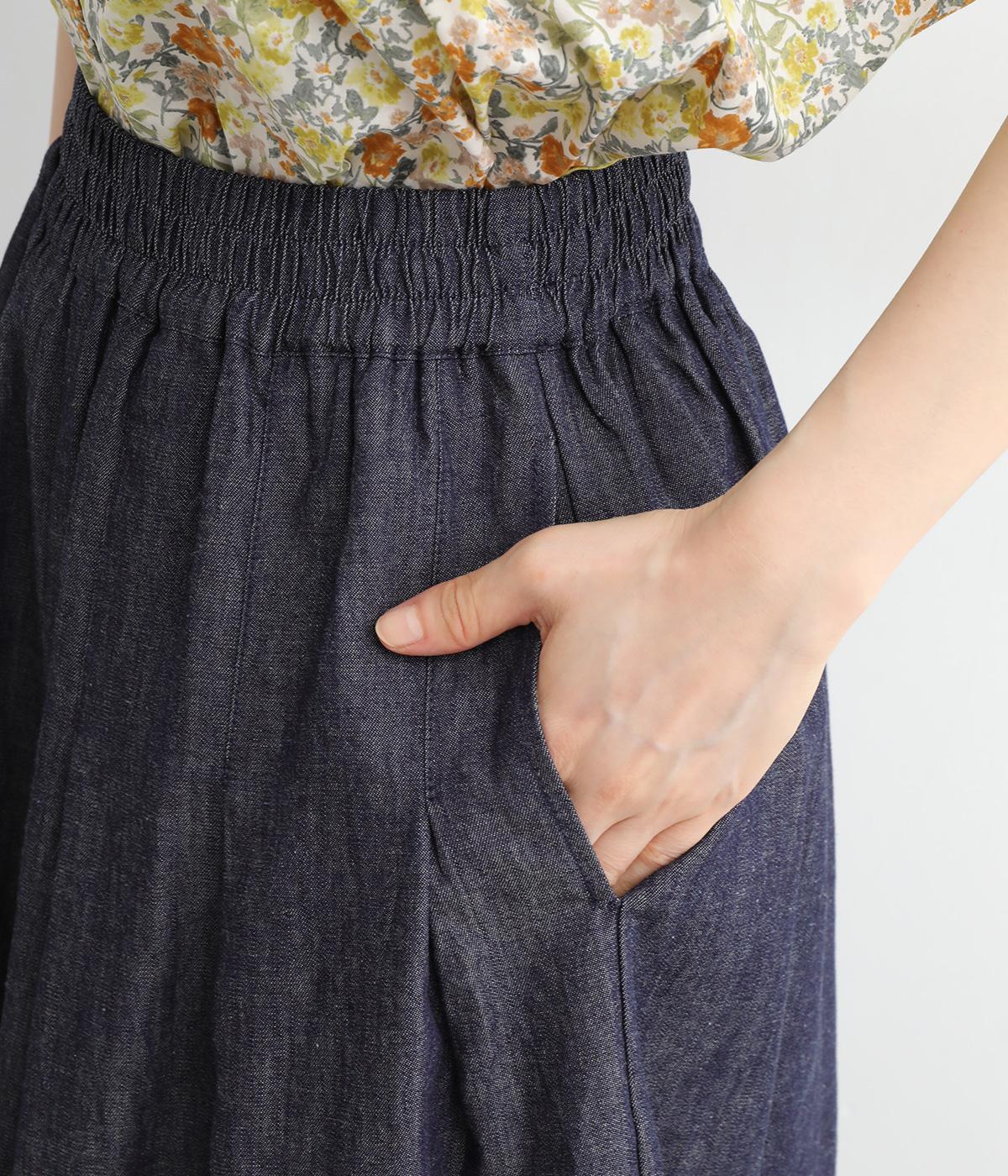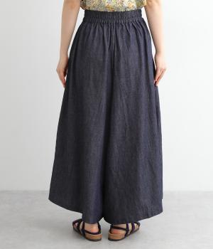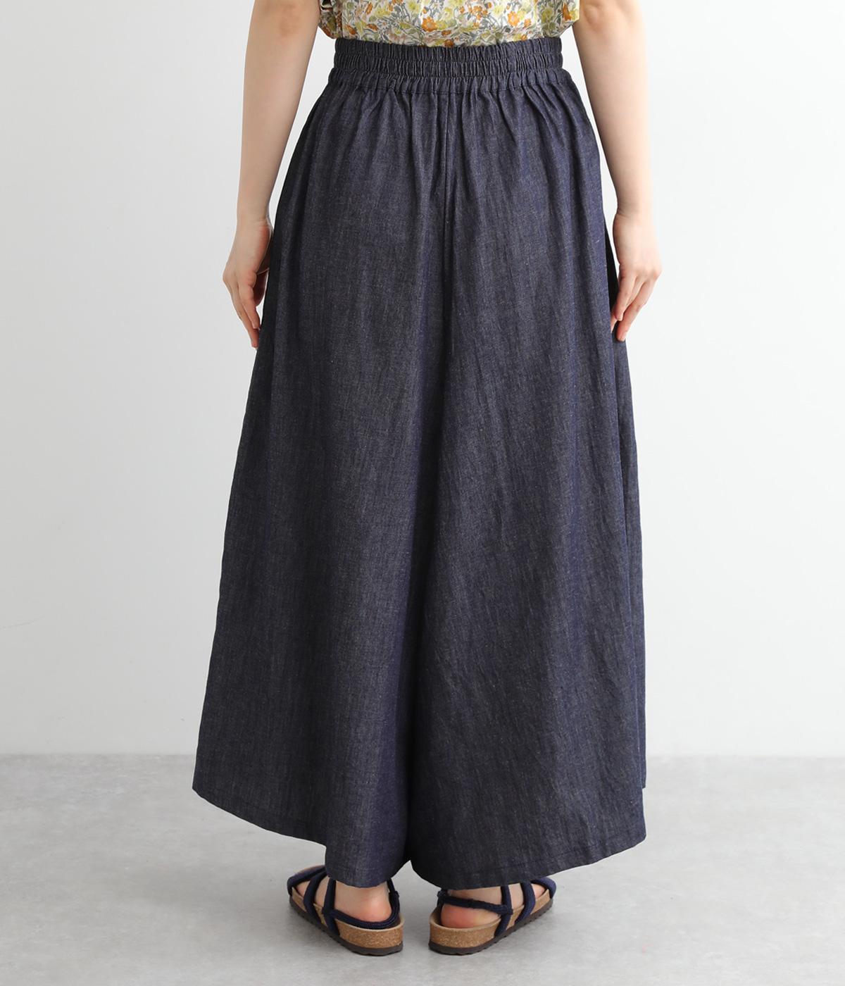 ロングスカートのようなフレア感をたのしみつつも、アクティブに活動しやすいパンツに仕立てました。タックを入れて腰まわりは広がりをおさえています。ウエストは安定感のある太めの平ゴム仕様です。