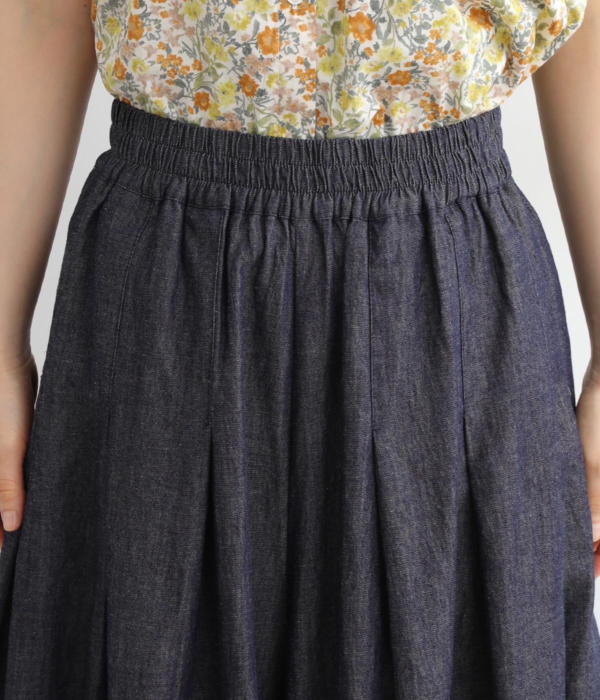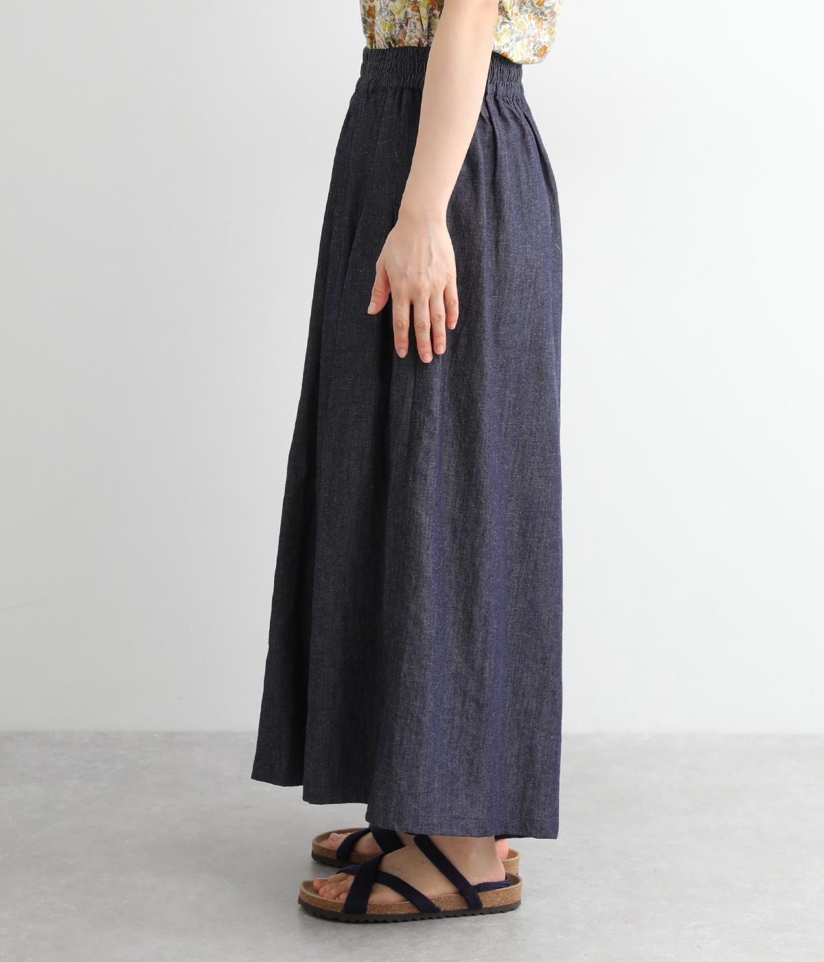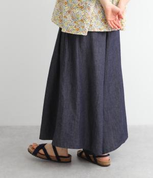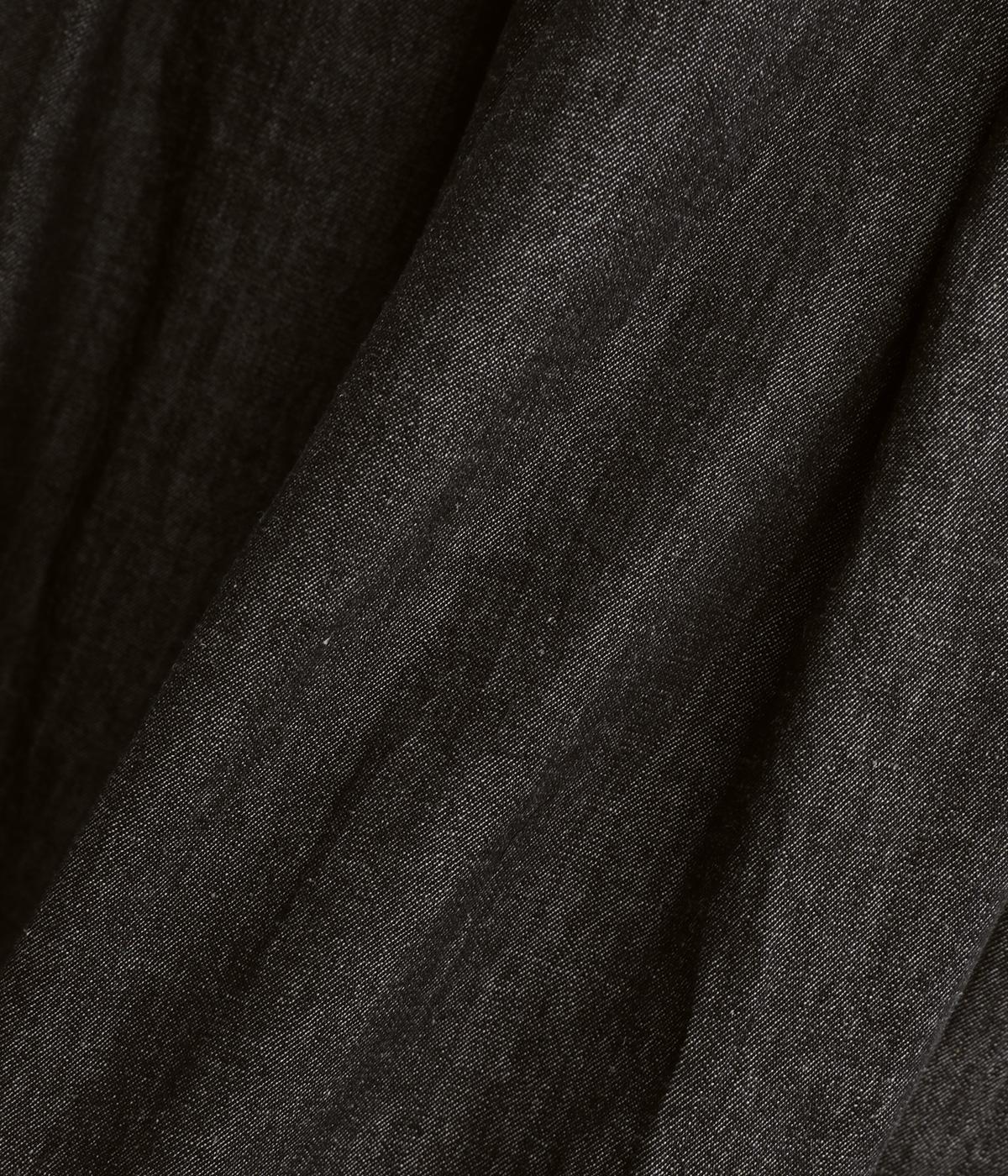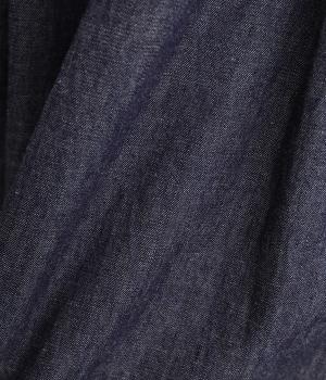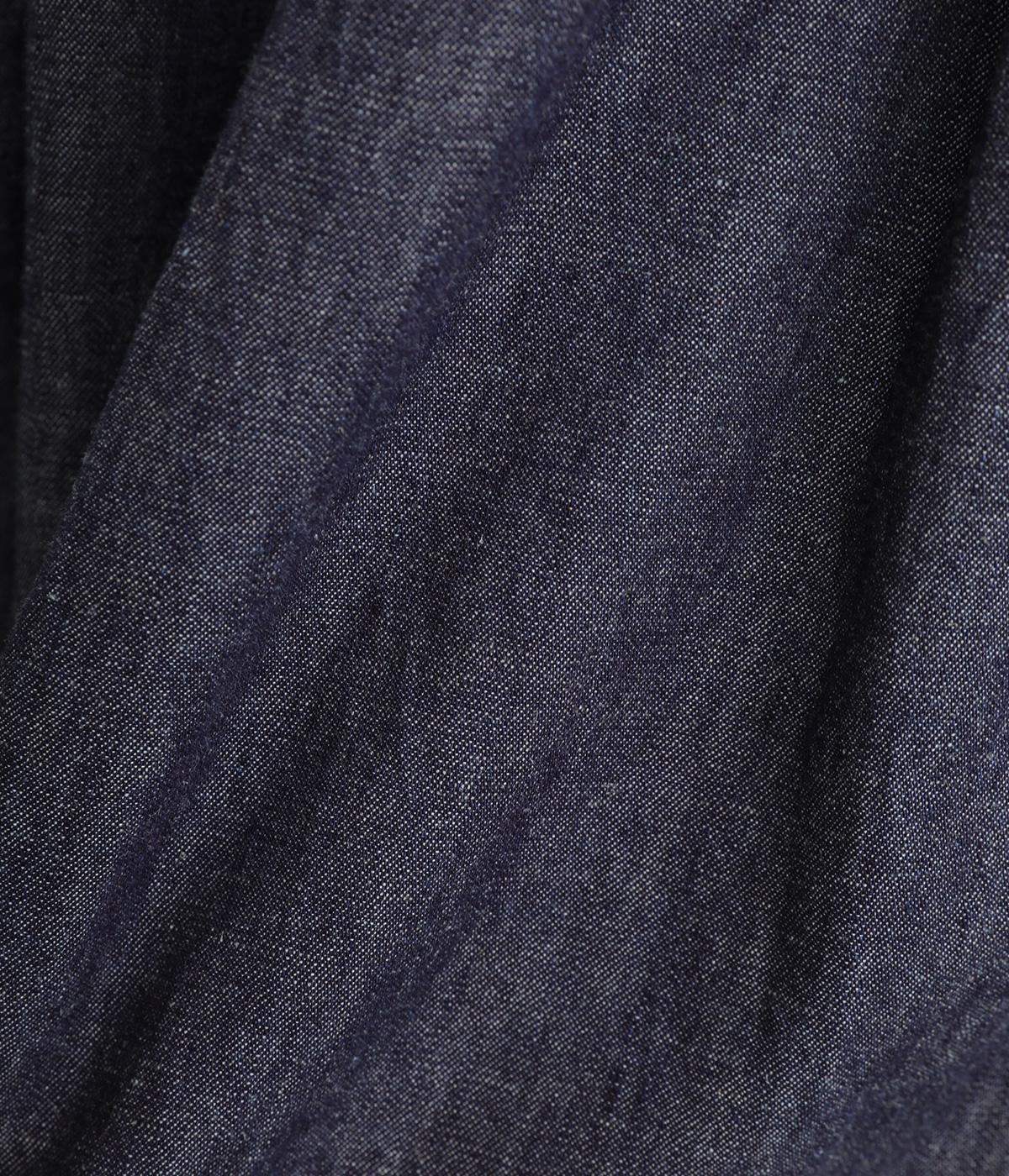 コットンにリネンをまぜてナチュラル感を高めたデニム生地で仕立てました。薄手で着用初期からやわらかく、軽やかなはき心地です。インディゴならではのエイジングもたのしみのひとつ。
