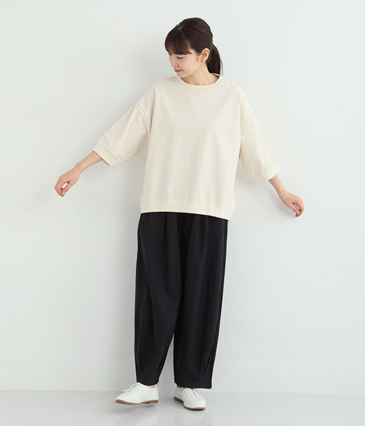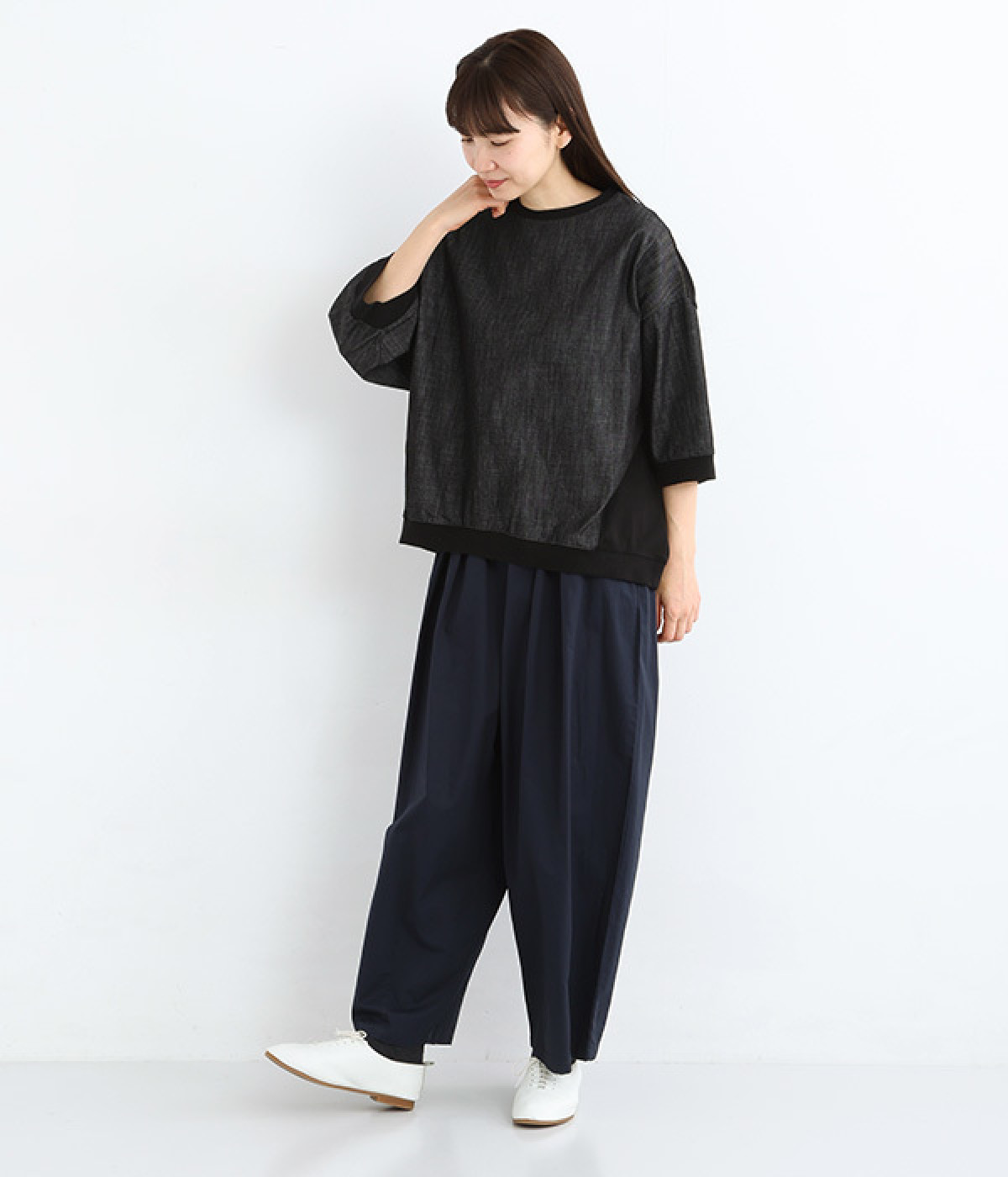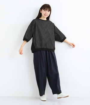 サイドの切り替えを斜めにしてワイドシルエットをすっきりと見せたのがポイント。アウトラインはリブ仕立てにしてメリハリをつけました。難易度の高い柄ボトムスとも合わせやすいので、おしゃれのレベルアップにひと役買ってくれそうです。