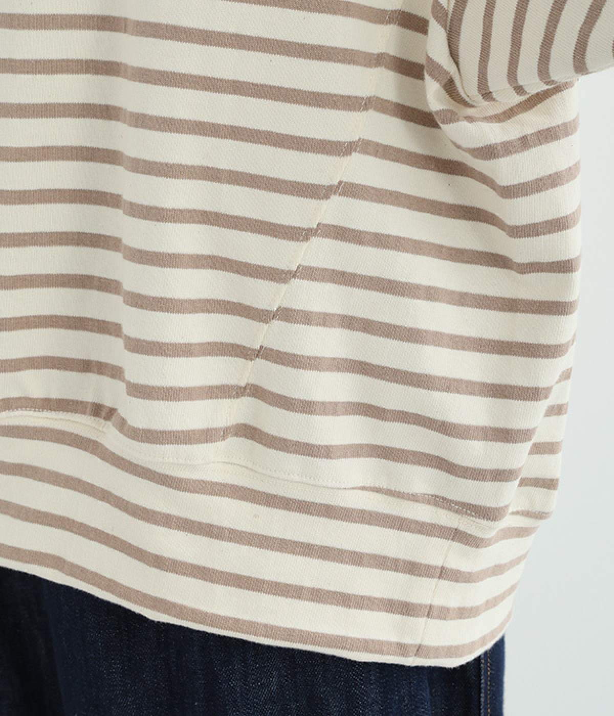 素朴な手触りが気持ちいいしっかりめのコットン天竺素材で、着心地のよさを高めました。糸に染色をほどこして織り上げた先染めボーダーがポイントになっています。