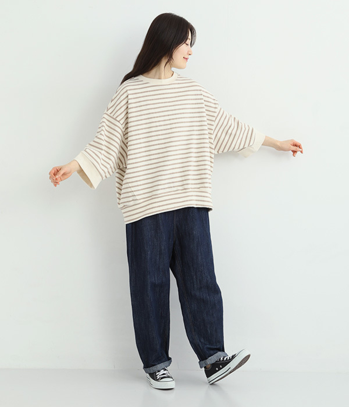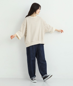 サイドの切り替えを斜めにしてワイドシルエットをすっきりと見せたのがポイント。アウトラインはリブ仕立てにしてメリハリをつけました。コーディネートをさわやかに演出するボーダー柄があたたかい季節にぴったり。