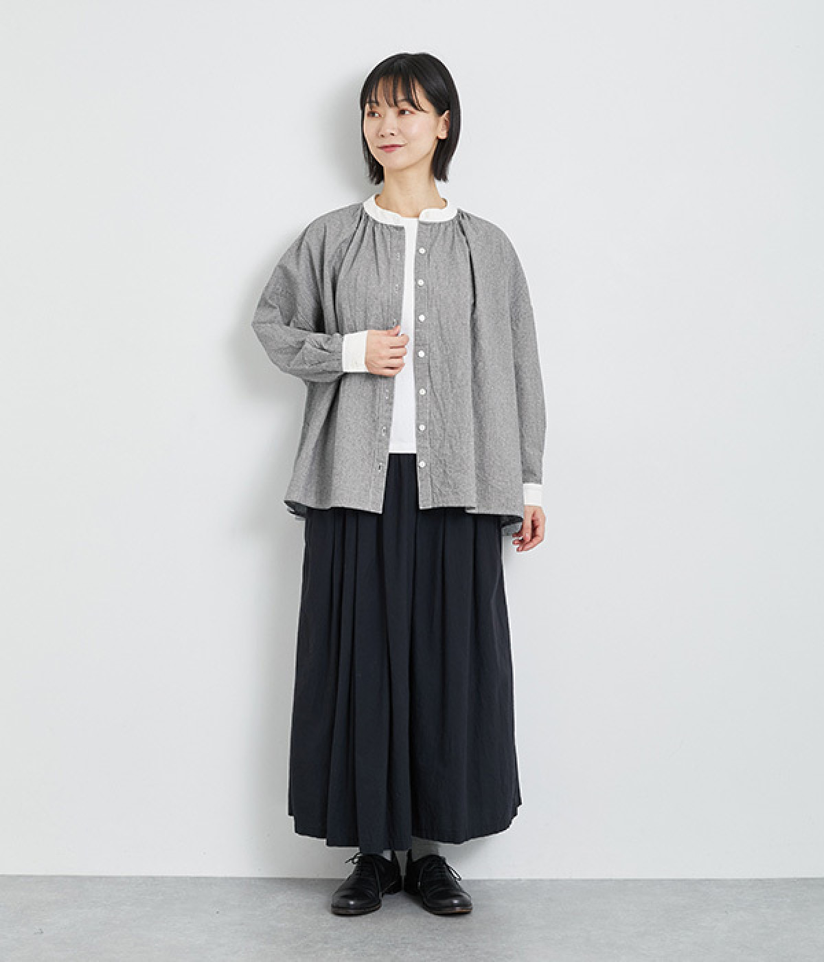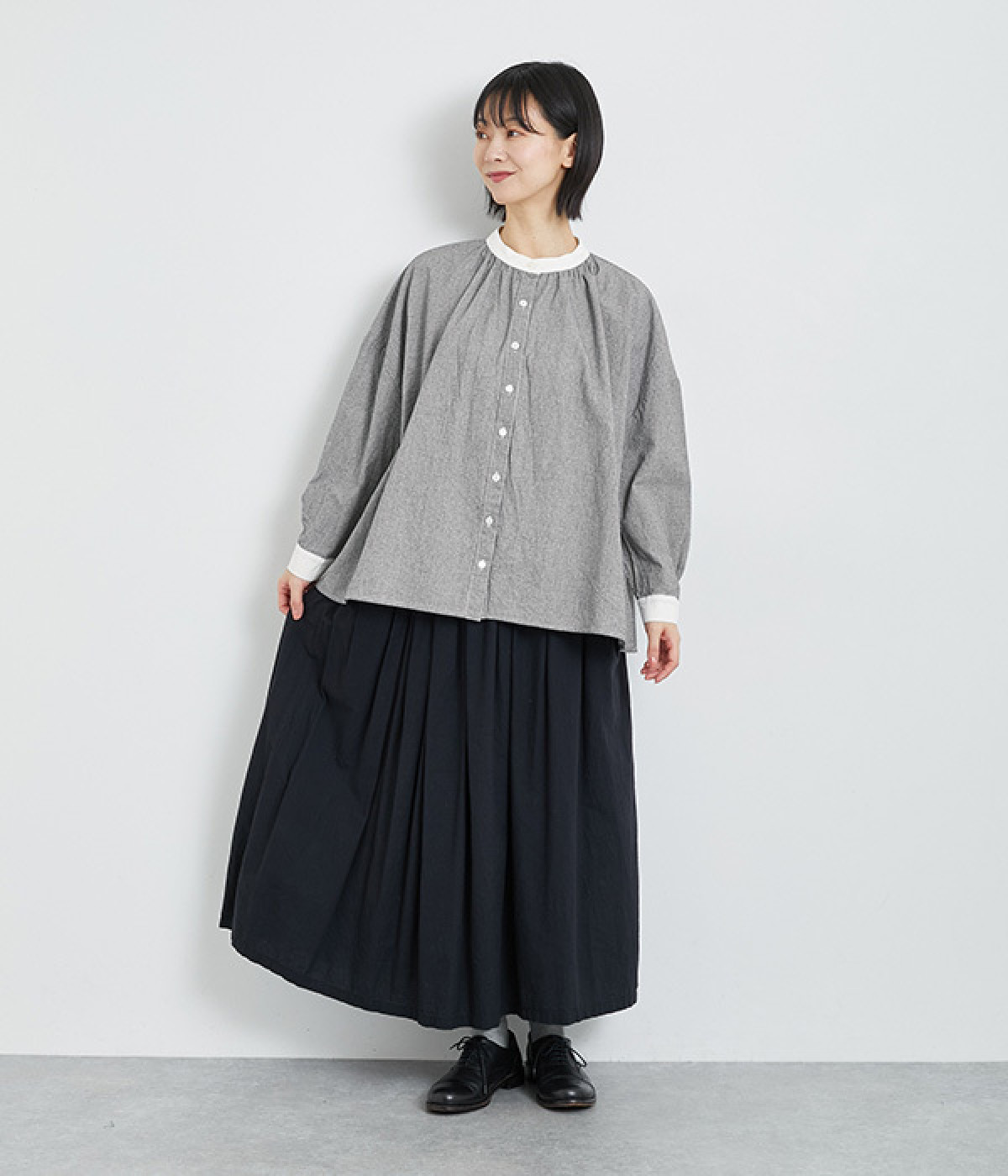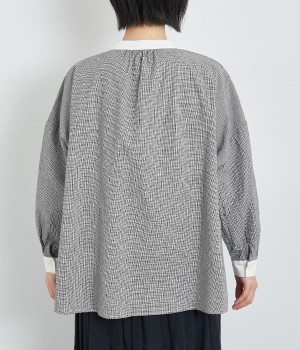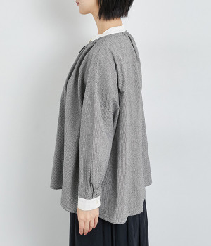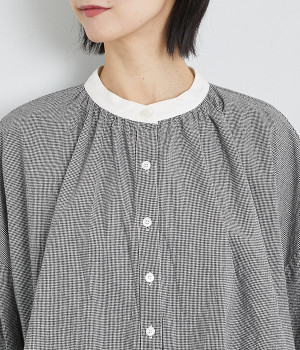 袖のタックや、ネックラインのギャザーでゆとりを持たせたリラクシーなブラウス。無地で切り替えたバンドカラーや袖口のクレリックデザインがアクセントになっています。オンオフで取り入れられる、ベーシックかつカジュアルな一枚です。