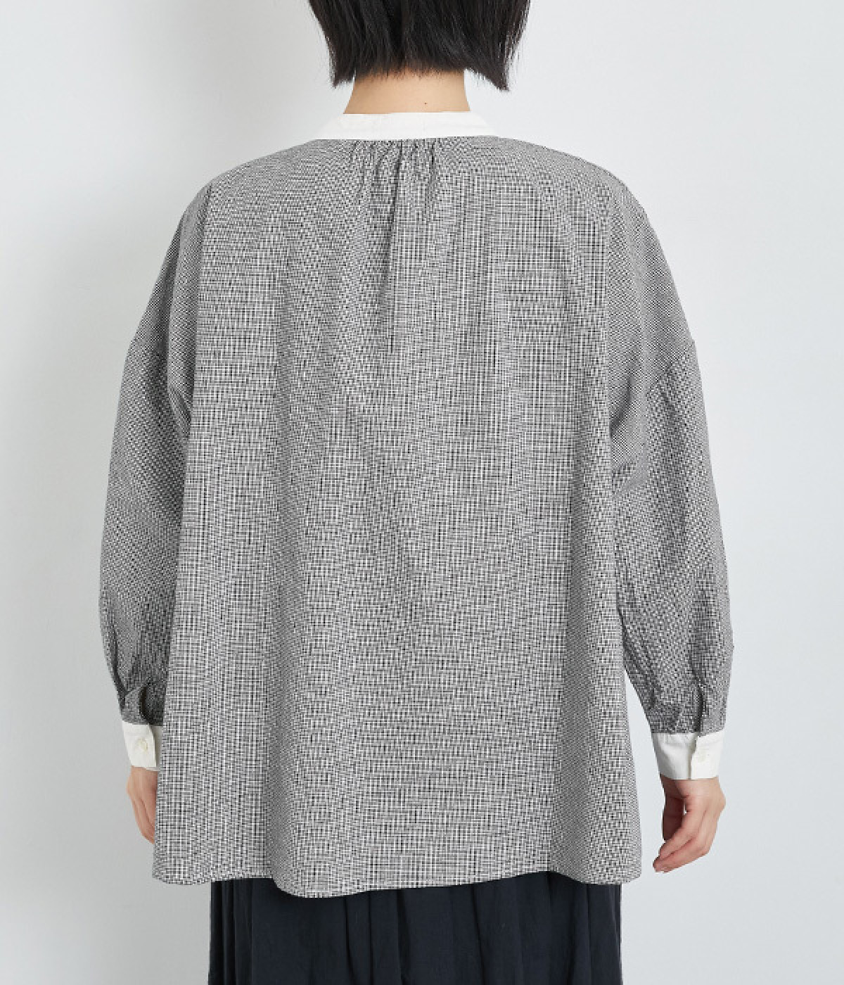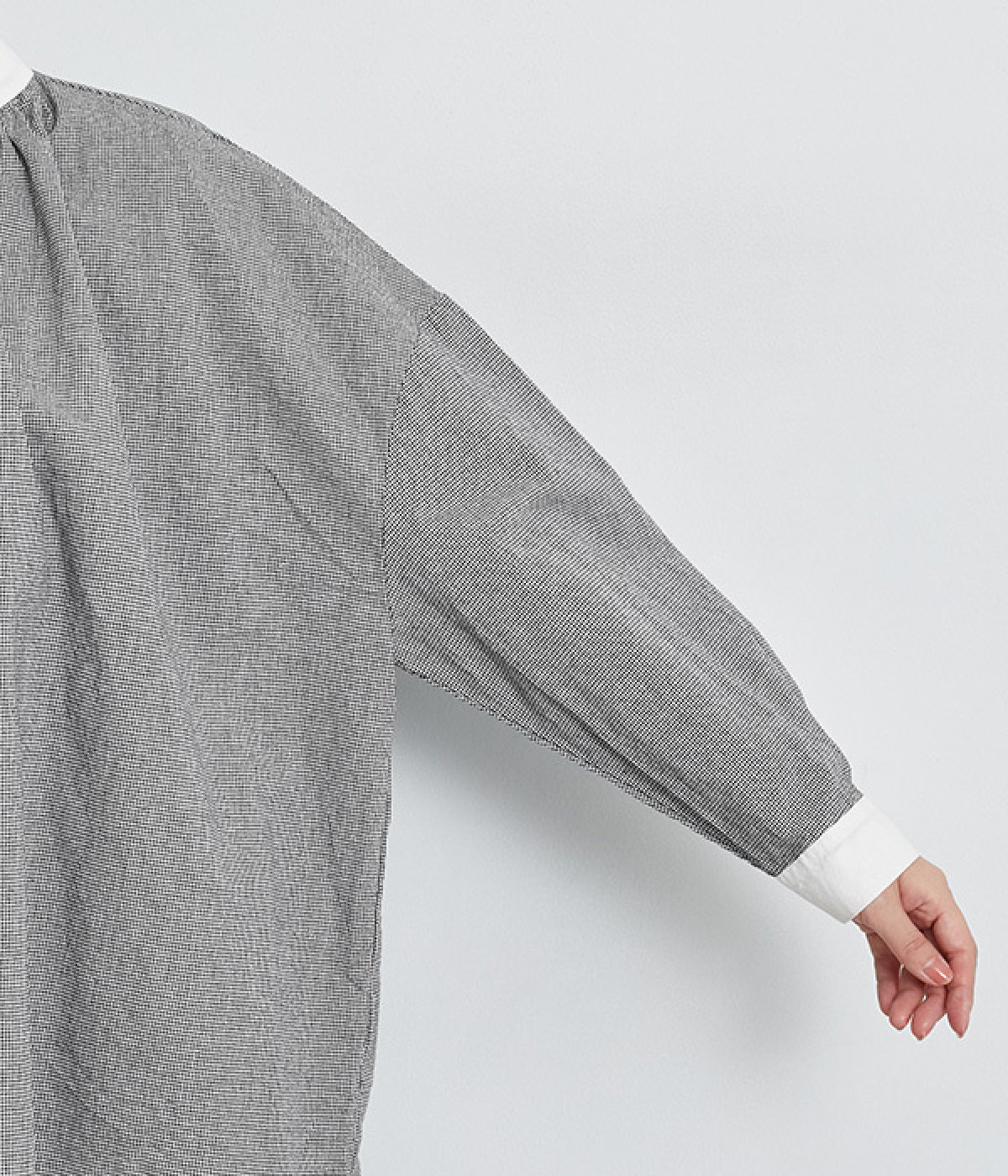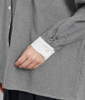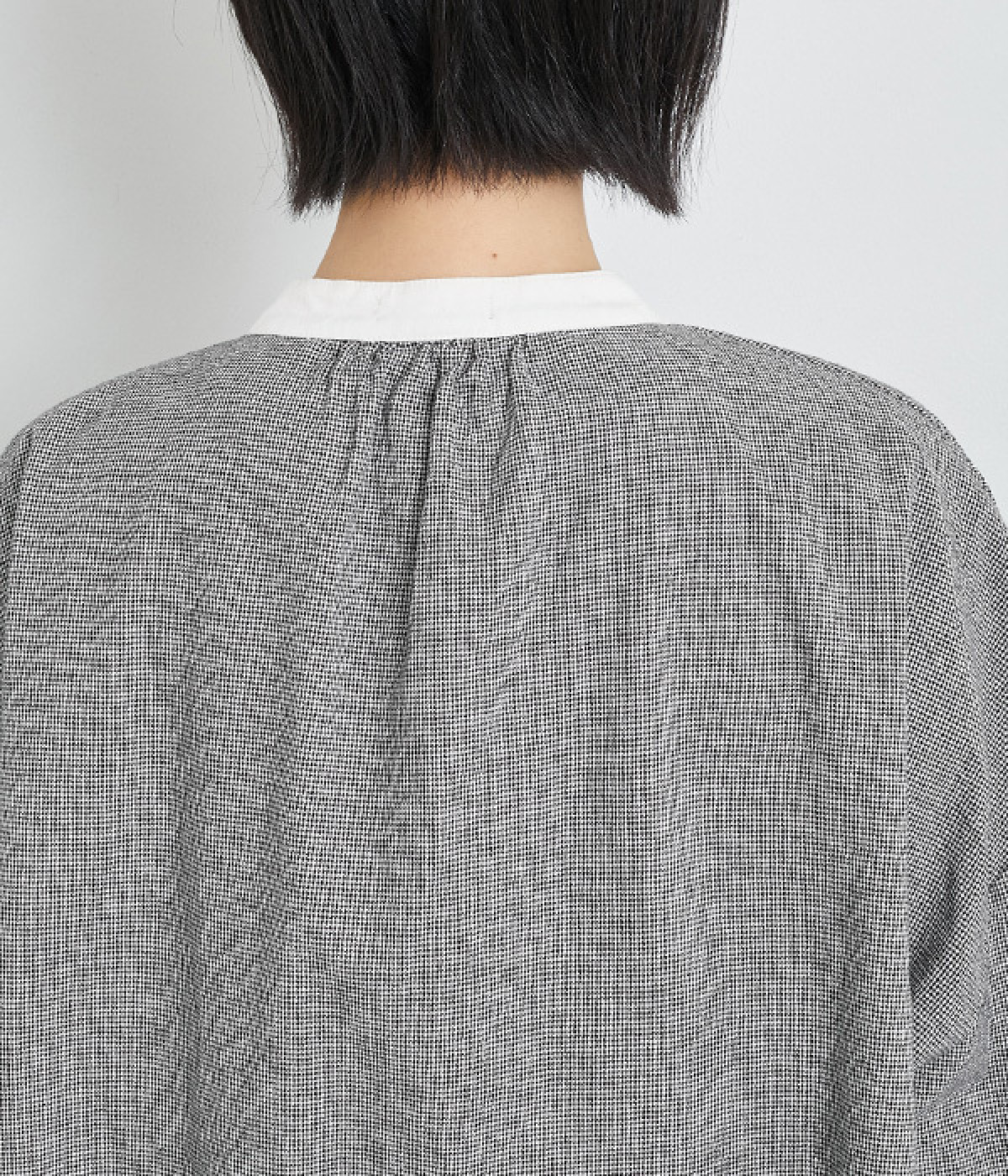 さらりとした質感を持ち、肌なじみのよいコットン素材を使用しています。無地見えする細かな千鳥格子がシックな着こなしを演出。