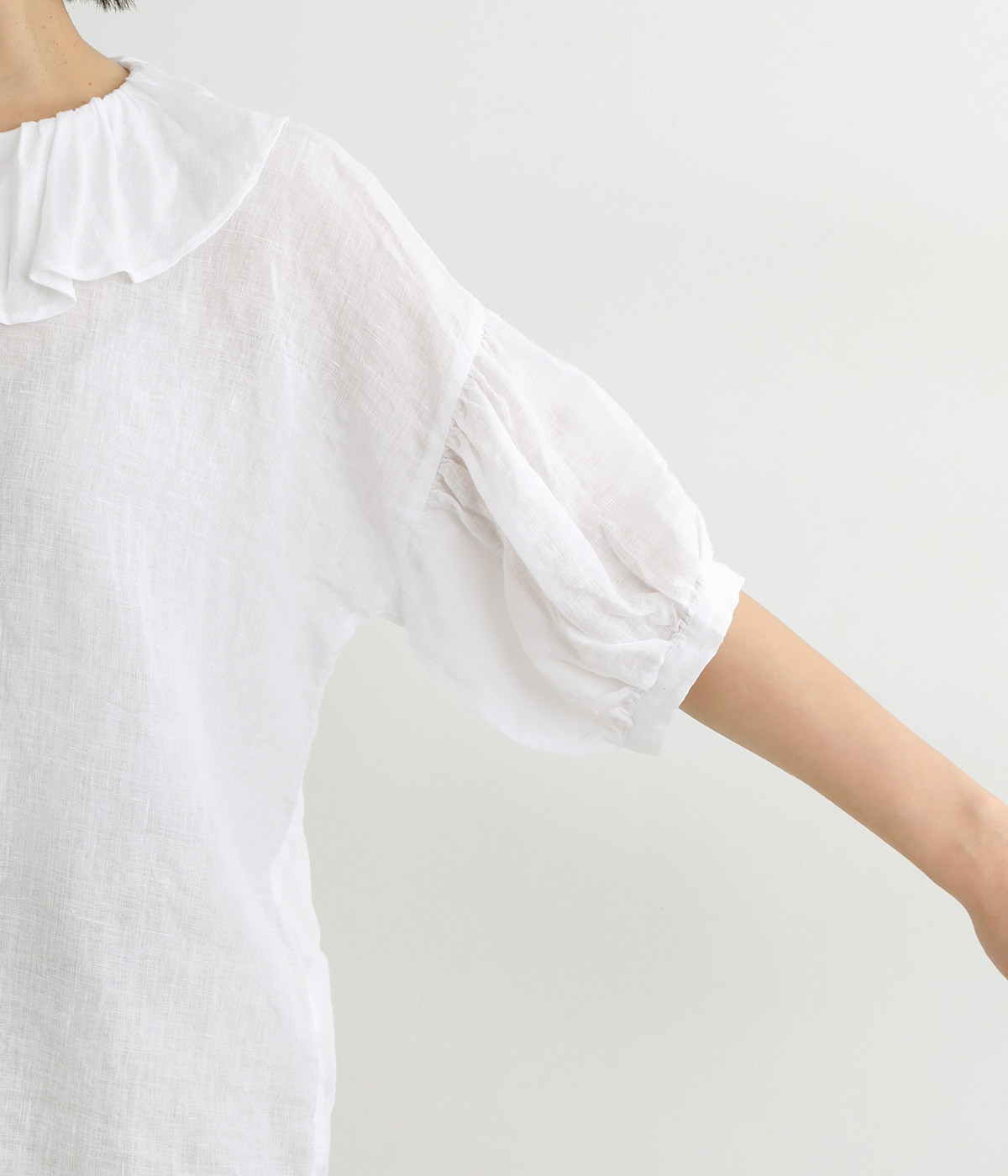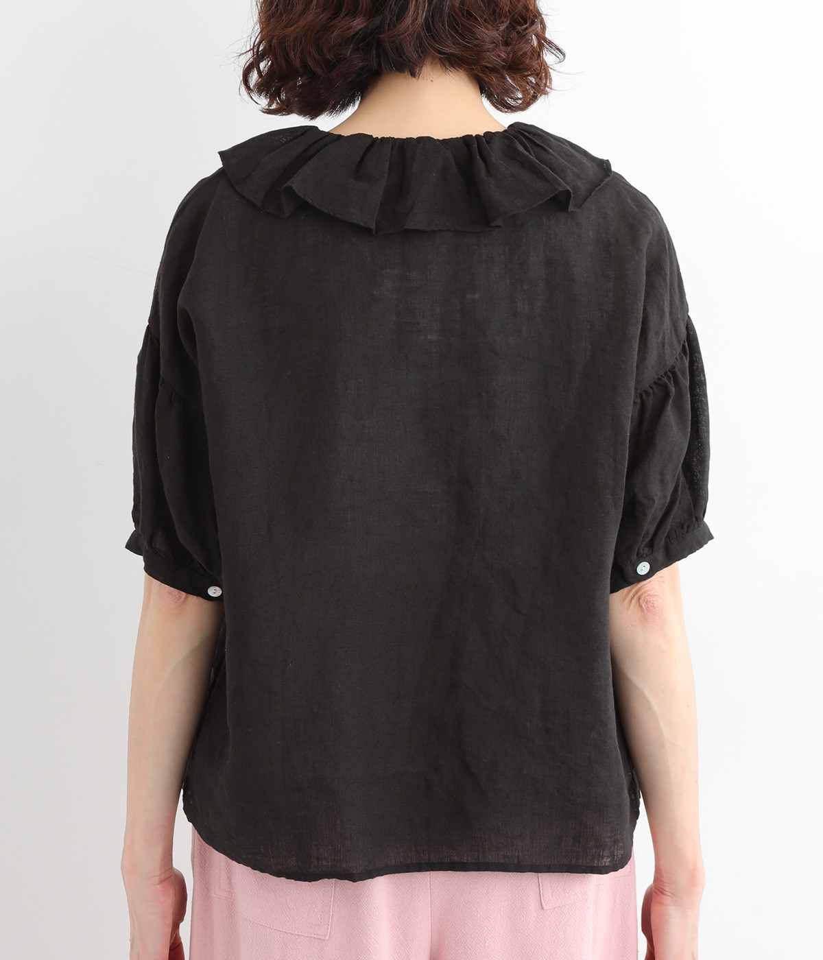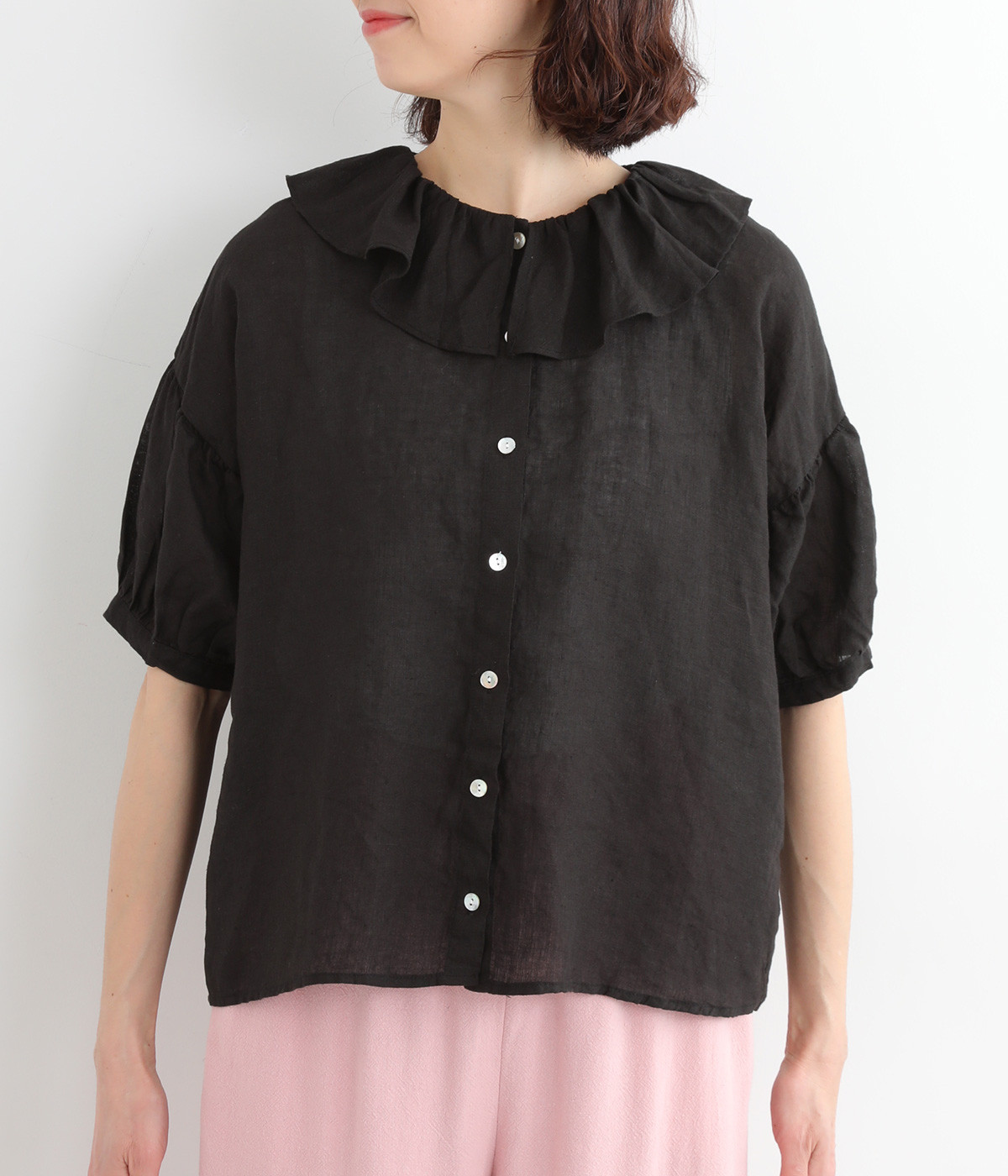 存在感のある大きめのフリル襟が女性らしさを引き立てるブラウス。ふんわりとした袖がさらに甘さを引き立てます。一枚で着るのはもちろん、ディテールを活かしたレイヤードスタイルにもぴったりのアイテムです。