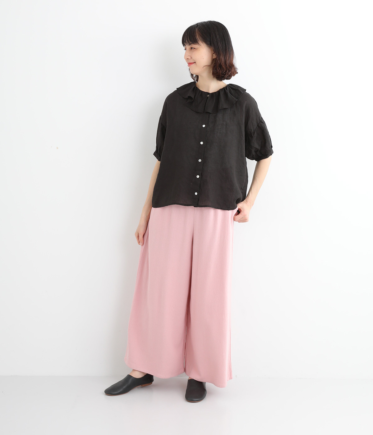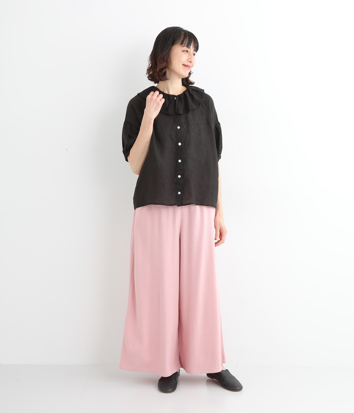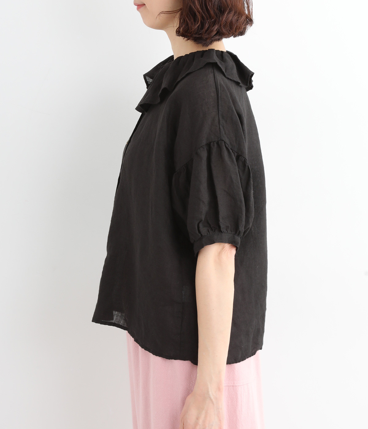 存在感のある大きめのフリル襟が女性らしさを引き立てるブラウス。ふんわりとした袖がさらに甘さを引き立てます。一枚で着るのはもちろん、ディテールを活かしたレイヤードスタイルにもぴったりのアイテムです。