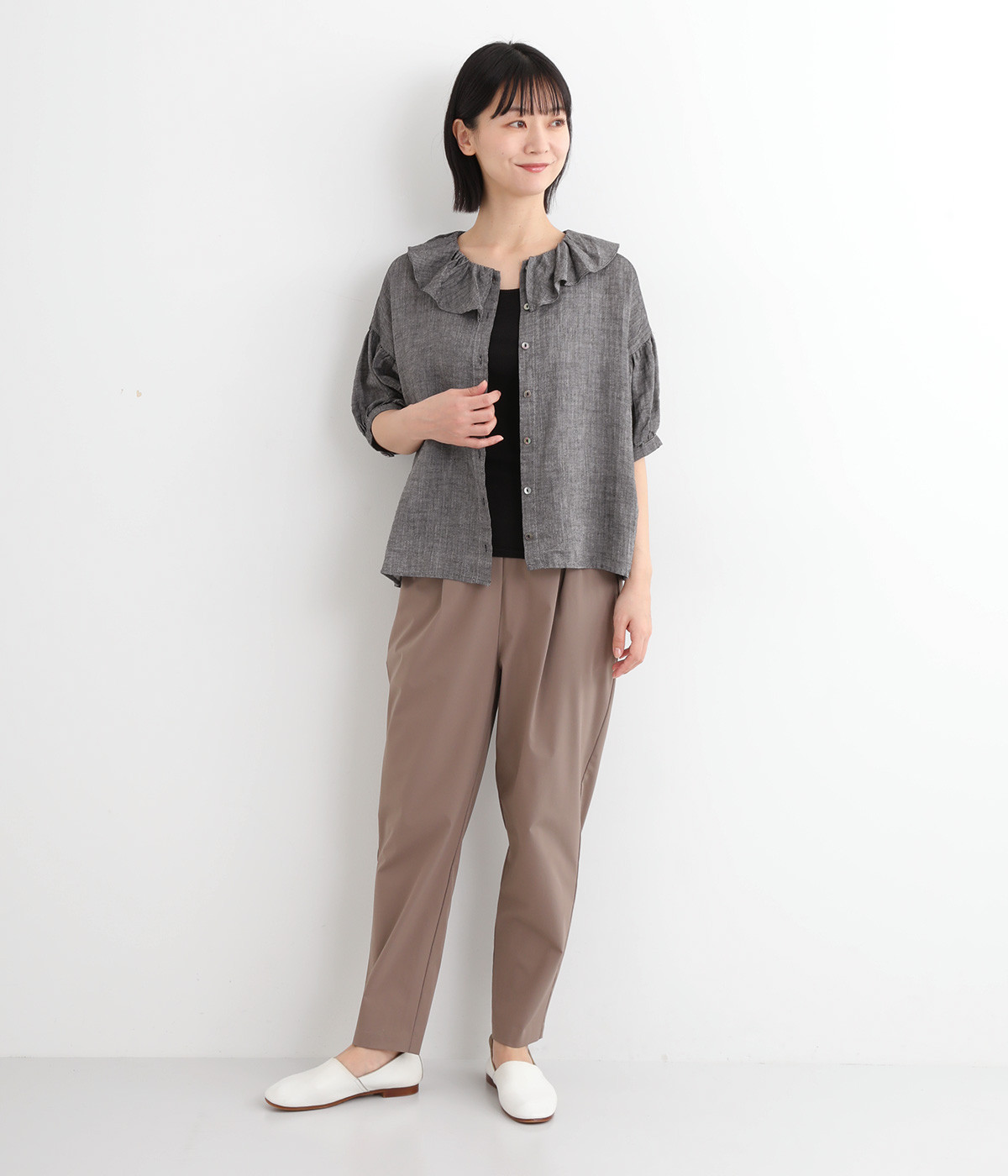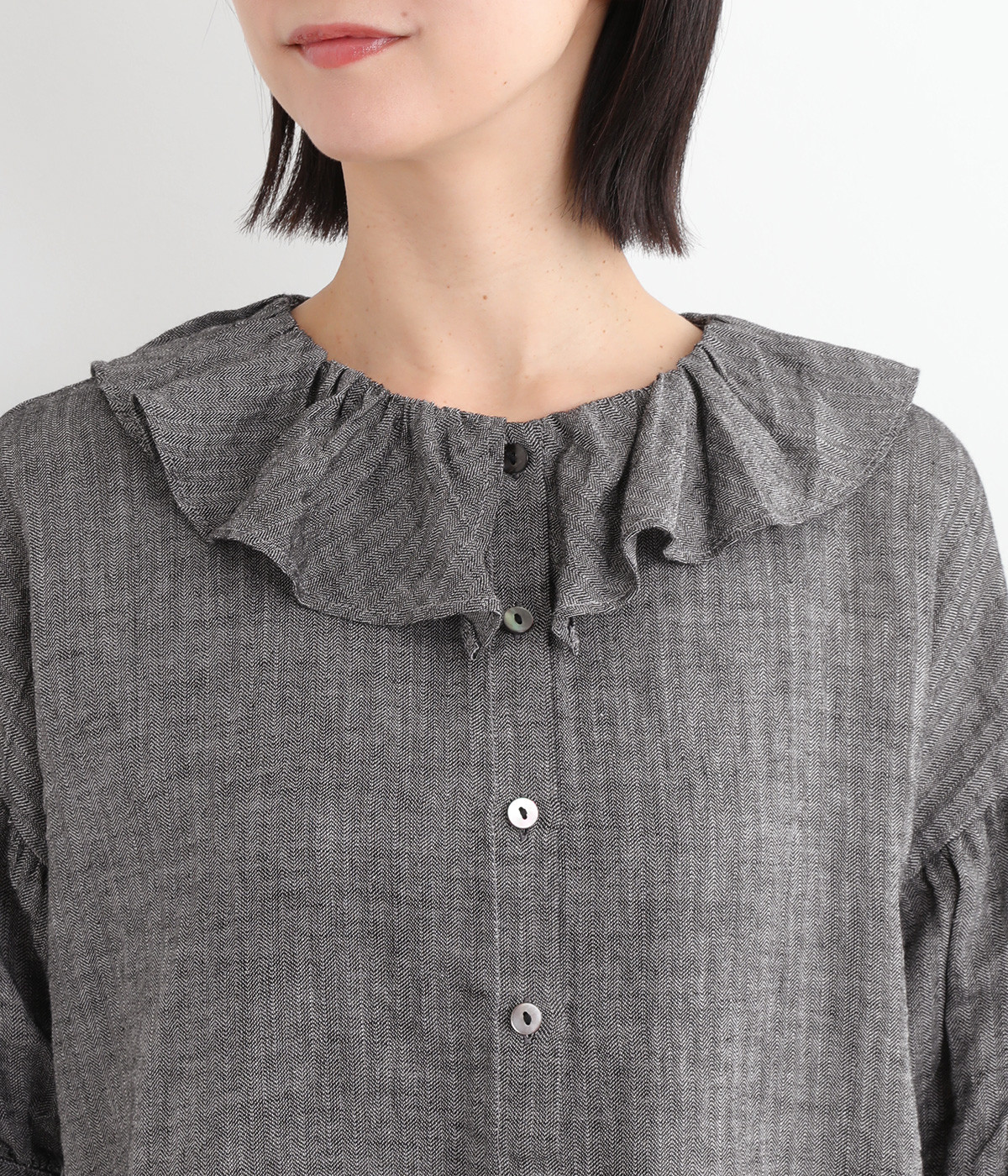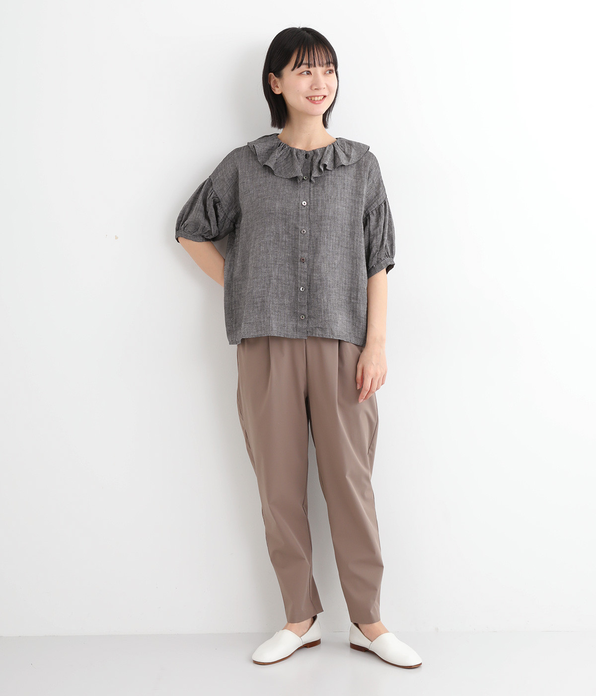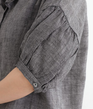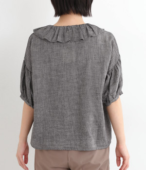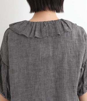 白い糸を織り込んだ、霜降り調の奥行きある色合いが魅力のシャンブレー生地を使用。リネンならではの軽やかさと、肌にやさしい着心地を叶えます。