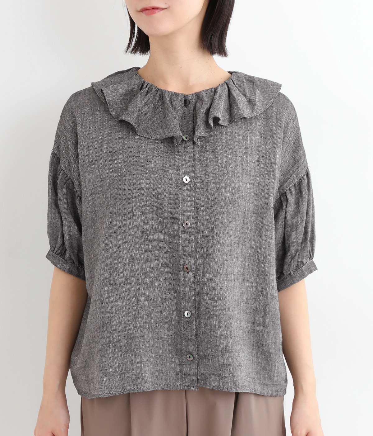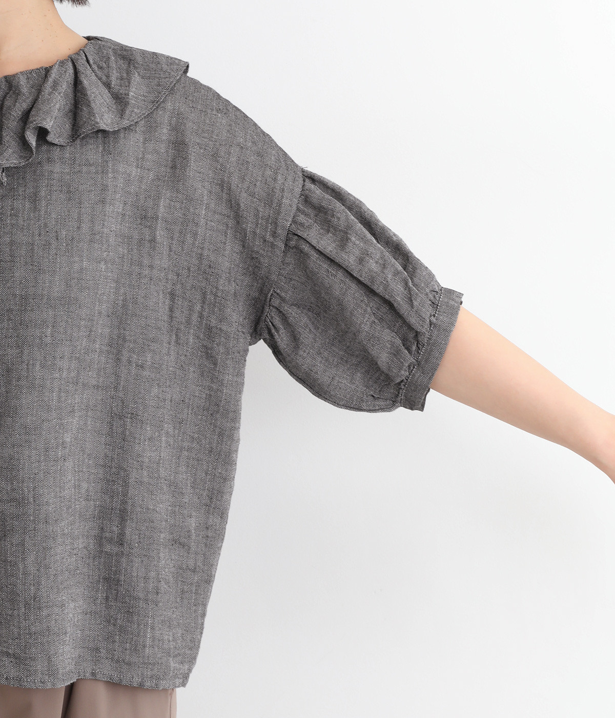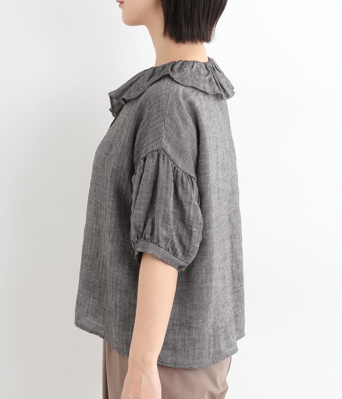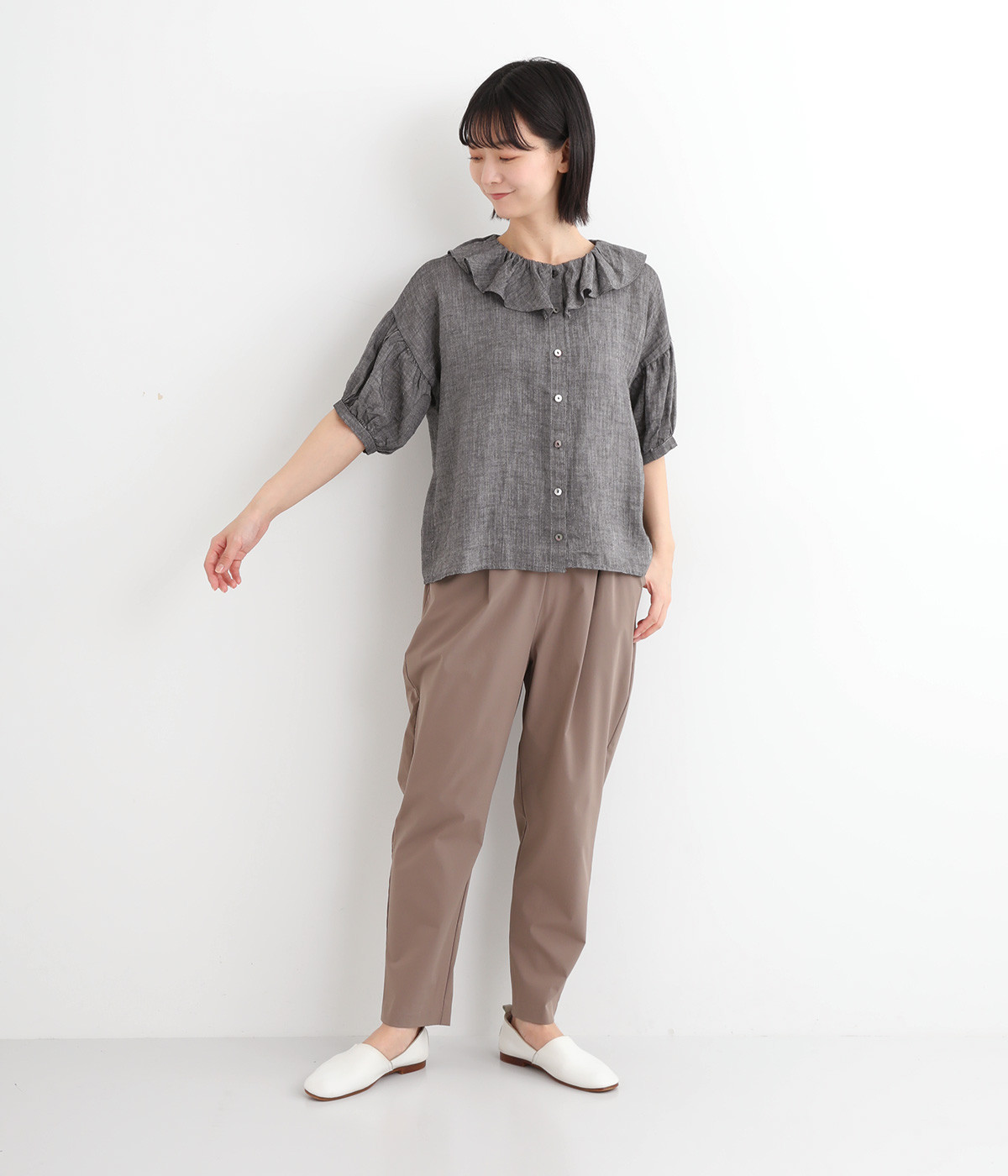 白い糸を織り込んだ、霜降り調の奥行きある色合いが魅力のシャンブレー生地を使用。リネンならではの軽やかさと、肌にやさしい着心地を叶えます。