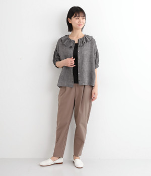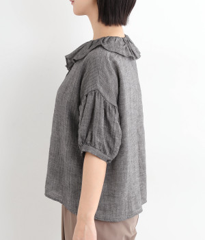 愛らしいフリル襟が顔まわりを華やかにみせるブラウス。ふんだんにギャザーを入れたバルーンスリーブが、女性らしさを引き立てます。一枚でさらっと着るだけで存在感抜群。レイヤードスタイルの名脇役としても活躍します。