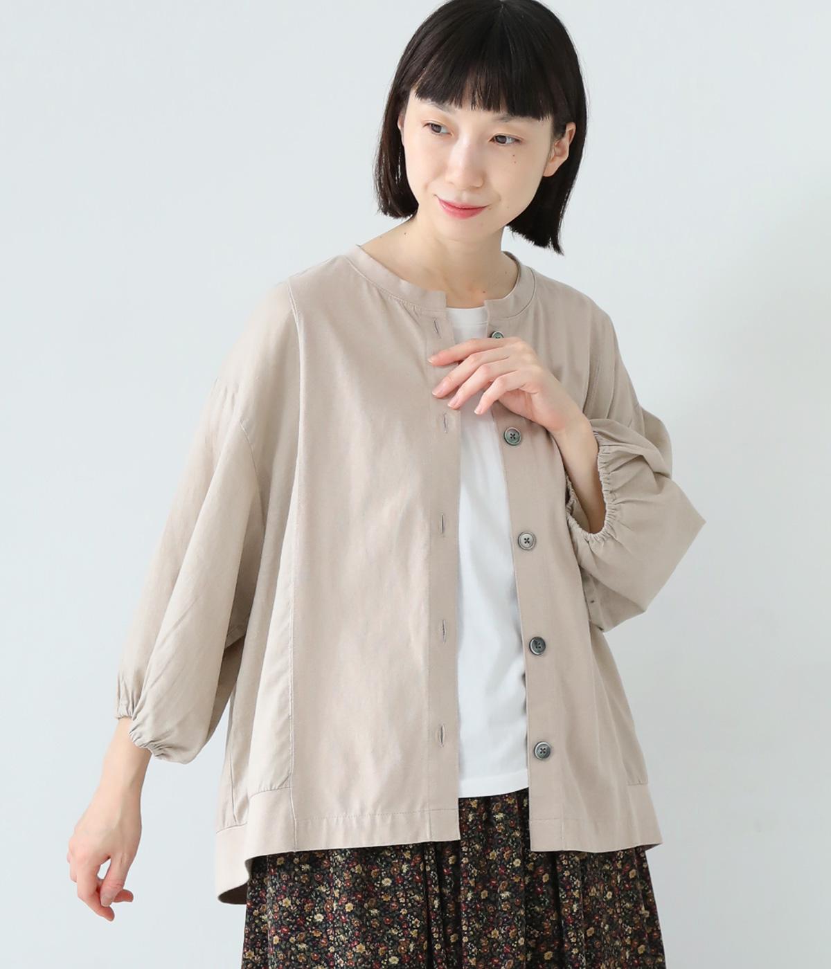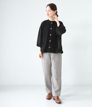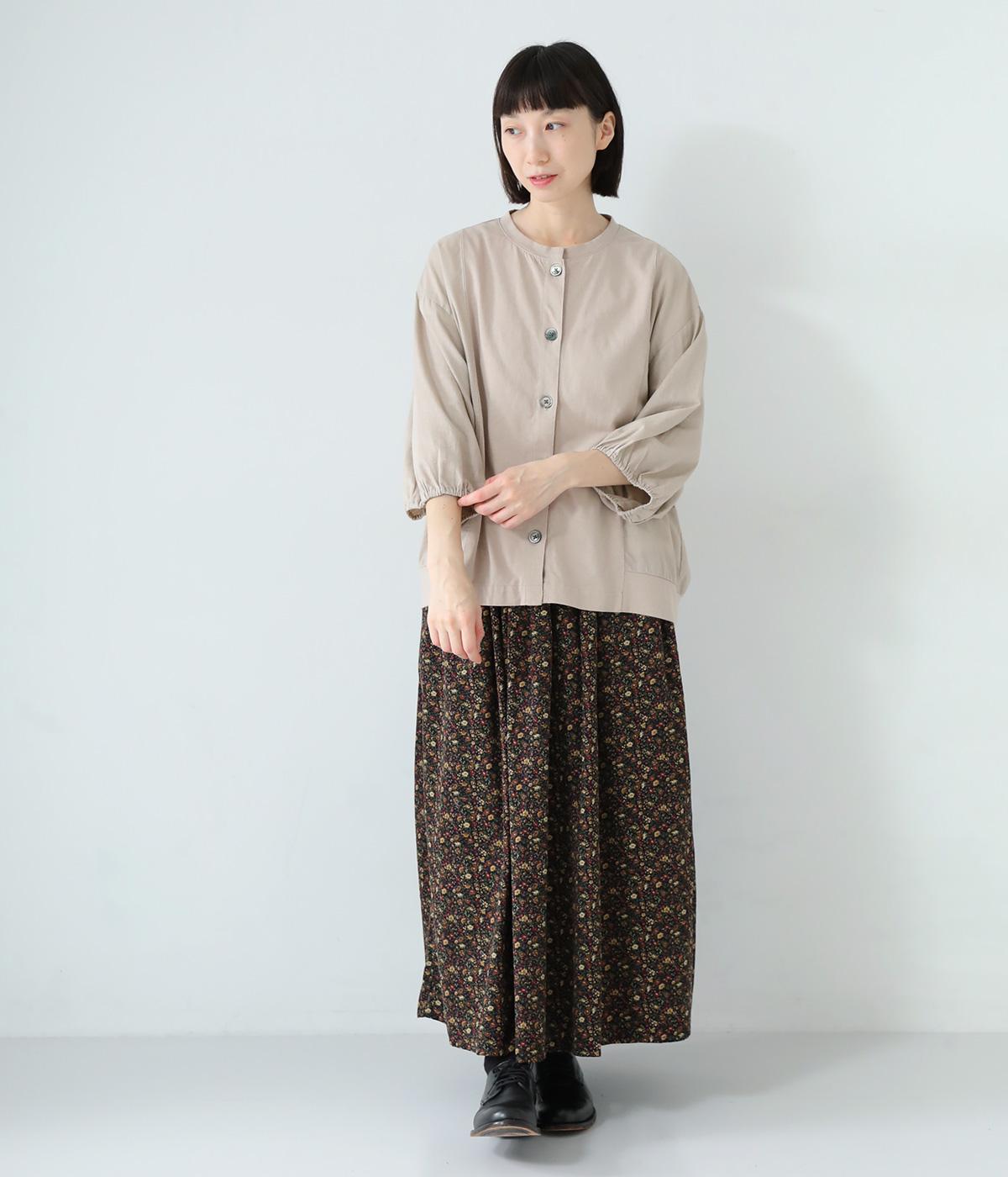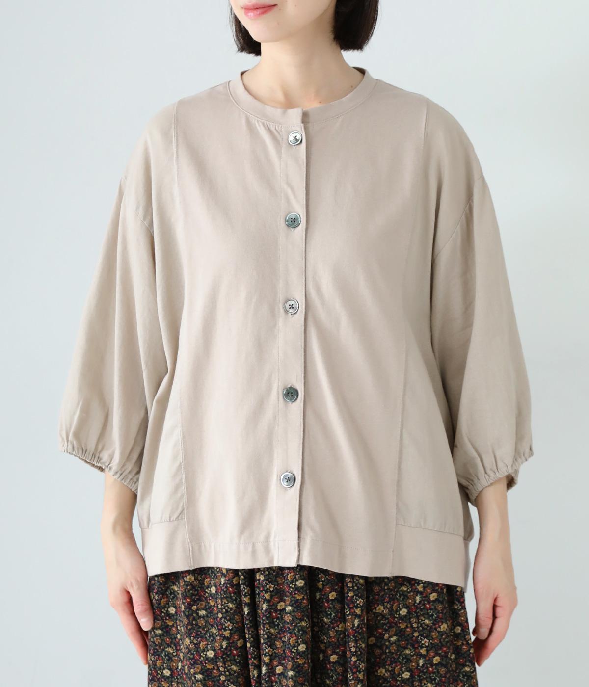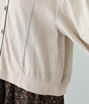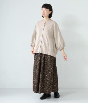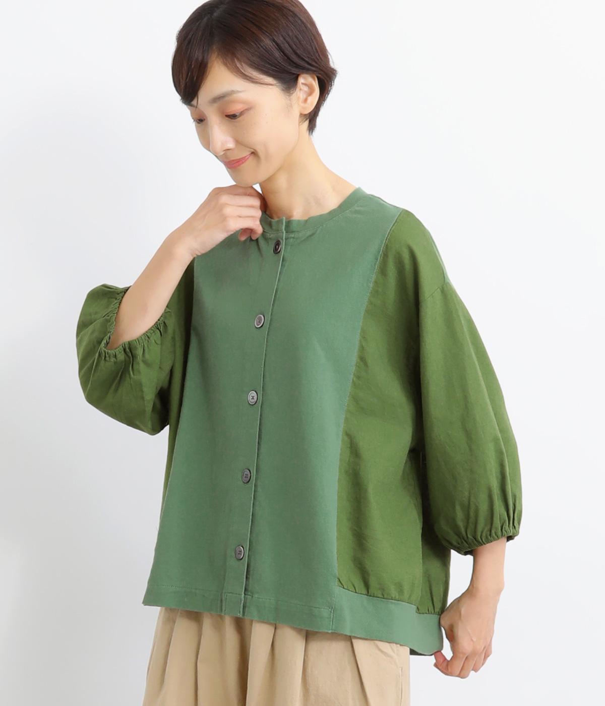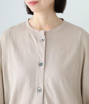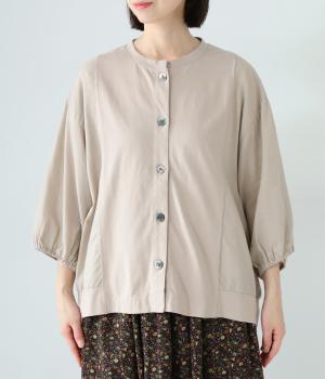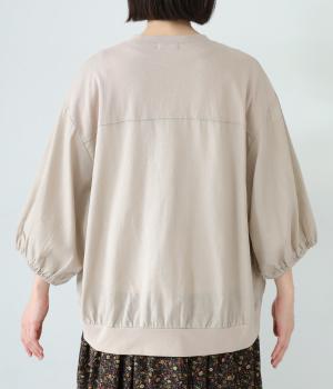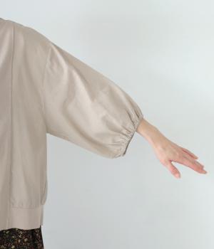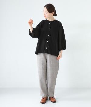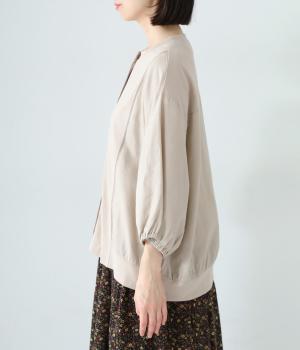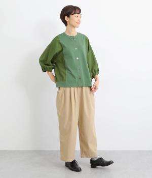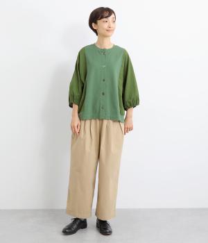 前身頃や後ろヨークに天竺生地を、袖や後ろ身頃などに布帛生地を使用した、2種類の異なる質感をたのしめるカーディガン。袖口にはゴムを通して、女性らしい丸みを帯びたスリーブラインに仕上げました。さっと羽織るのはもちろん、ボタンを留めてプルオーバー感覚でも着こなせます。