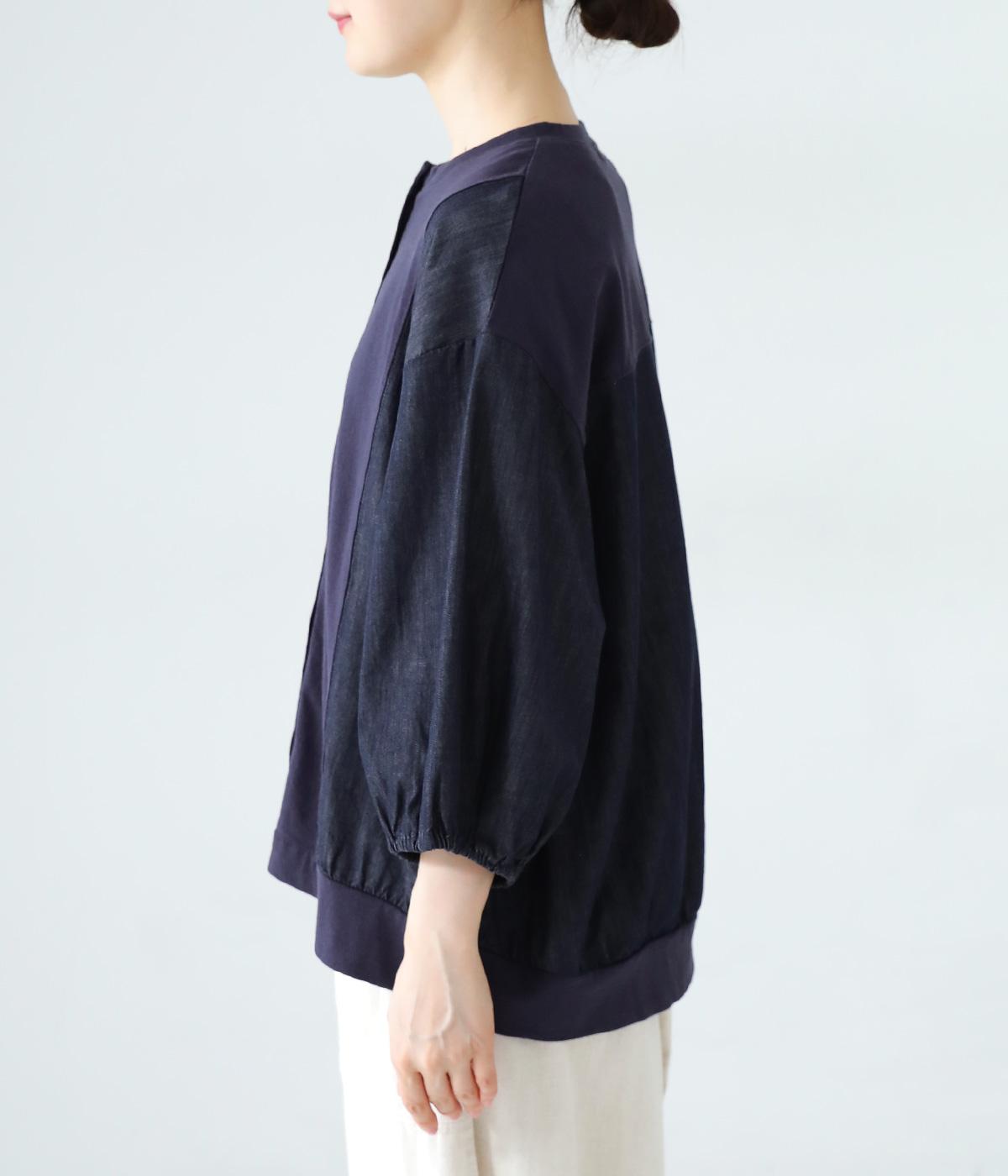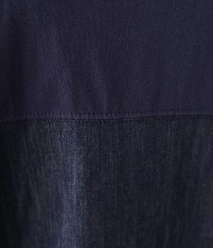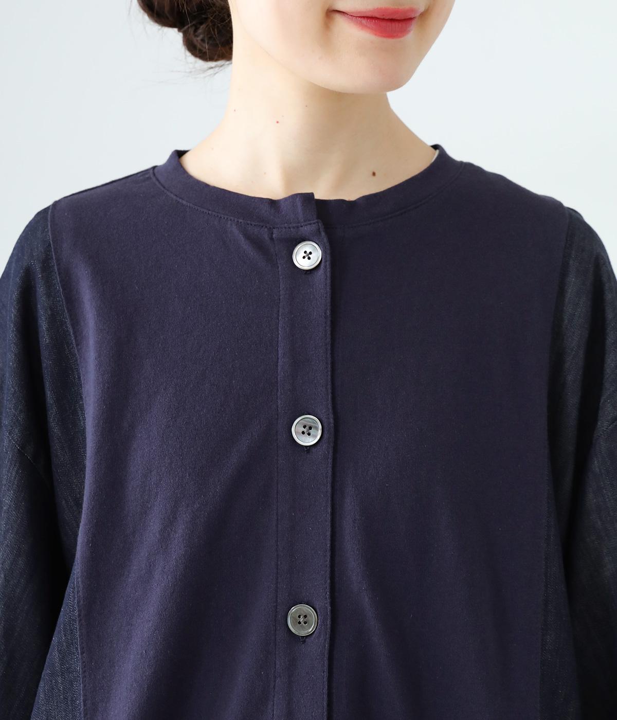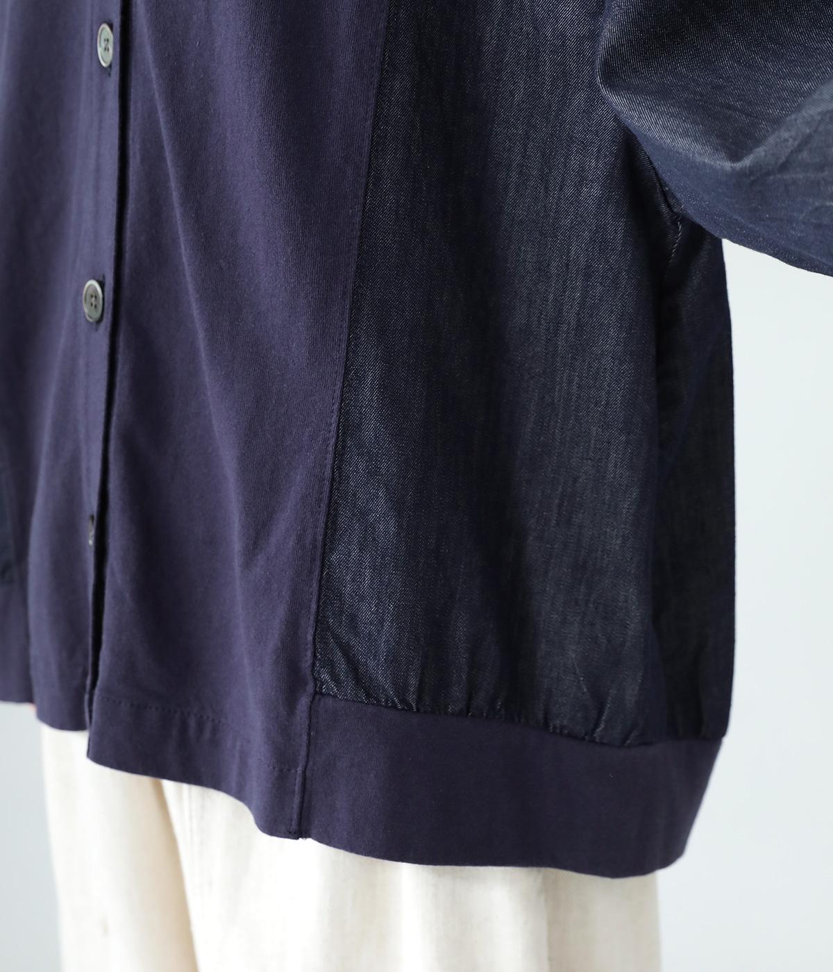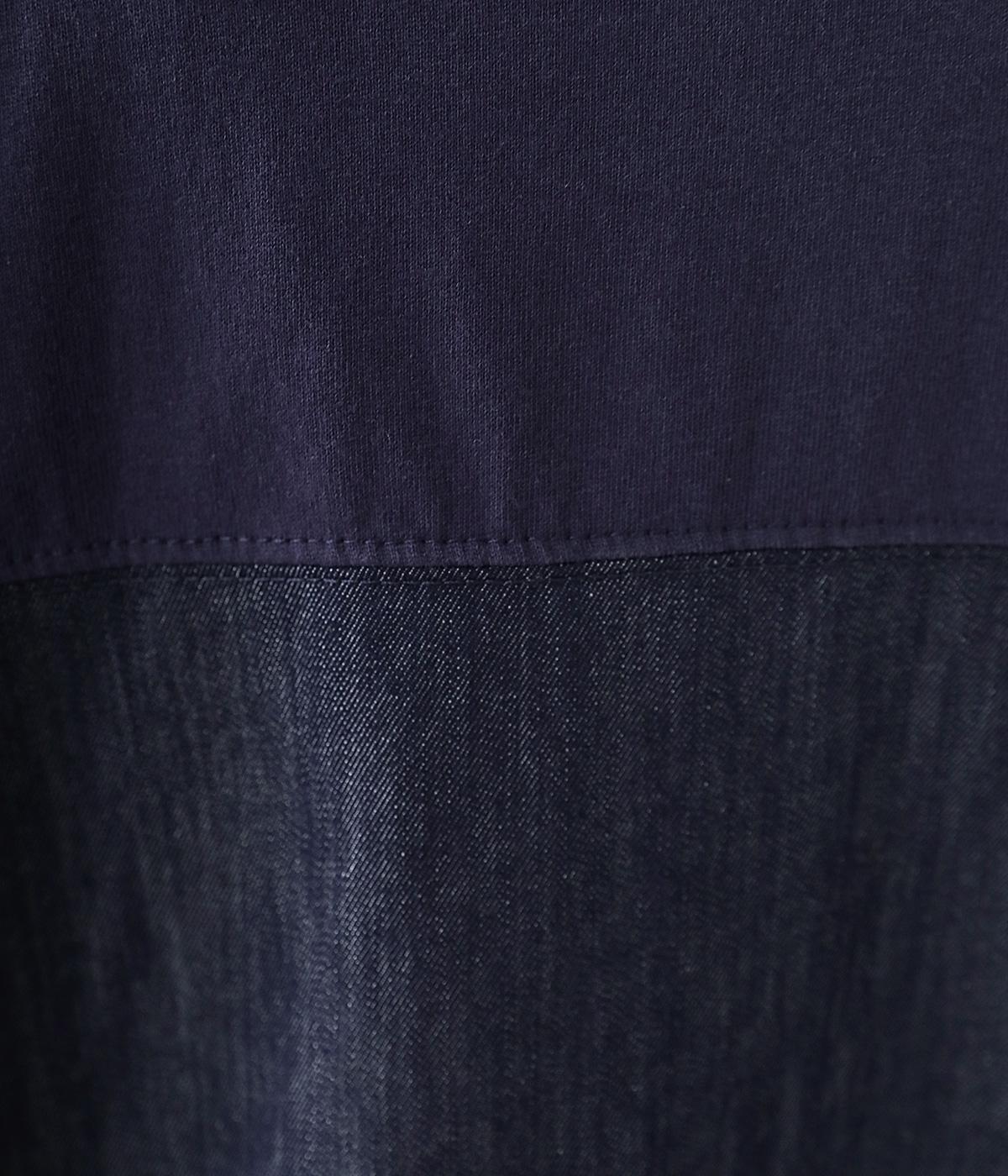 心地よく肌になじみ汗をしっかりと吸ってくれるコットン天竺生地と、やわらかな風合いの薄手のデニム生地をドッキング。どちらもとても軽やかな質感で、寒暖差の激しい時期にも快適に着用できます。