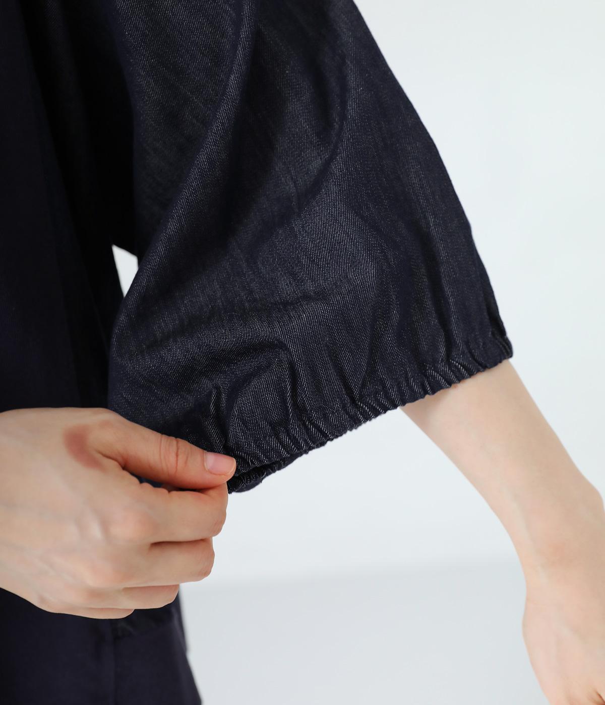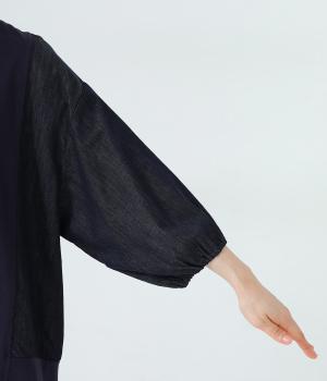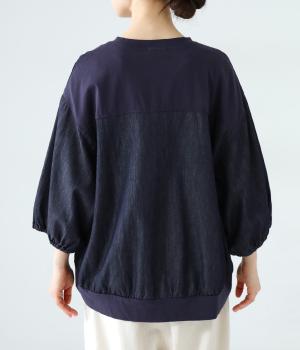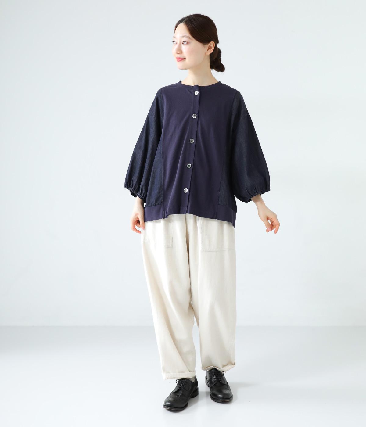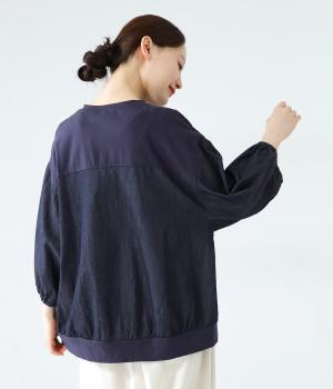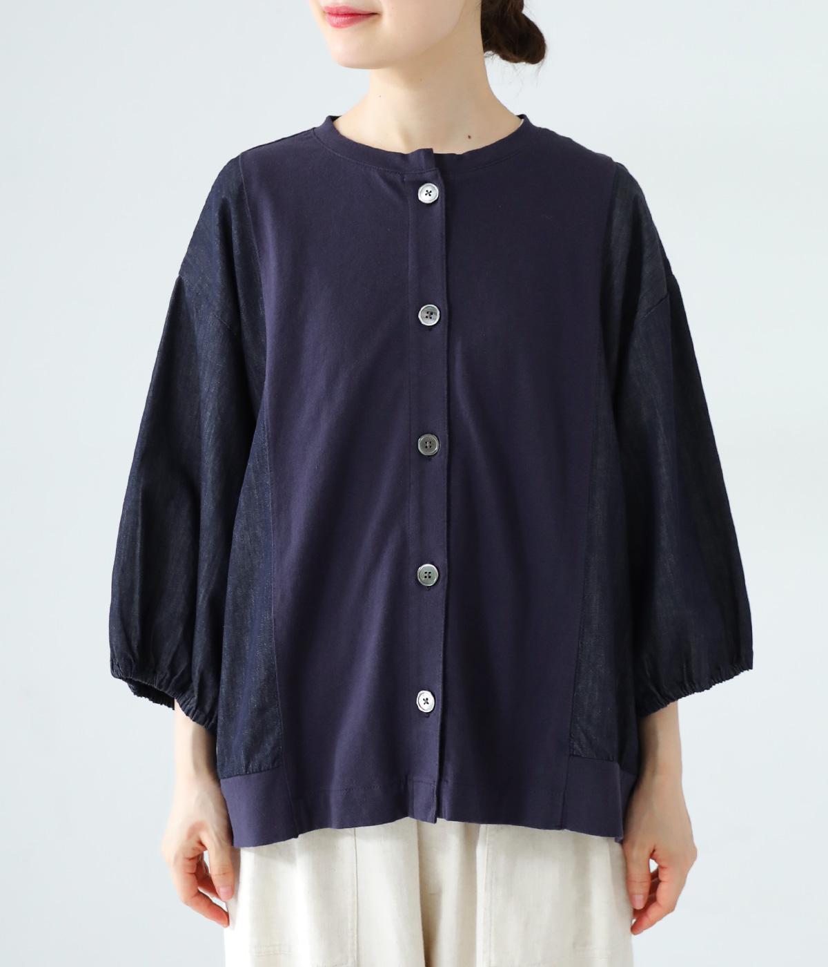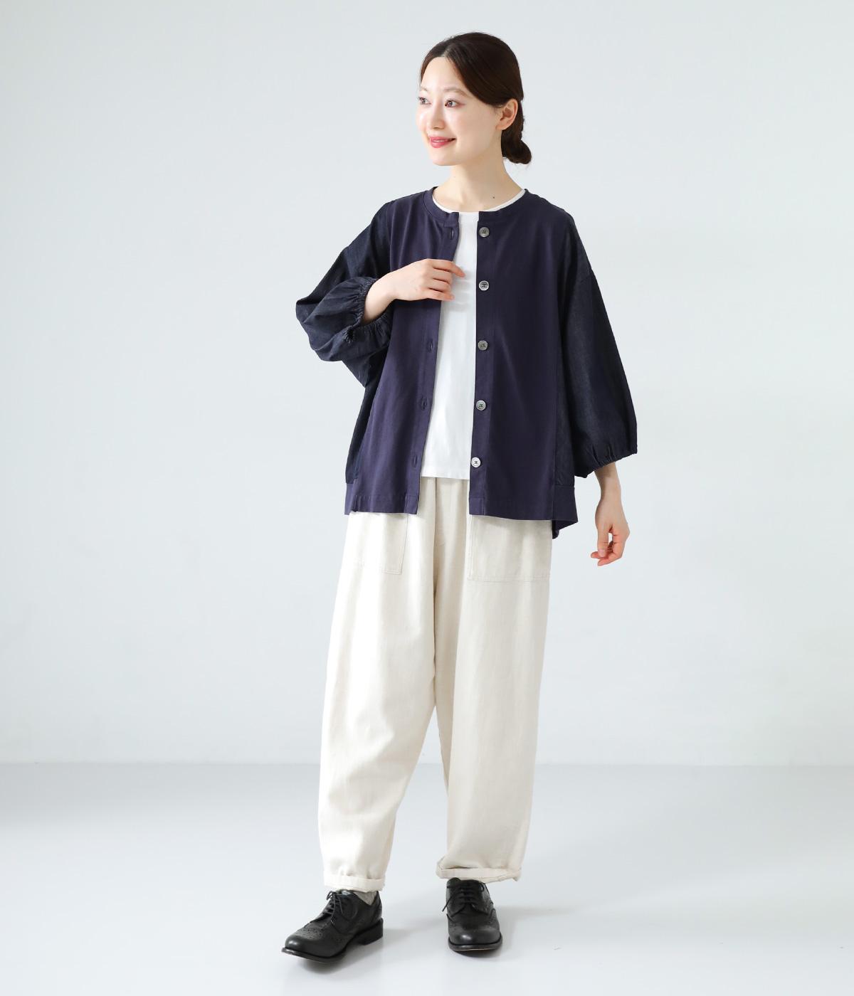 心地よく肌になじみ汗をしっかりと吸ってくれるコットン天竺生地と、やわらかな風合いの薄手のデニム生地をドッキング。どちらもとても軽やかな質感で、寒暖差の激しい時期にも快適に着用できます。