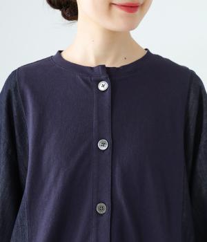 2種類の異なる生地を巧みに組み合わせた、一見シンプルながらもこだわりが詰まったカーディガン。袖口にゴムを入れて丸みを持たせた袖のラインと、手首が覗く袖丈がさりげなく女性らしさを漂わせます。さっと羽織るのはもちろん、ボタンを留めてプルオーバー感覚でもサマになる一着です。