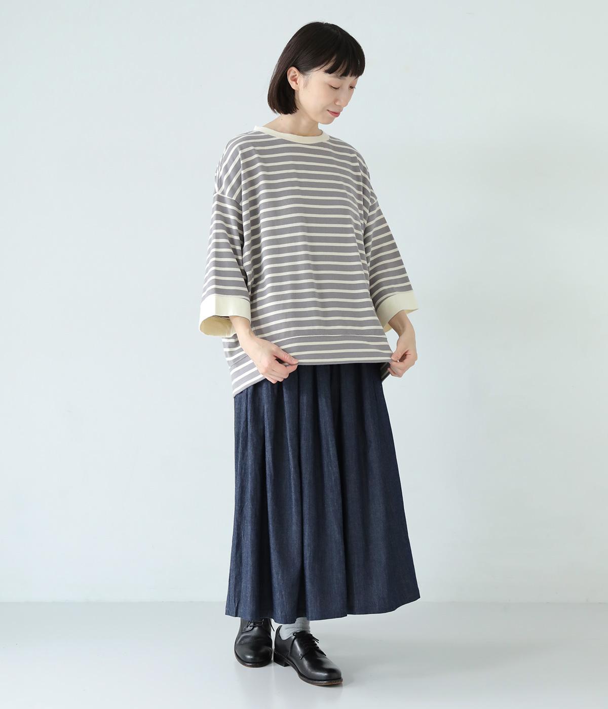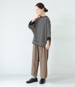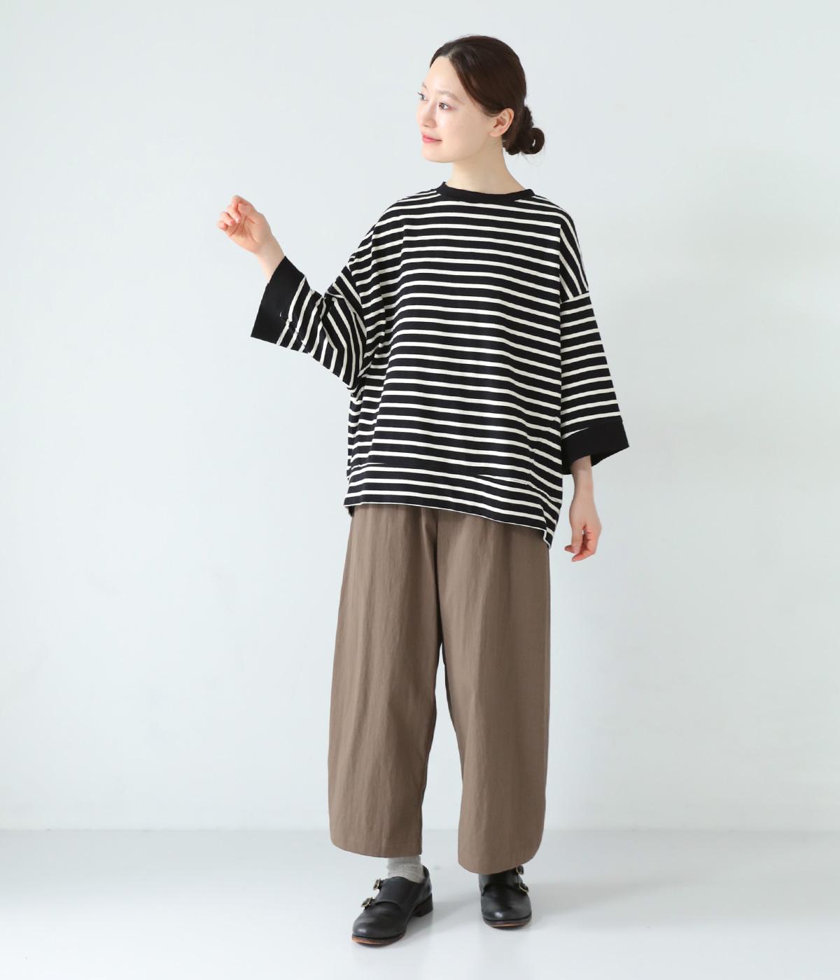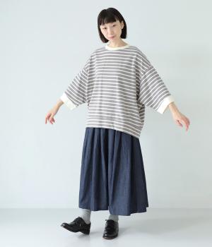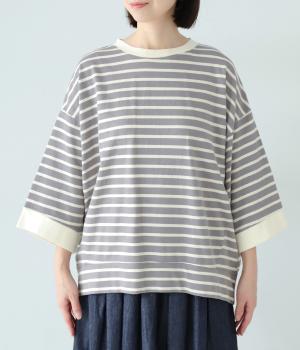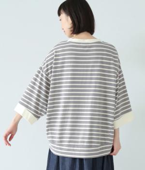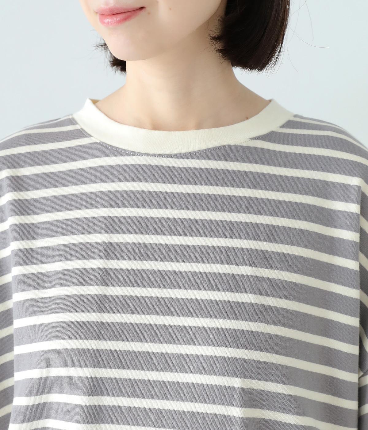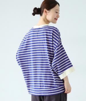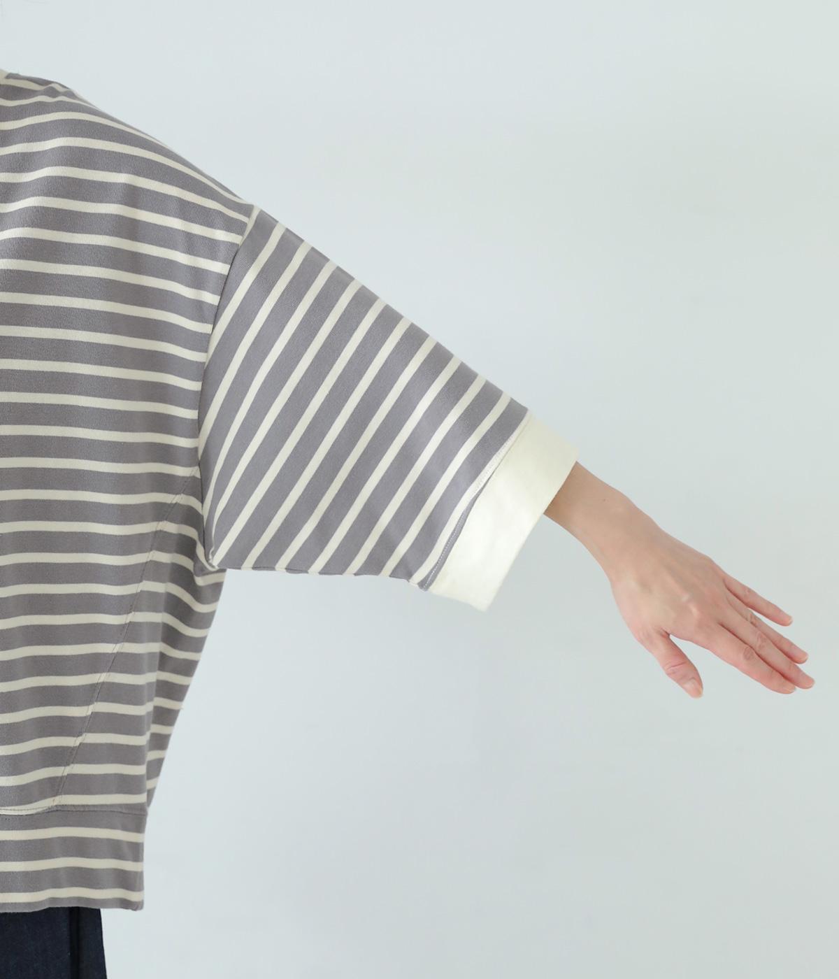 アームホールを広く取ったドルマンスリーブとやや丸みを持たせた身頃がポイントのボーダーTシャツ。体のラインをカバーしつつ計算されたシルエットが洒落感を漂わせます。ネックまわりと袖口の無地切り替えが抜け感をプラス。スカートにもパンツにも合わせやすい使い勝手のよいアイテムです。