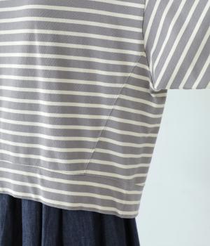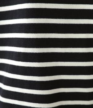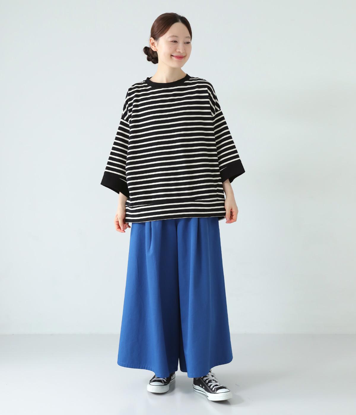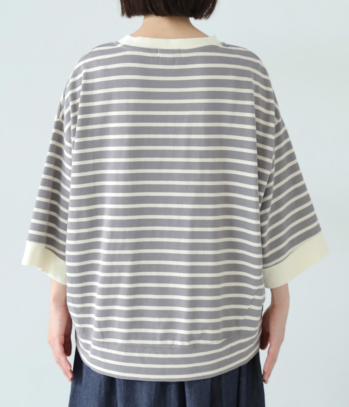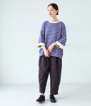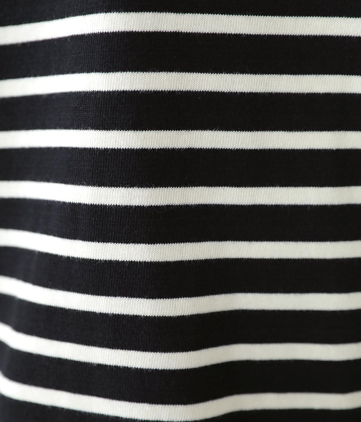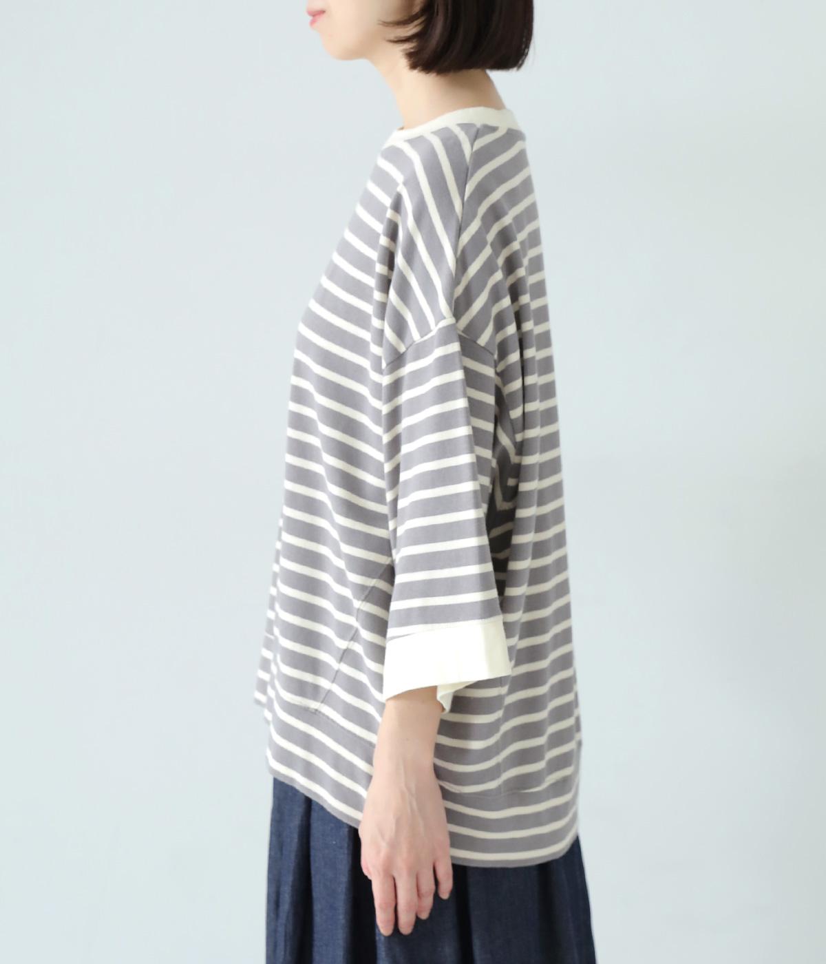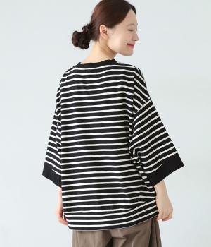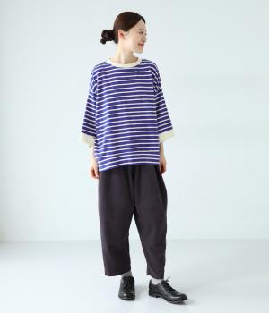 アームホールを広く取ったドルマンスリーブとやや丸みを持たせた身頃がポイントのボーダーTシャツ。体のラインをカバーしつつ計算されたシルエットが洒落感を漂わせます。ネックまわりと袖口の無地切り替えが抜け感をプラス。スカートにもパンツにも合わせやすい使い勝手のよいアイテムです。