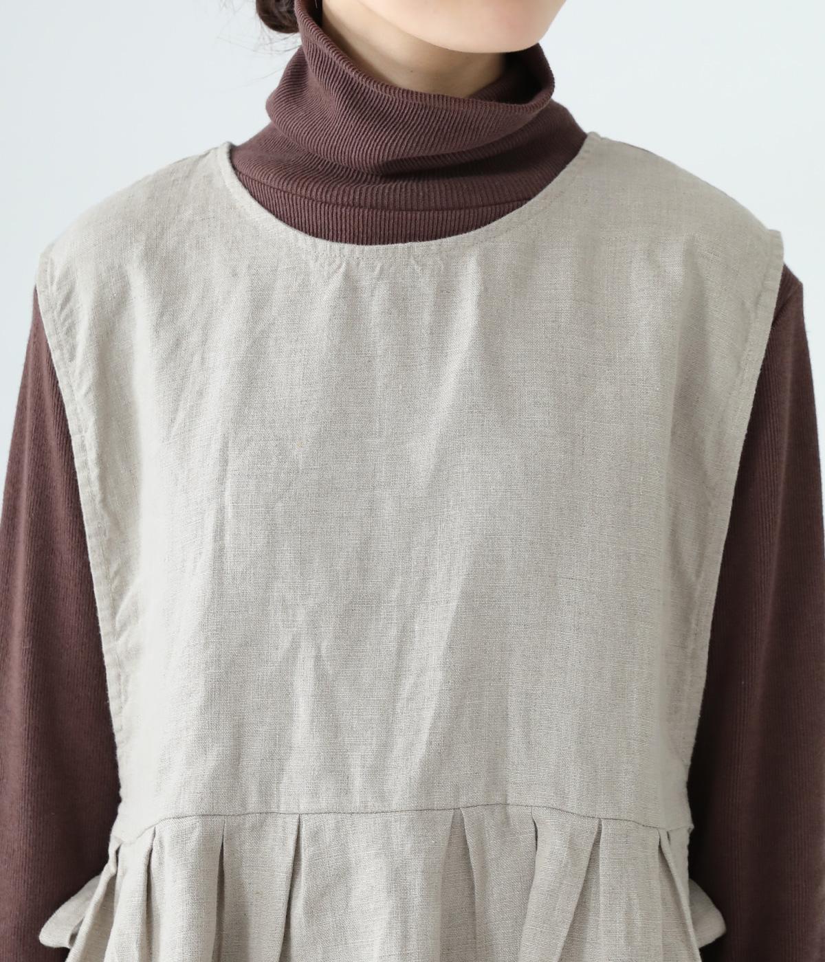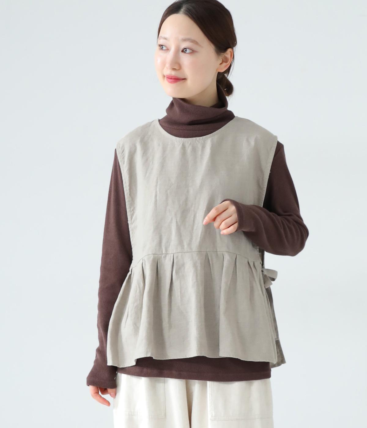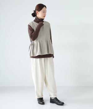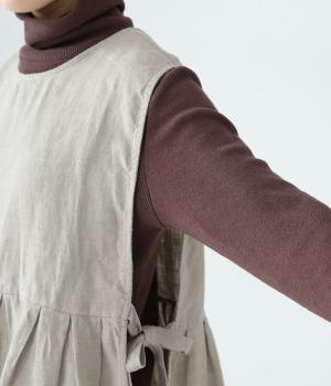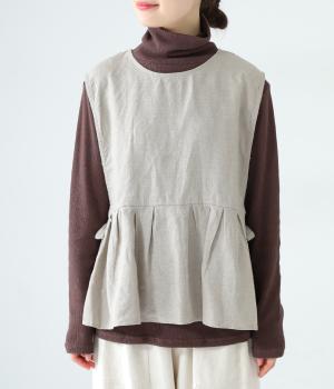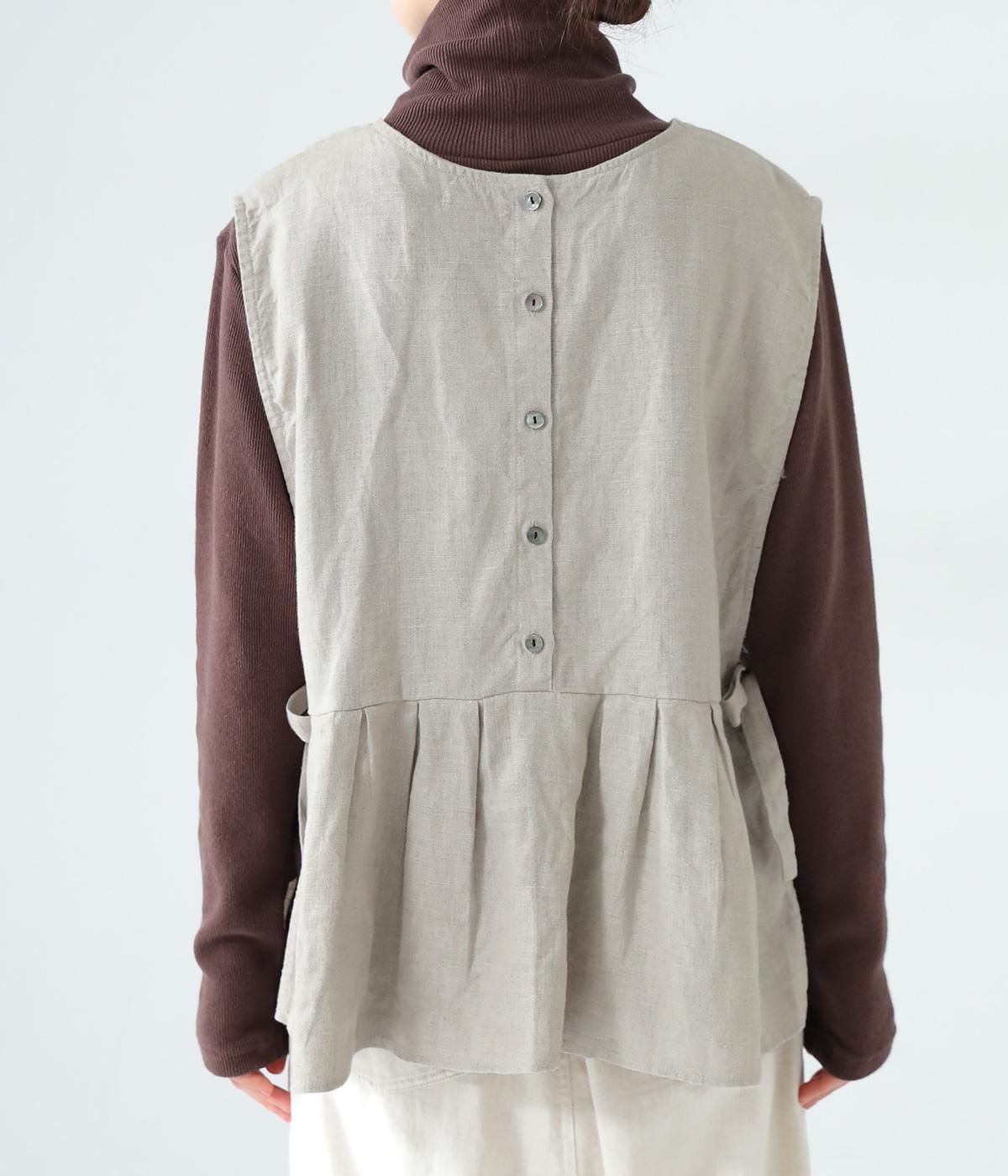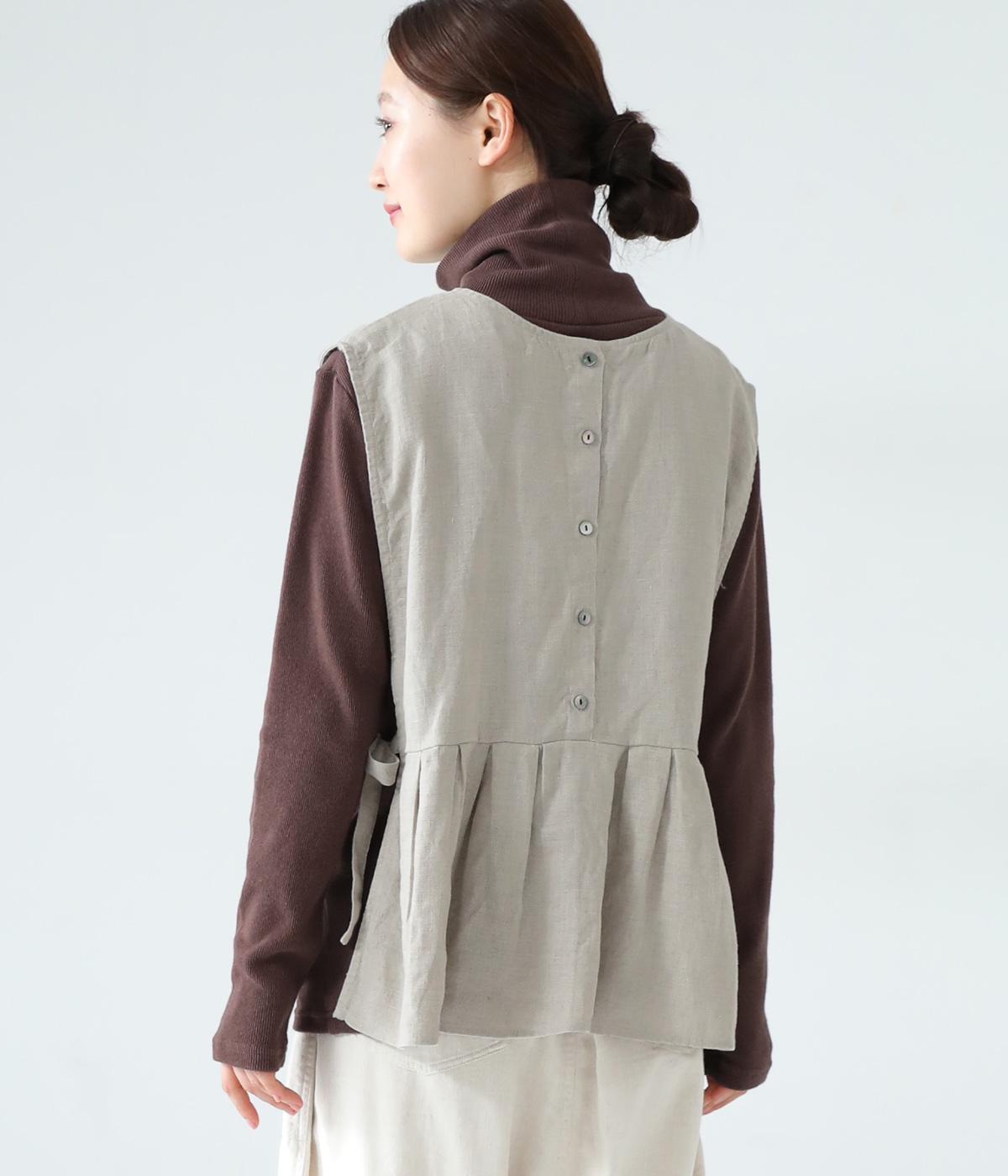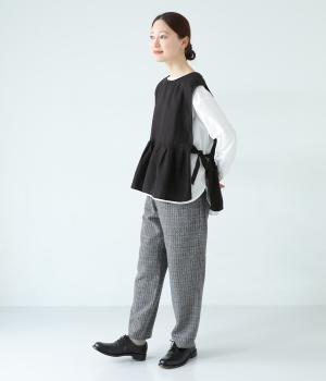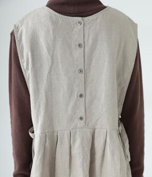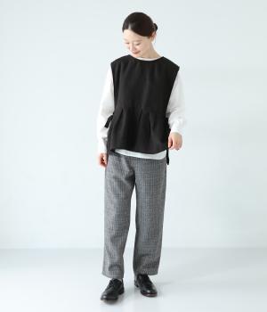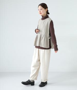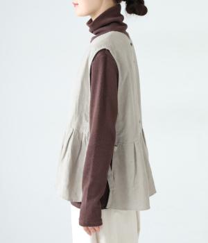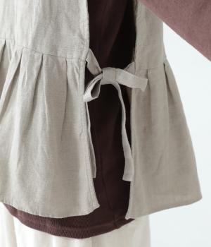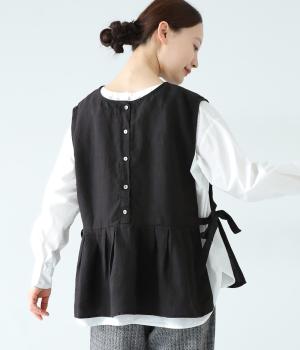 切り替えとタックでふわりと広げたシルエットが魅力のベスト。気になるお腹まわりをカバーし、ウエスト位置を高く見せて全体のバランスをすっきりと整えてくれます。両脇のリボンで身幅を調整できるのも◎。ボタンをアクセントにした後ろ姿も素敵です。