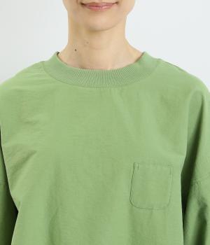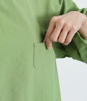 シンプルでしっかりとしたコットン素材。やわらかな伸縮性のあるリブとのコントラストが魅力的です。肌にまとわりつきにくく、通気性もあり、季節を選ばず気軽に着用できます。