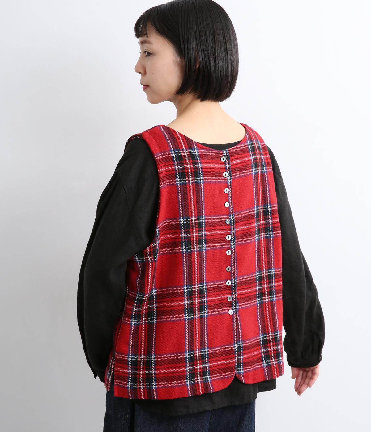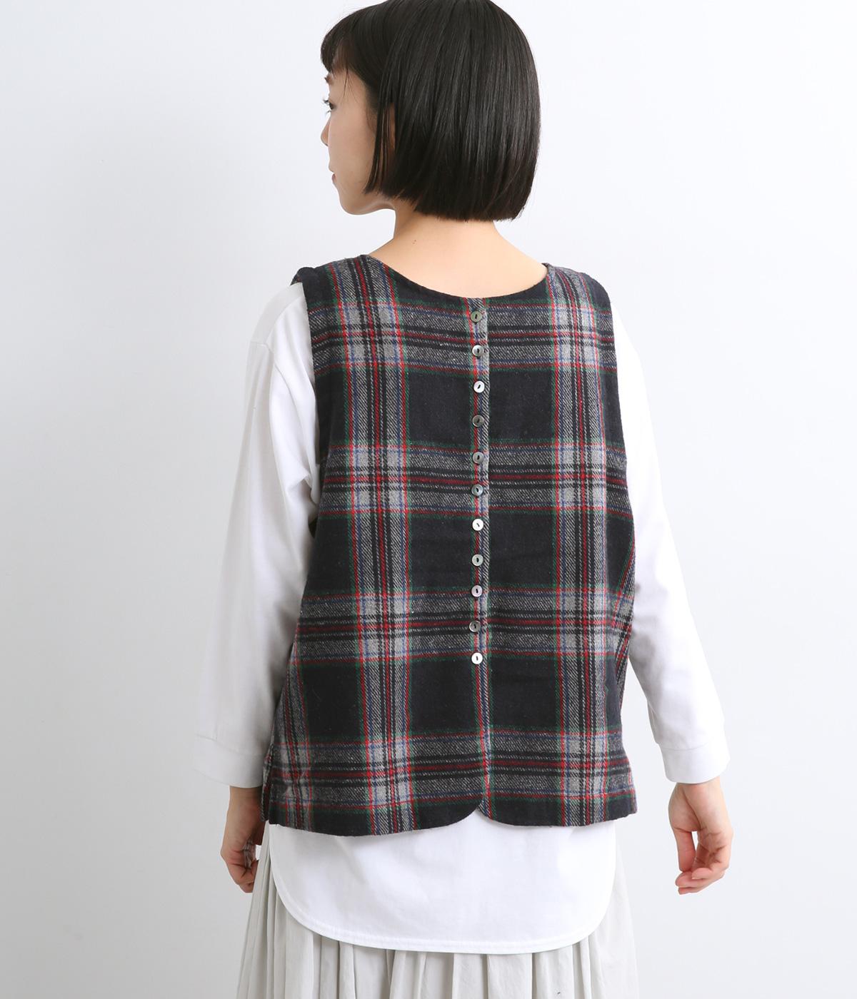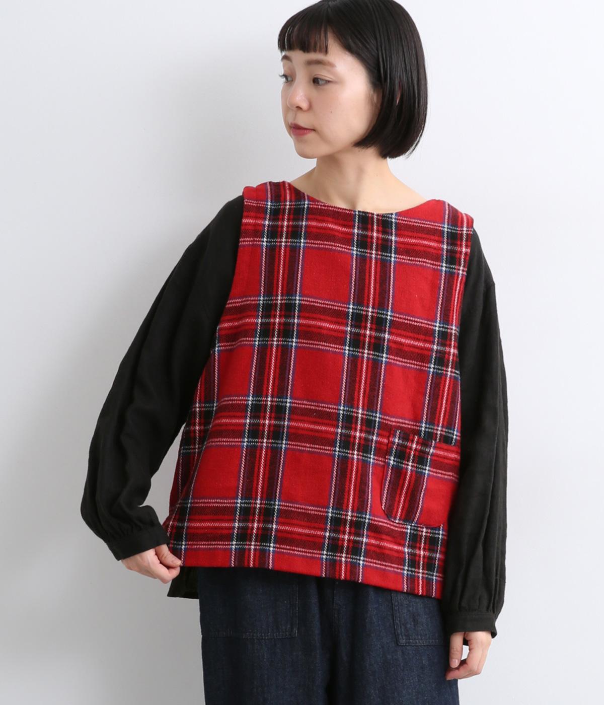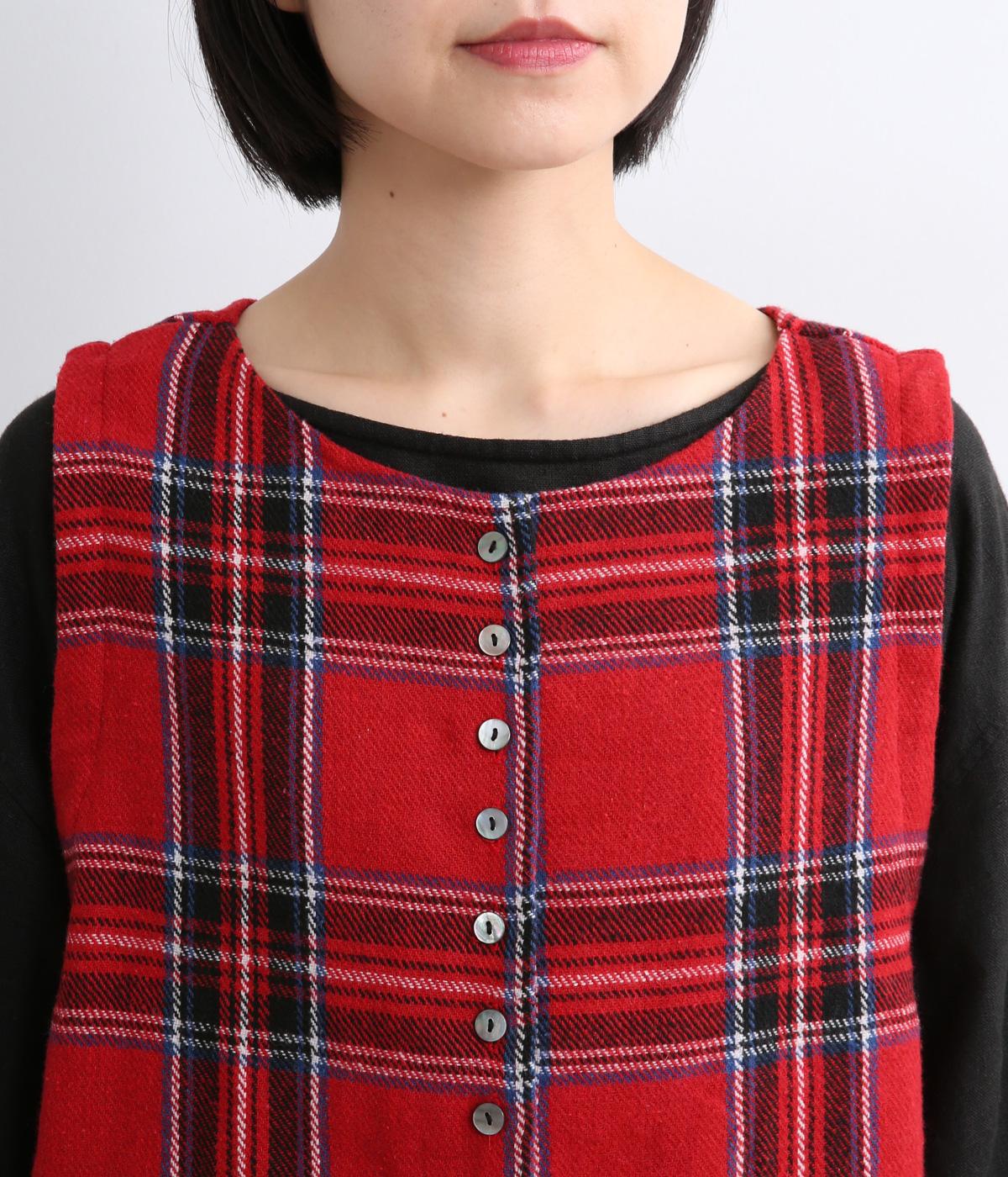 前あきとプルオーバー風、二つの着こなしがたのしめる前後2way仕様です。クラシカルなタータンチェック柄が季節感を引き立て、たくさん並んだ小さなボタンが上品なアクセントに。プルオーバー面は、シンプルななかに、さり気なくポケットをあしらいました。羽織るだけで、コーディネートに華やぎを添えるアイテムです。