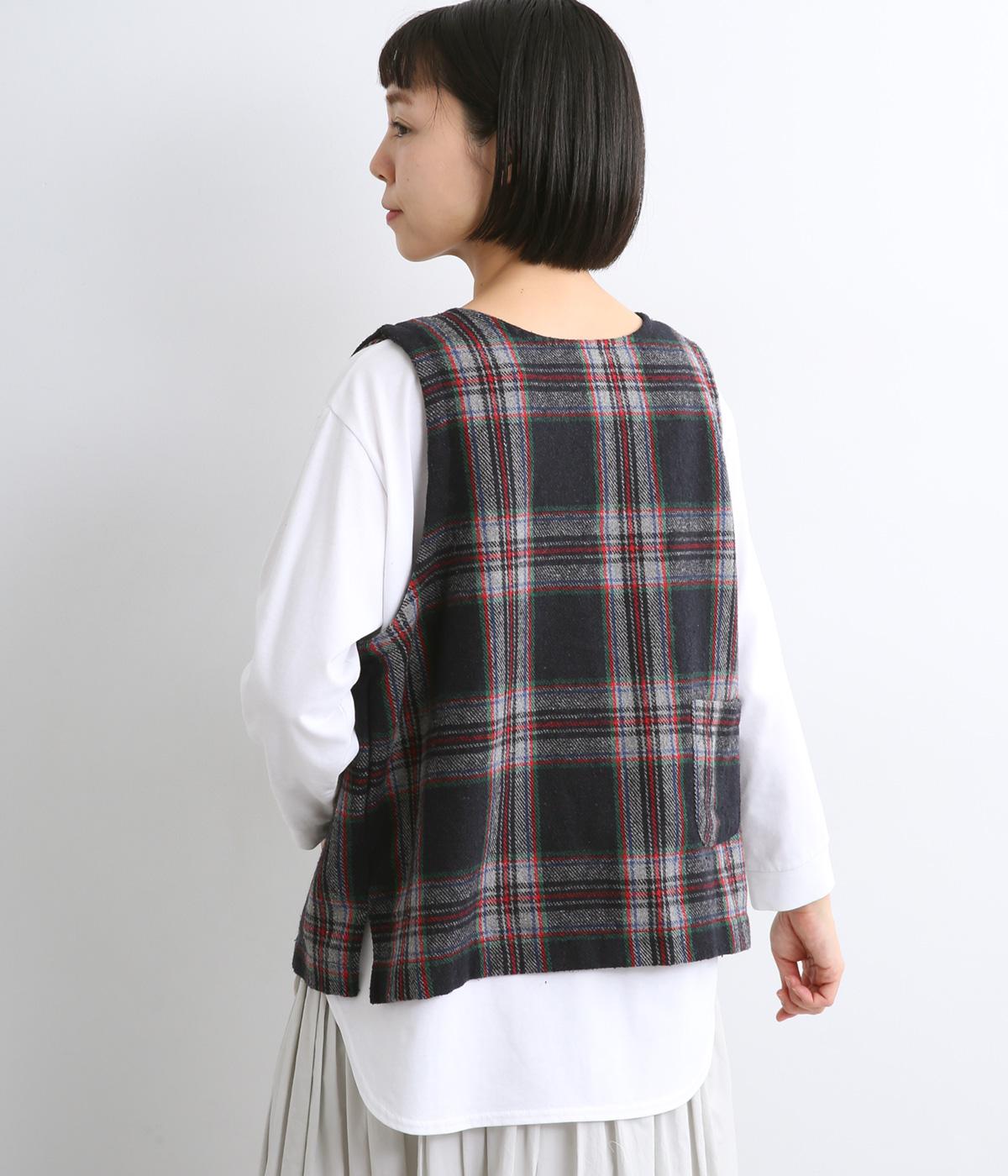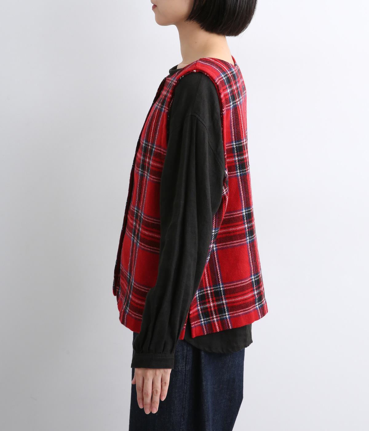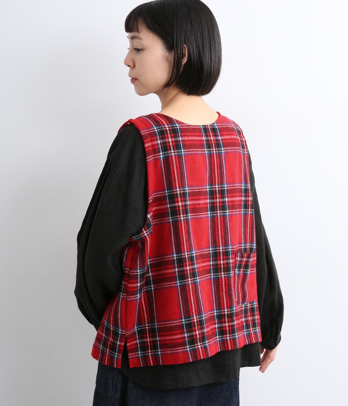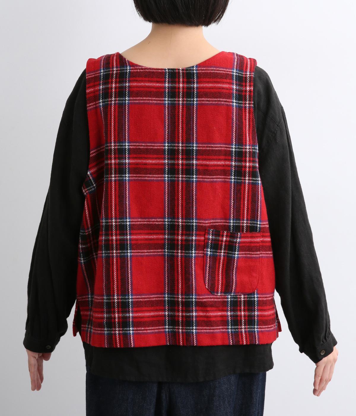 前あきとプルオーバー風、二つの着こなしがたのしめる前後2way仕様です。クラシカルなタータンチェック柄が季節感を引き立て、たくさん並んだ小さなボタンが上品なアクセントに。プルオーバー面は、シンプルななかに、さり気なくポケットをあしらいました。羽織るだけで、コーディネートに華やぎを添えるアイテムです。
