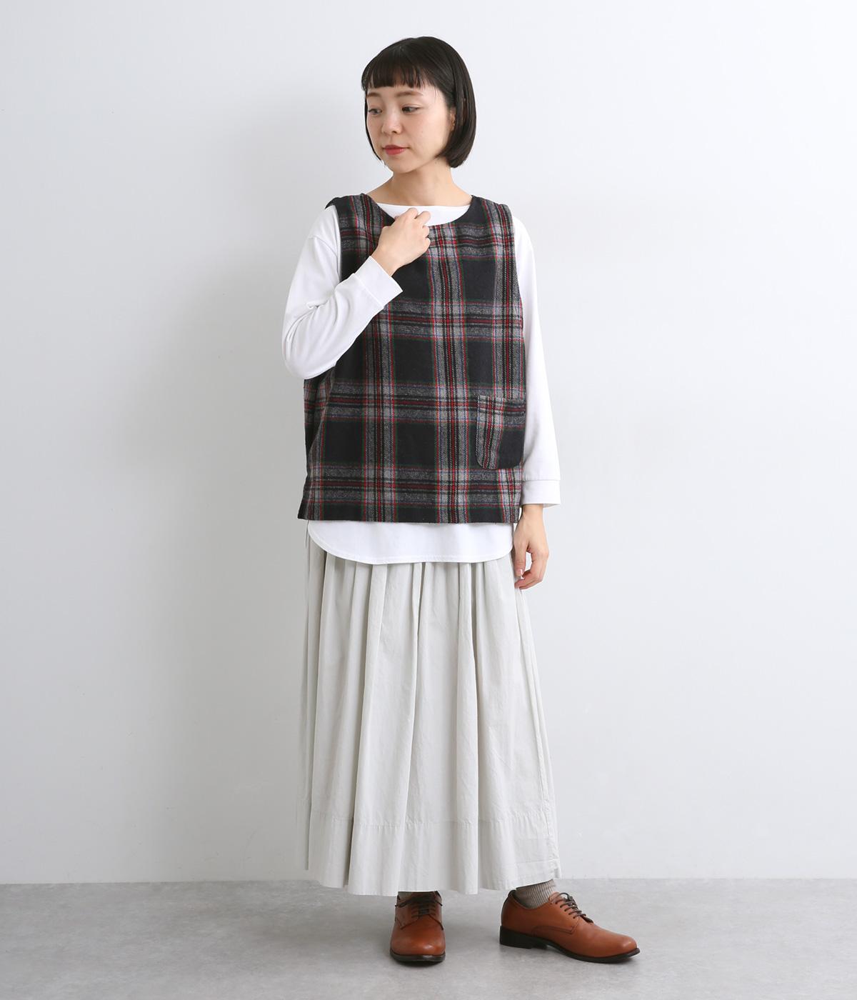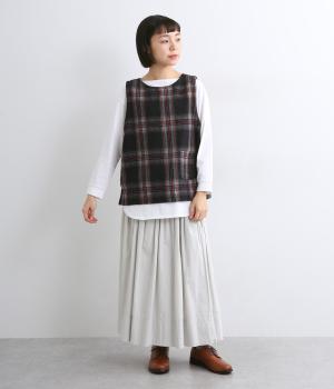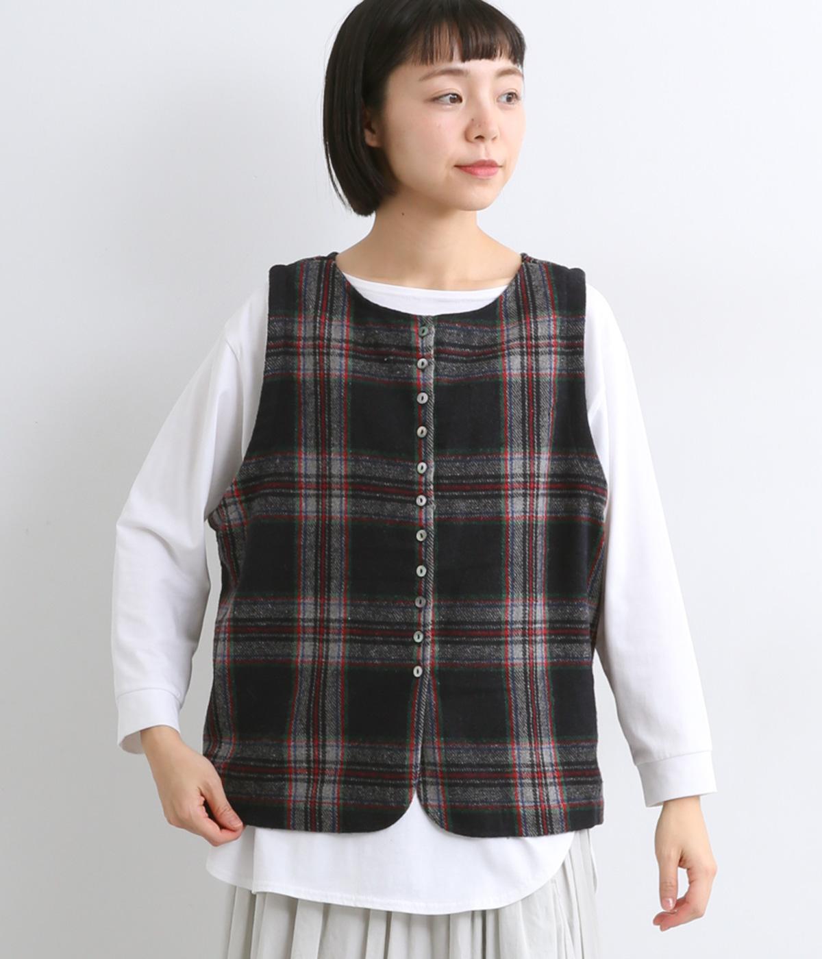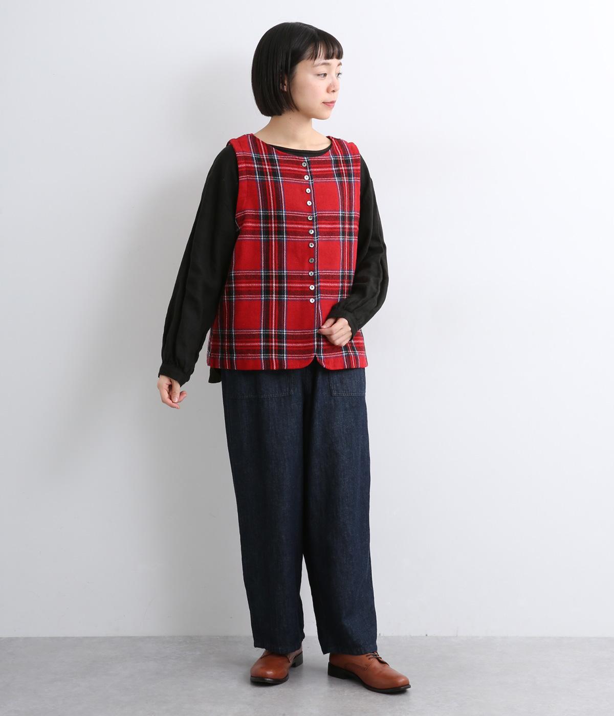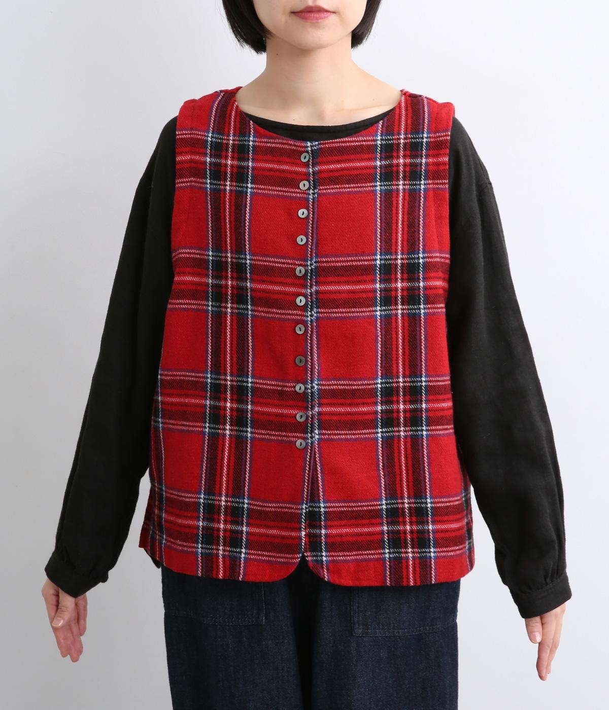 前あきとプルオーバー風、二つの着こなしがたのしめる前後2way仕様です。クラシカルなタータンチェック柄が季節感を引き立て、たくさん並んだ小さなボタンが上品なアクセントに。プルオーバー面は、シンプルななかに、さり気なくポケットをあしらいました。羽織るだけで、コーディネートに華やぎを添えるアイテムです。