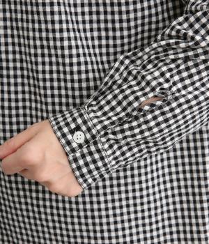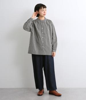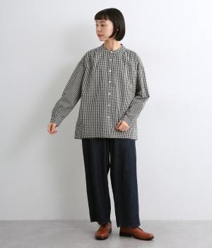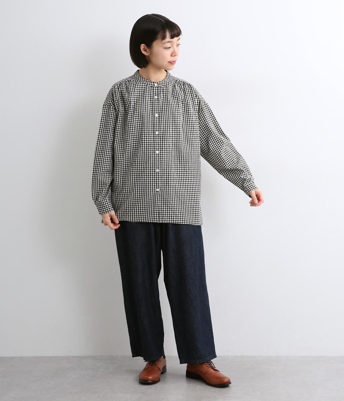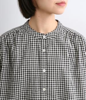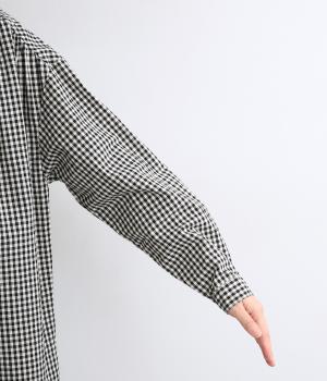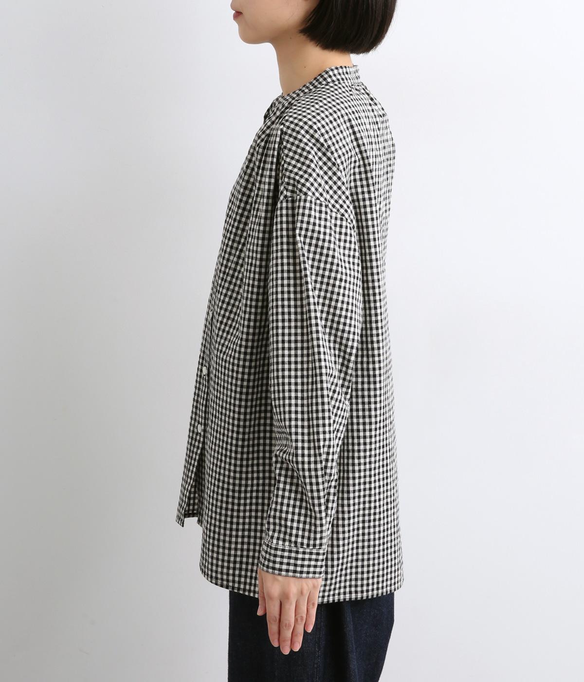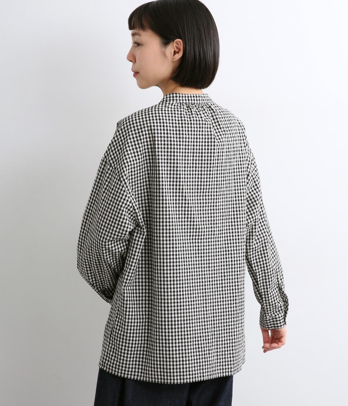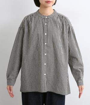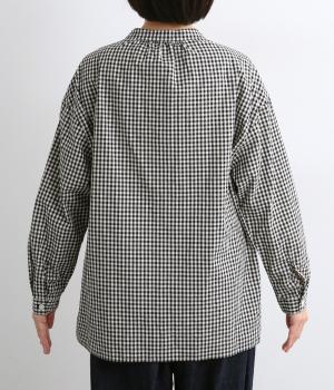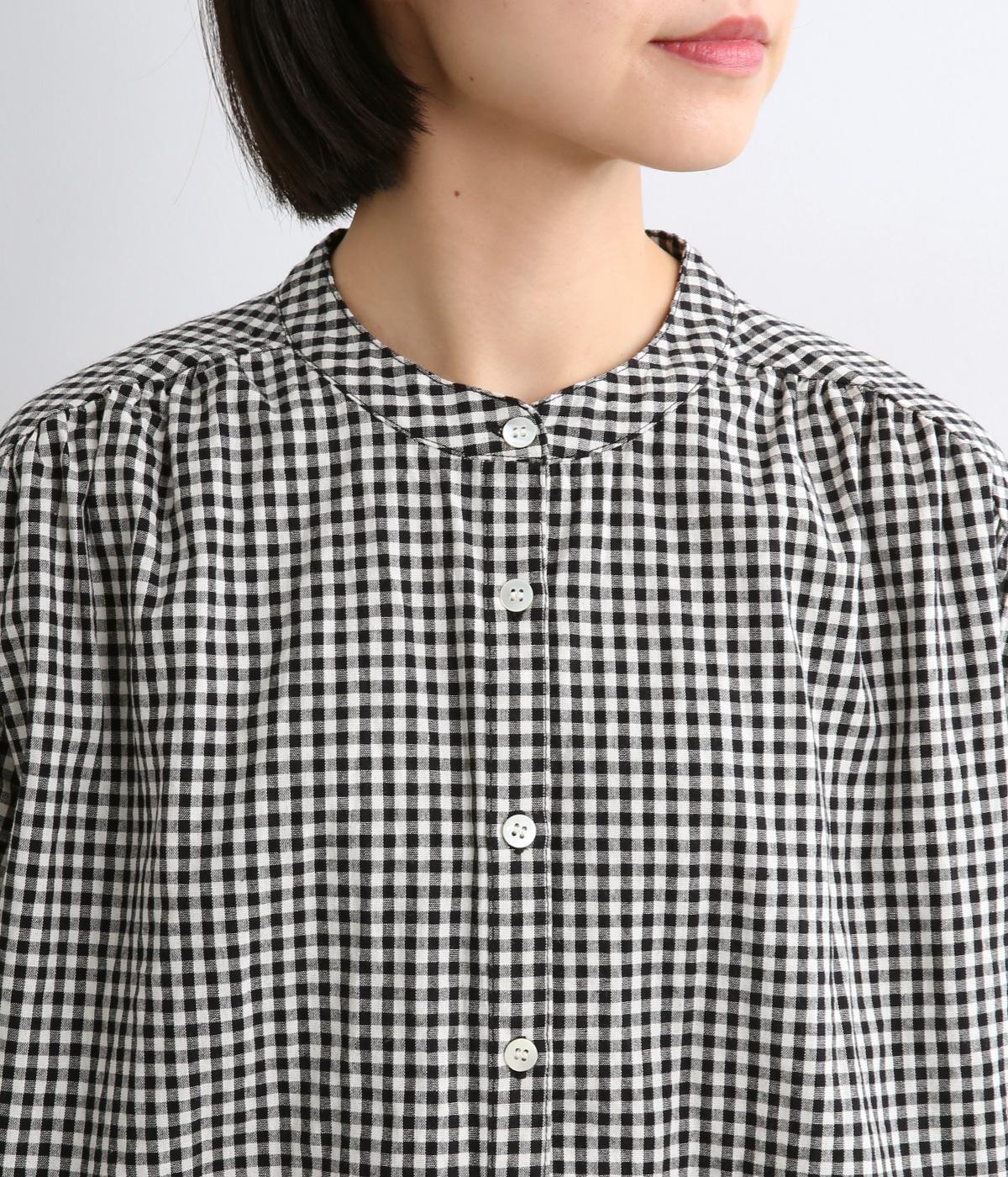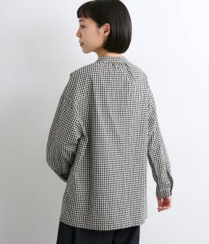 ギンガムチェックのかわいらしさに、上品なスタンドネックを合わせた大人のブラウスです。肩と背中に寄せた繊細なギャザーがやわらかく広がり、ふんわりとしたシルエットをつくります。袖にもほどよい丸みを持たせ、やさしい雰囲気を演出しました。カジュアルにもきれいめにも合わせやすい、着まわし力のある一枚です。