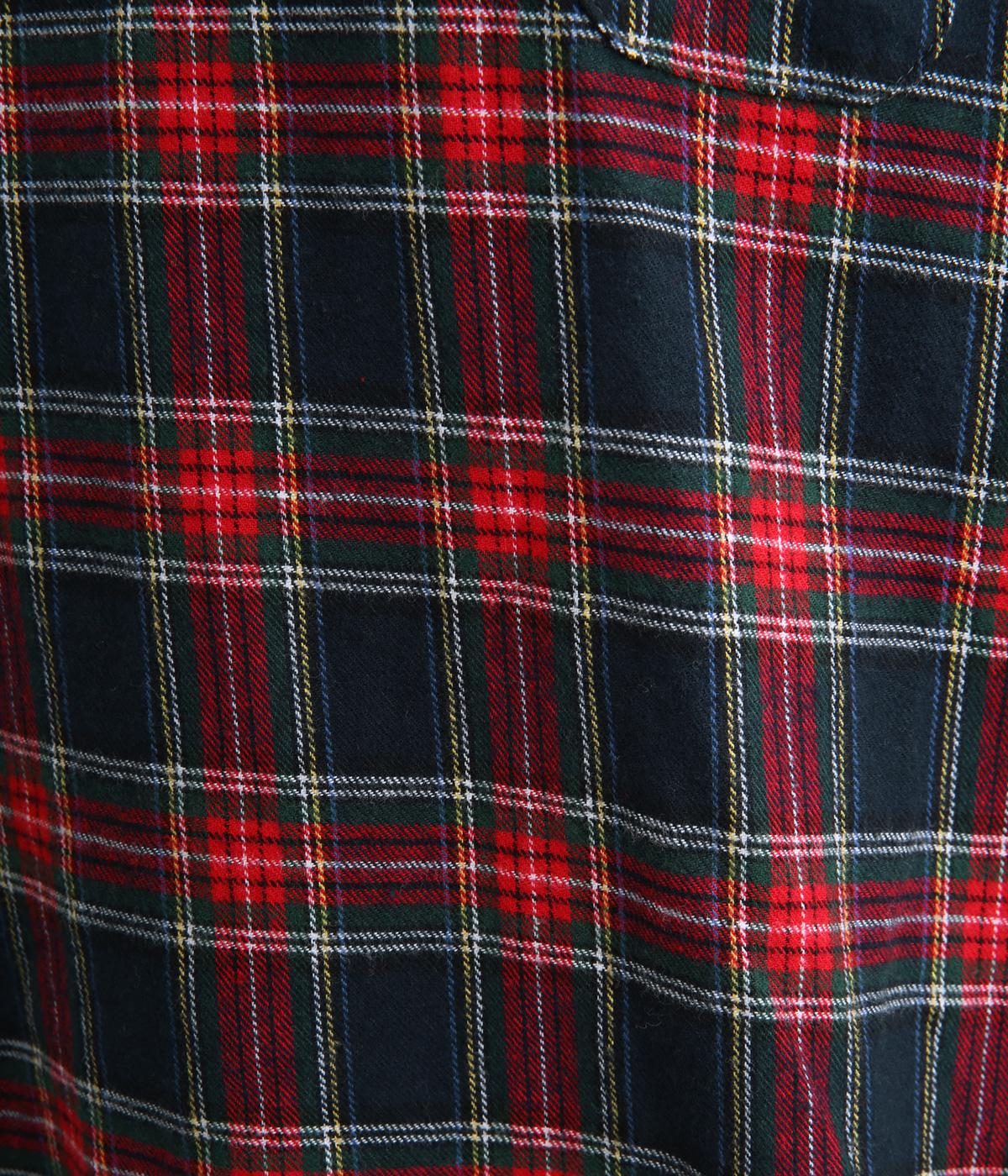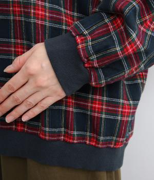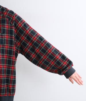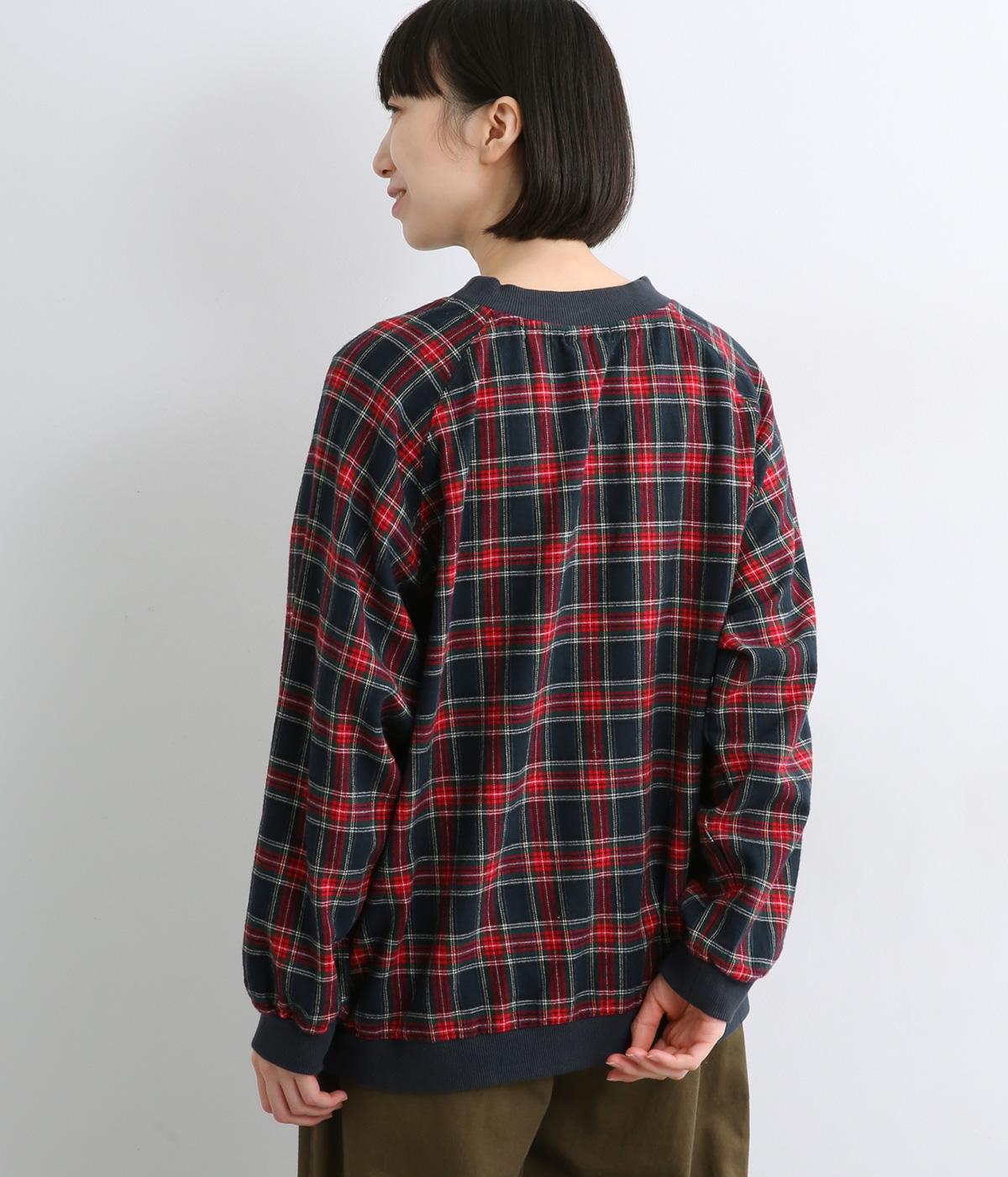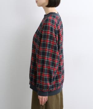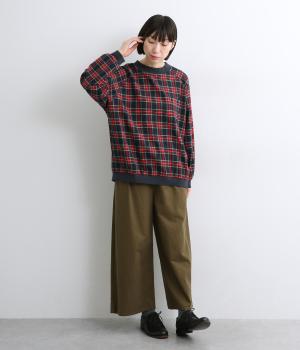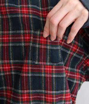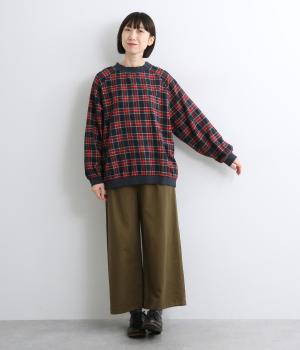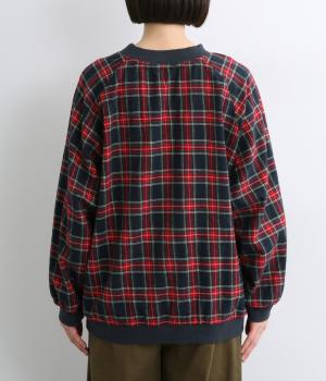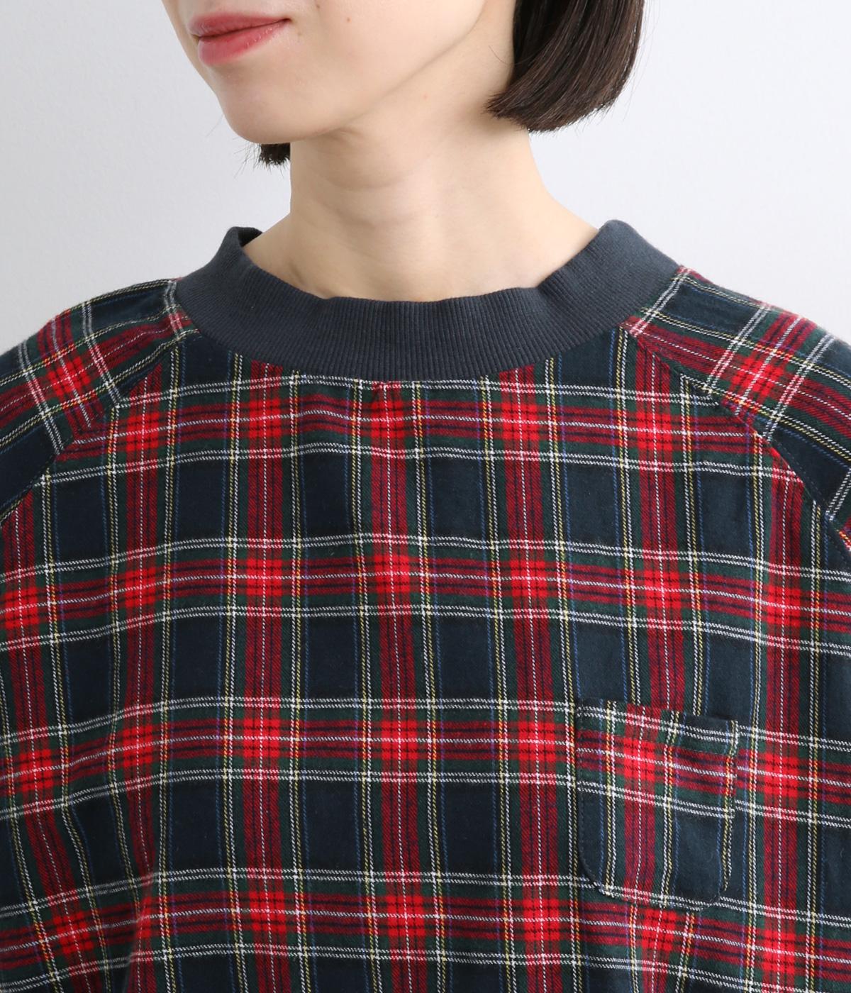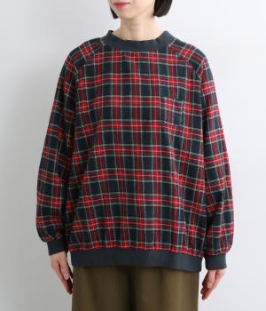 先染めならではの、奥行きのあるタータンチェック柄が印象的なブラウス。ラグランスリーブなので、肩まわりの着心地も快適です。バルーン形状の袖と、丸みを持たせた裾が、ふんわりとした立体感を演出。伸縮性のあるリブでメリハリをあたえつつ、胸元のミニポケットがかわいらしいアクセントになっています。