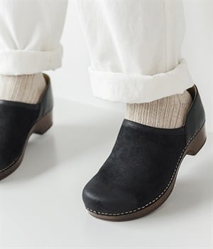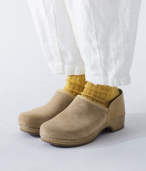 コロンとしたナチュラルな見た目かわいい、柔らかなスエードレザーのクロッグスです。アッパー部分はスコッチガード加工の牛革で仕立てました。抗菌防臭加工のライニングや、足裏にフィットする EVA フットベッド、衝撃を吸収する軽量成型 EVA ミッドソールなど、快適な履き心地をサポートする機能性の高さも魅力的。素足にはもちろんソックスを合わせても素敵です。
