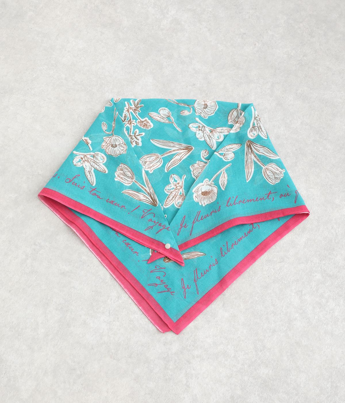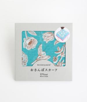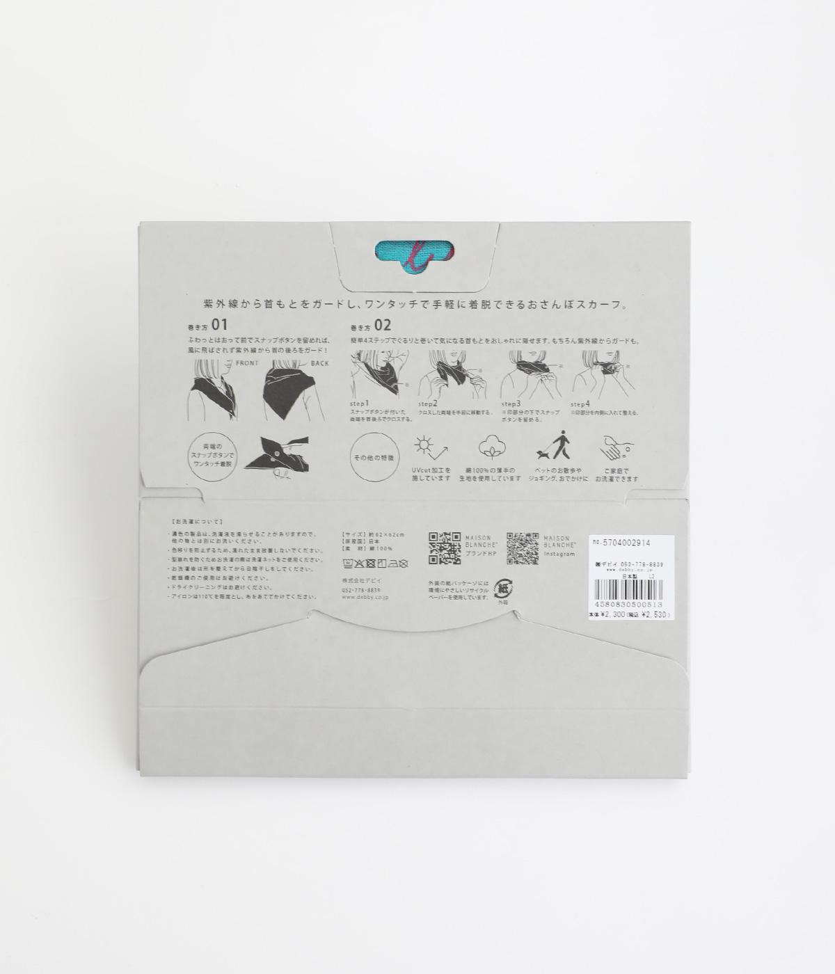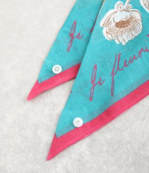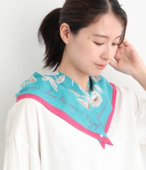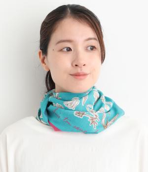 手描き風のタッチで花々を描いたスカーフ。ボタン式のワンタッチで着脱でき、巻き方に迷わず手軽にアレンジが楽しめます。紫外線から首もとをガードし、風に飛ばされにくいのもうれしいポイントです。