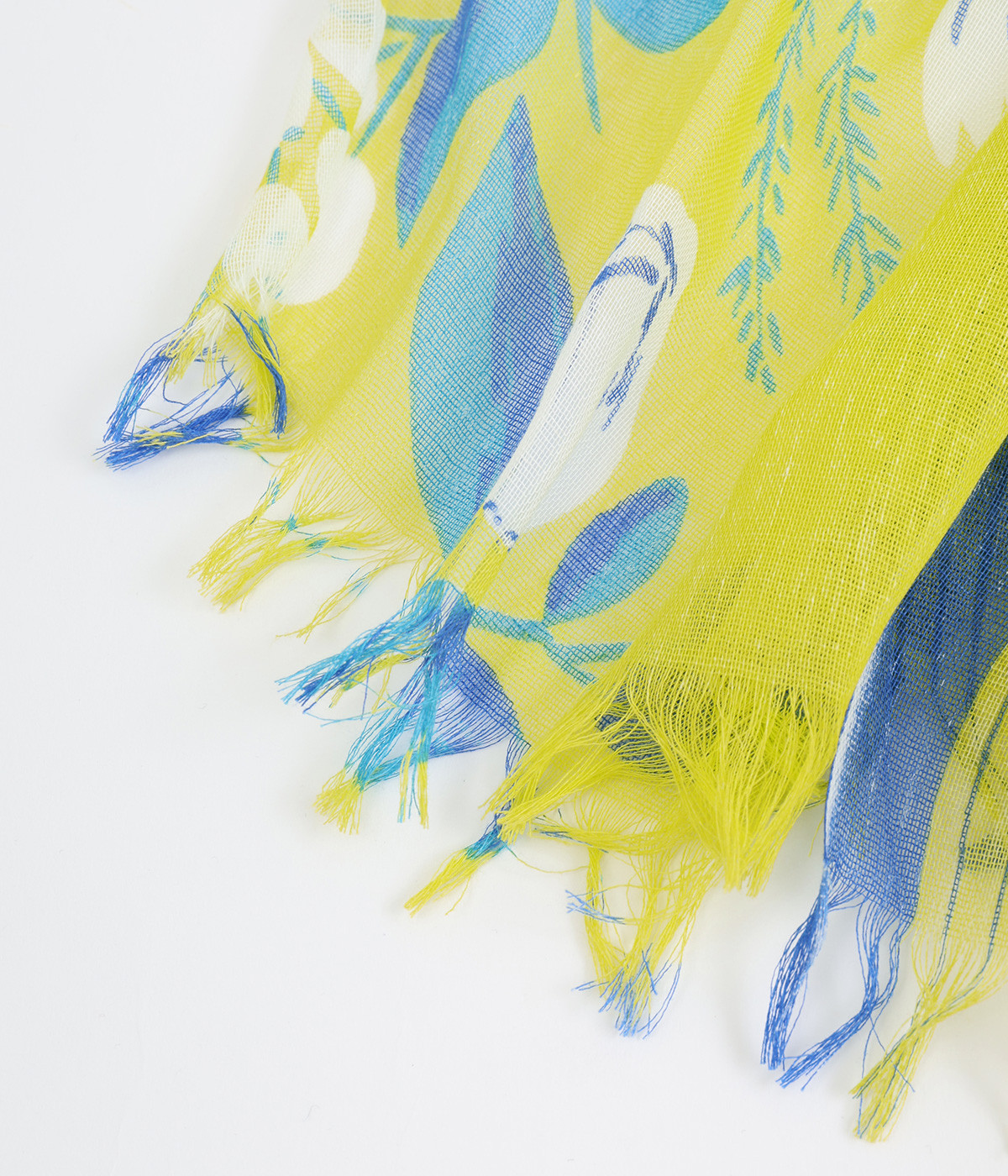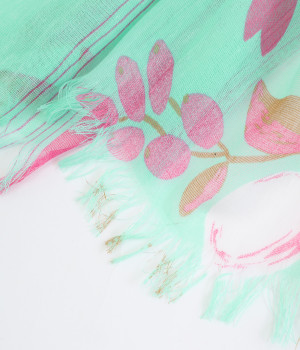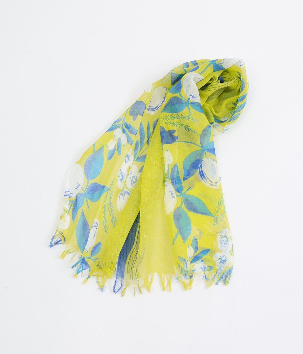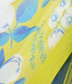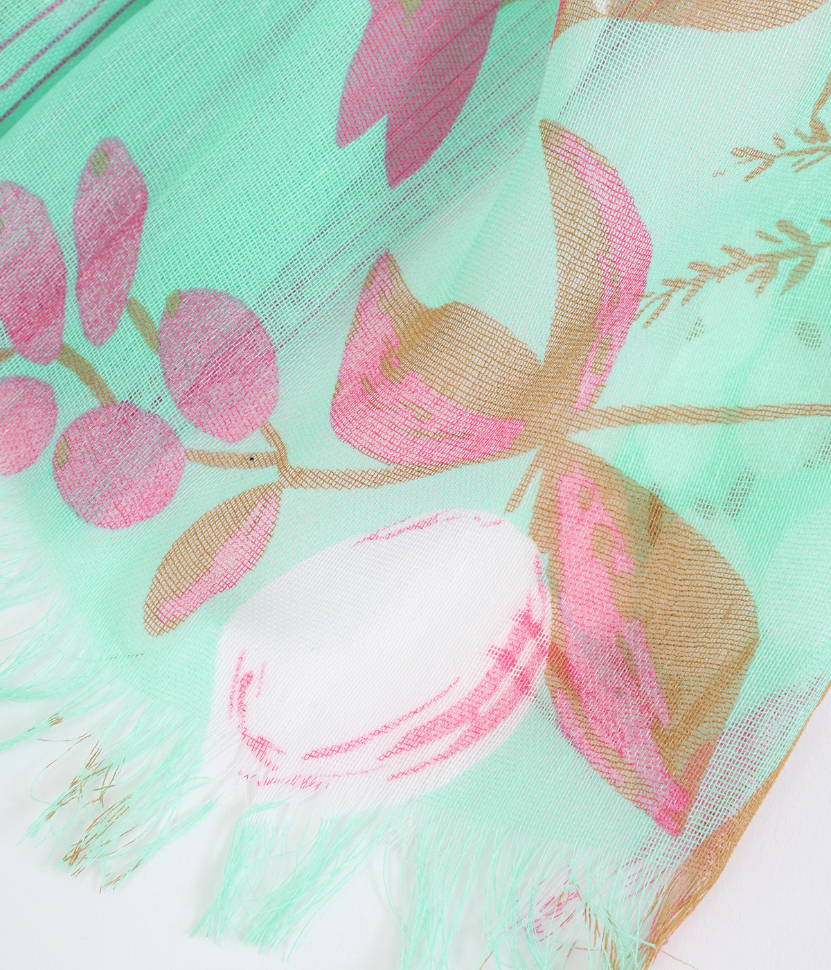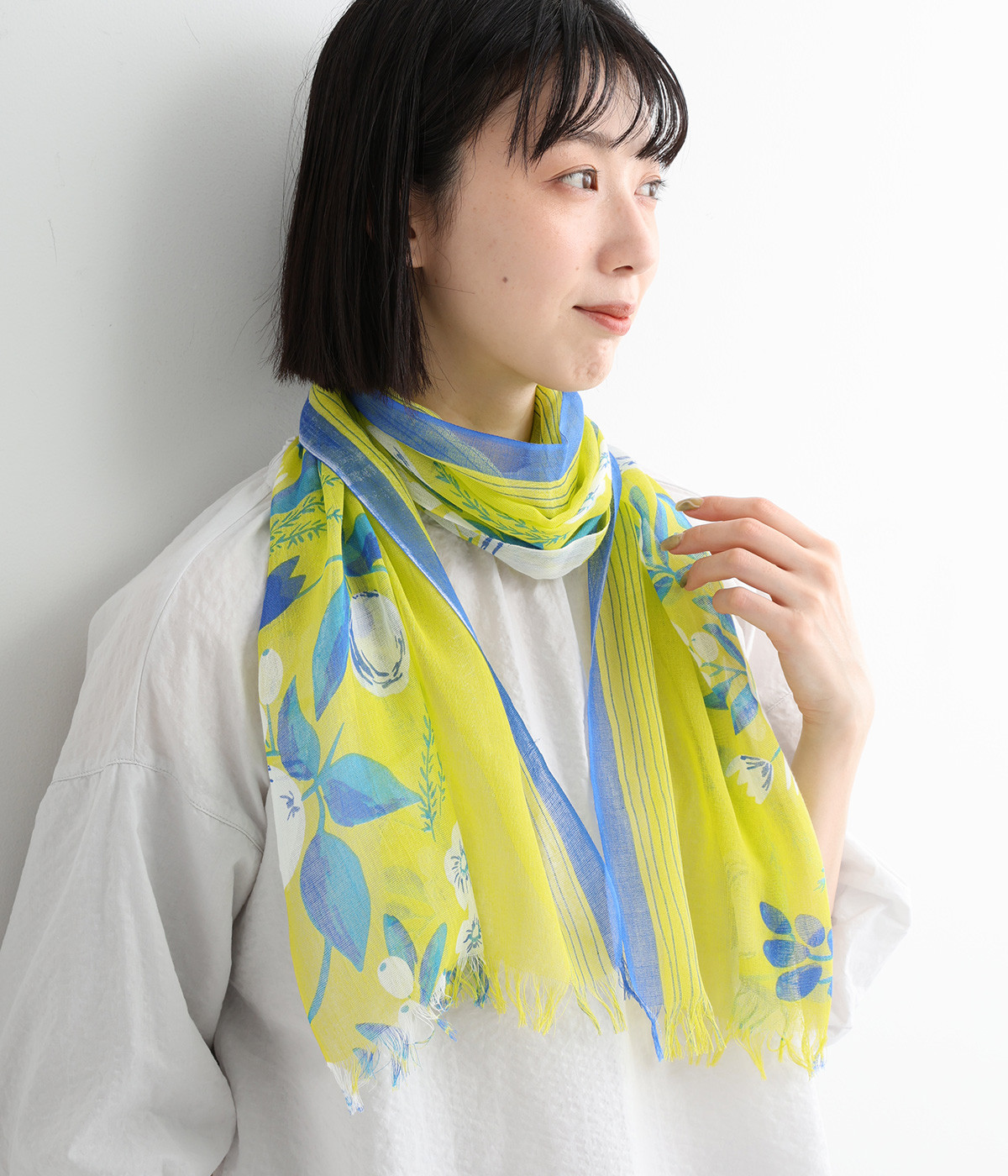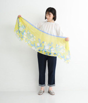 ぱりっとした素朴な風合いがさわやかで、軽いつけ心地の生地。薄手に作られているのでほどよい透け感があります。フルーツをプリントしてみずみずしさを印象づけ。