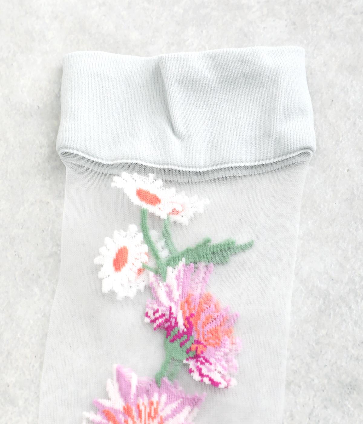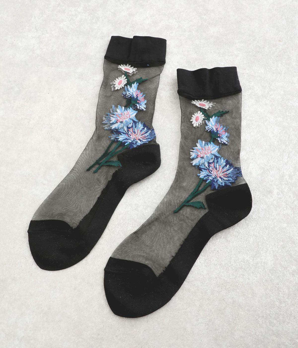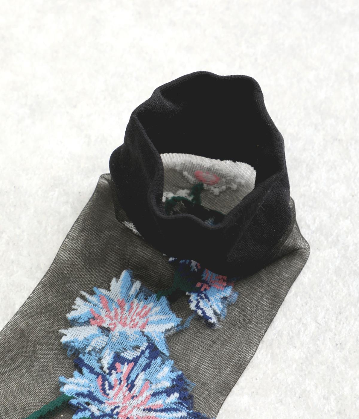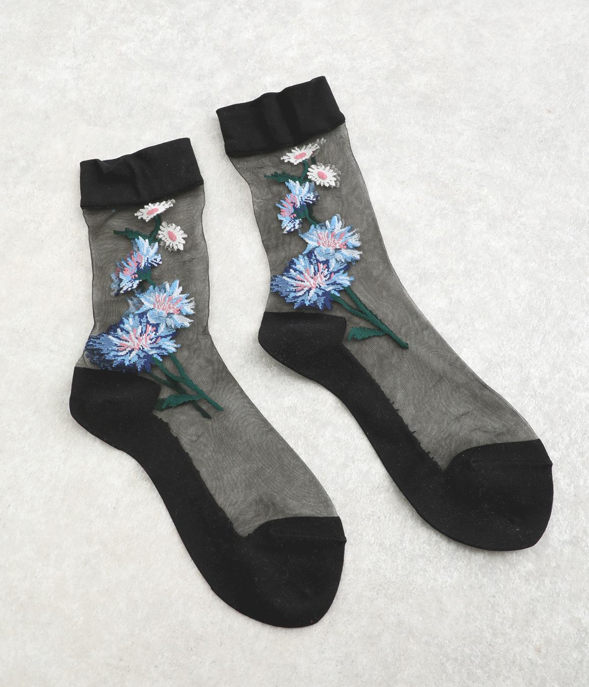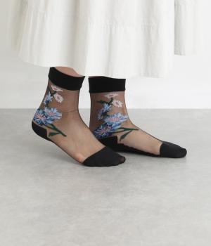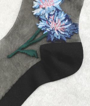 薄手のシースルー素材に、コーンフラワー柄をあしらったソックス。鮮やかな色が散りばめられたデザインが足もとに春らしい彩りを添えます。履くだけでさりげなく旬のムードを演出します。