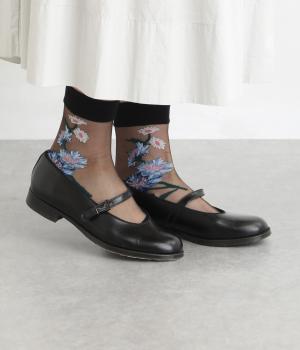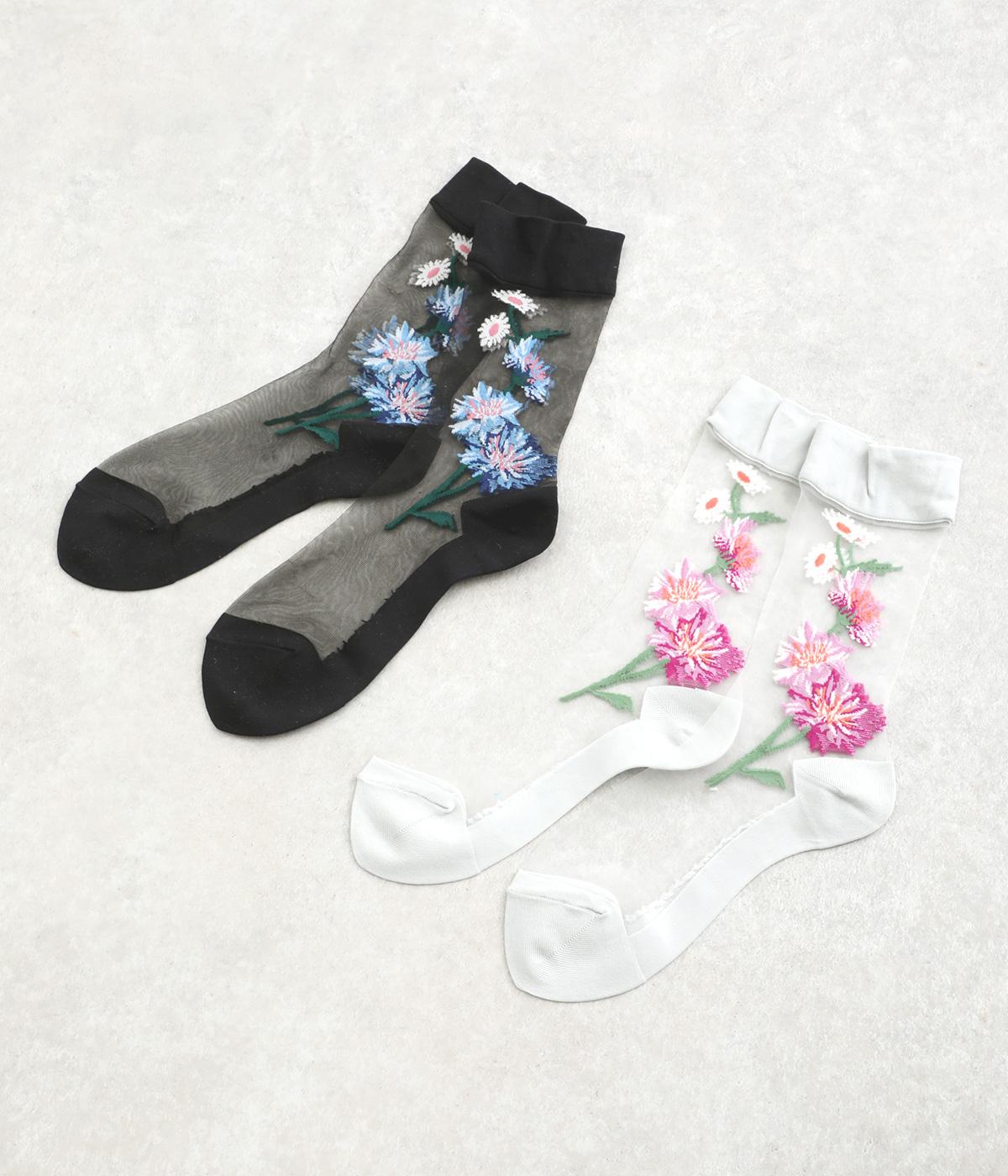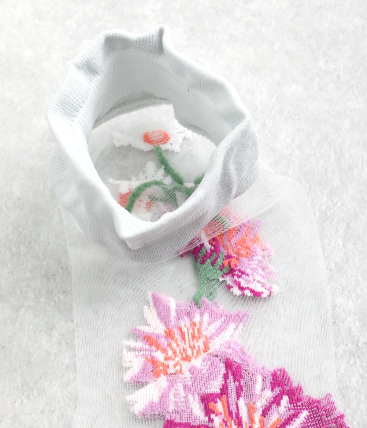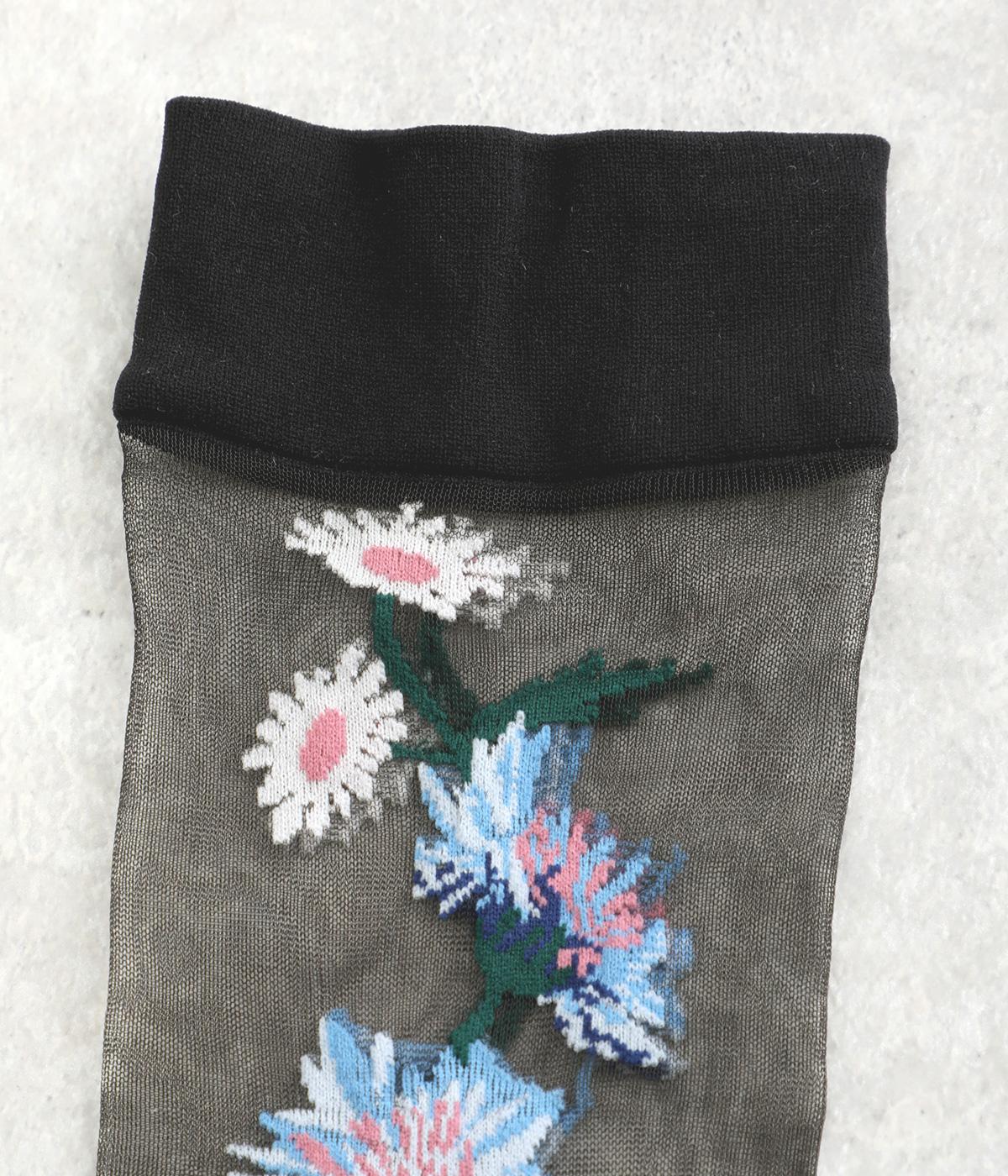 薄手のシースルー素材に、コーンフラワー柄をあしらったソックス。鮮やかな色が散りばめられたデザインが足もとに春らしい彩りを添えます。履くだけでさりげなく旬のムードを演出します。