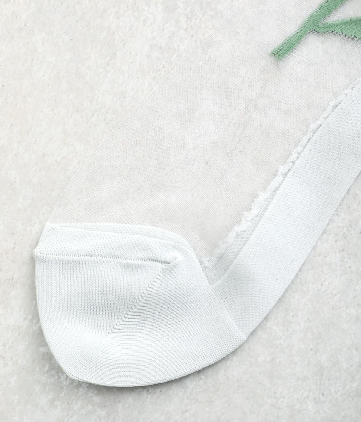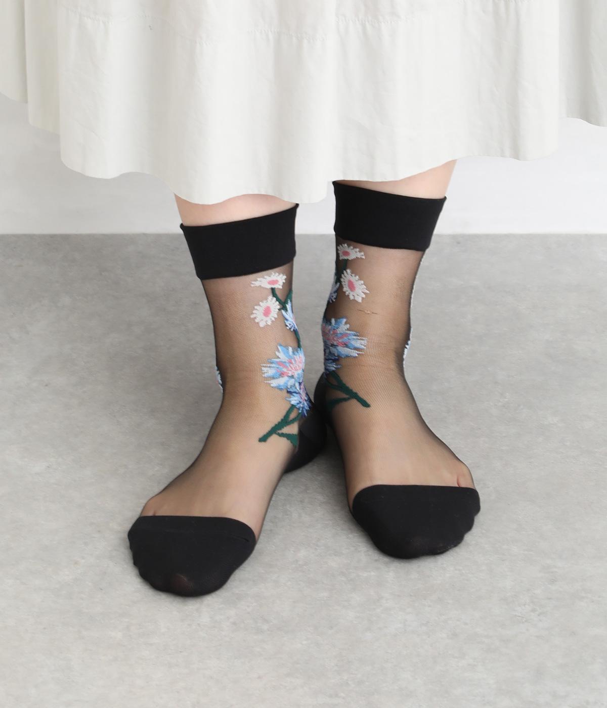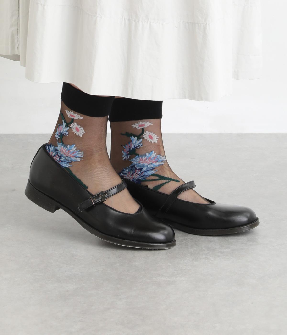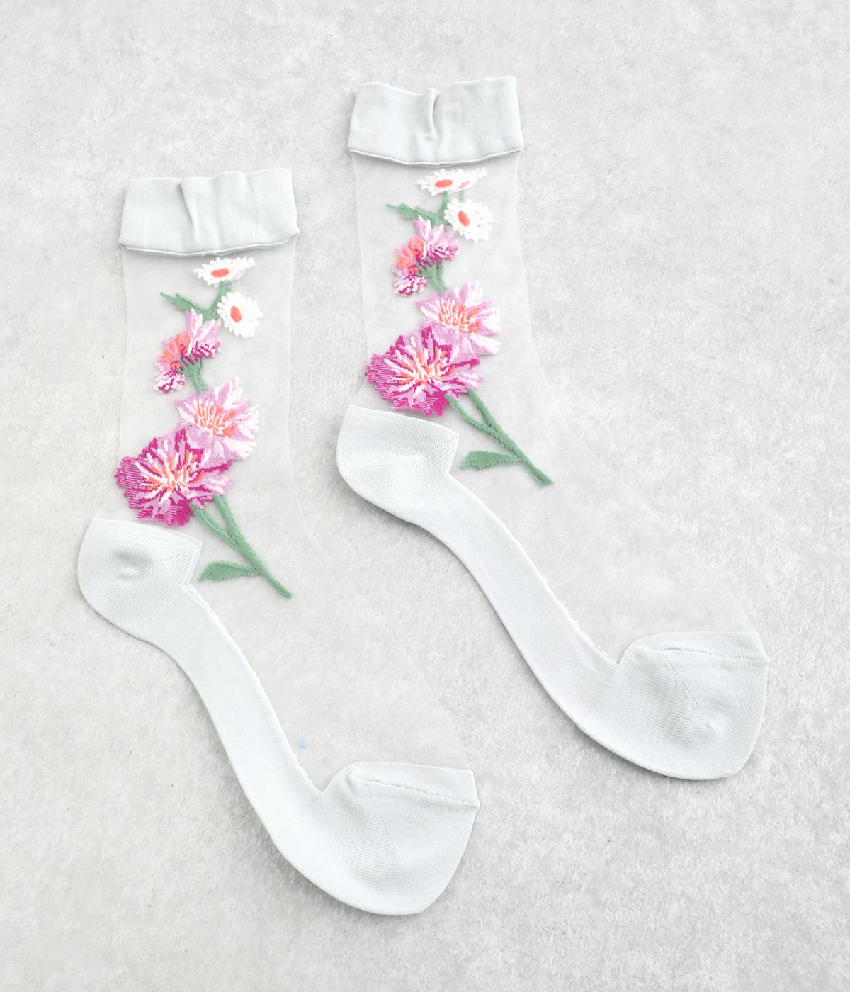 薄手のシースルー素材に、コーンフラワー柄をあしらったソックス。鮮やかな色が散りばめられたデザインが足もとに春らしい彩りを添えます。履くだけでさりげなく旬のムードを演出します。