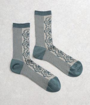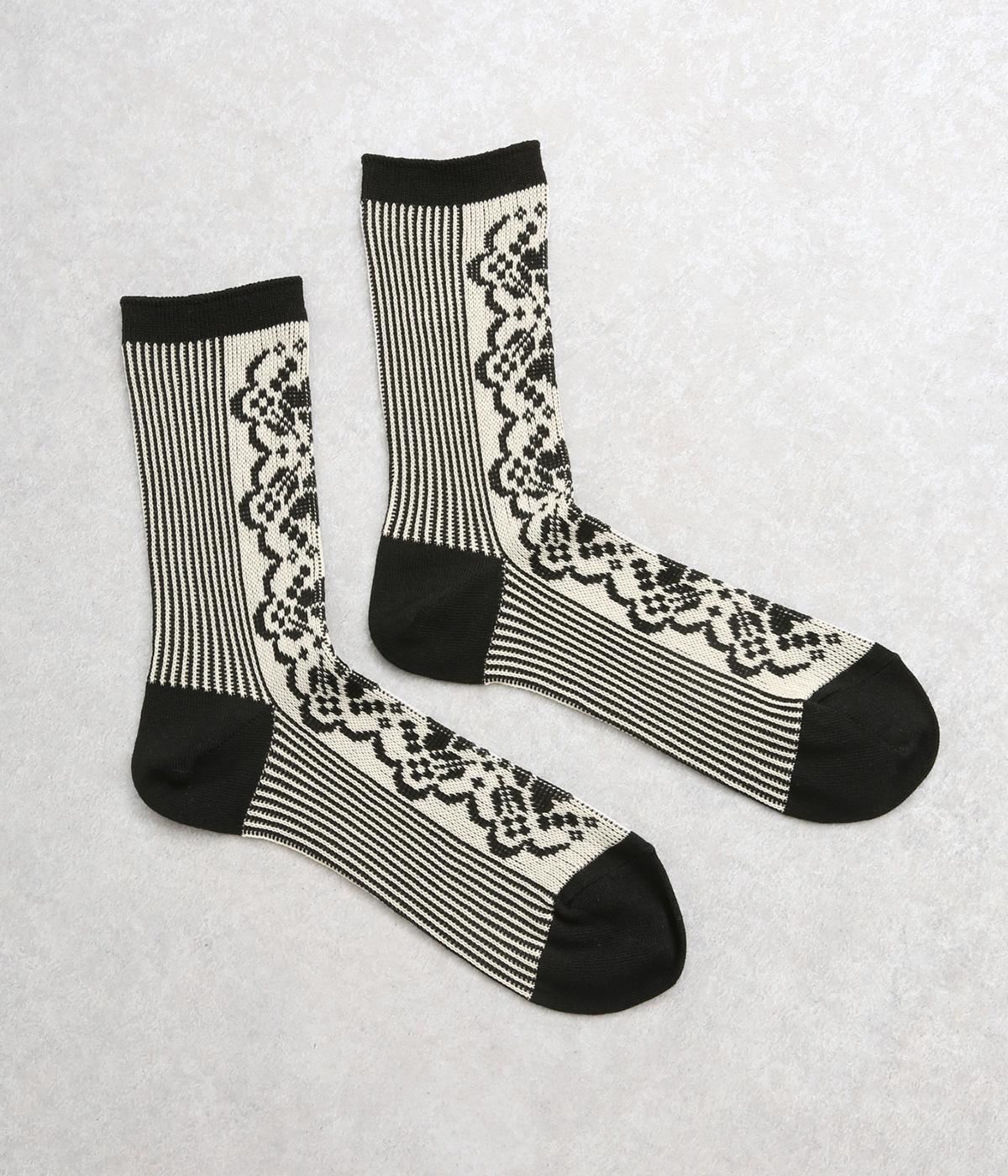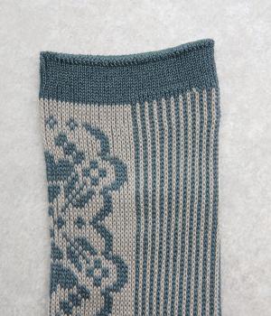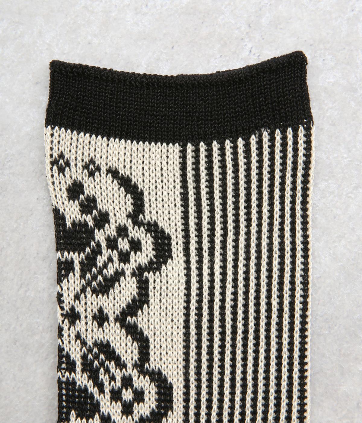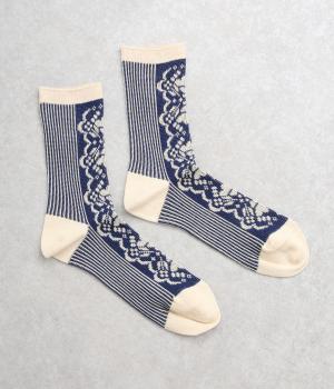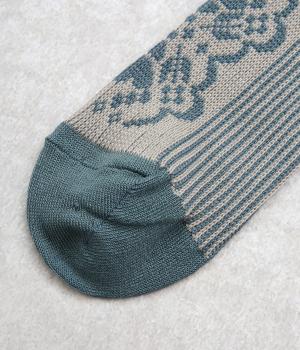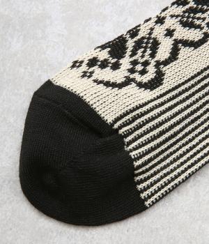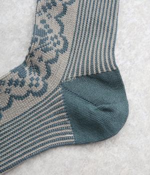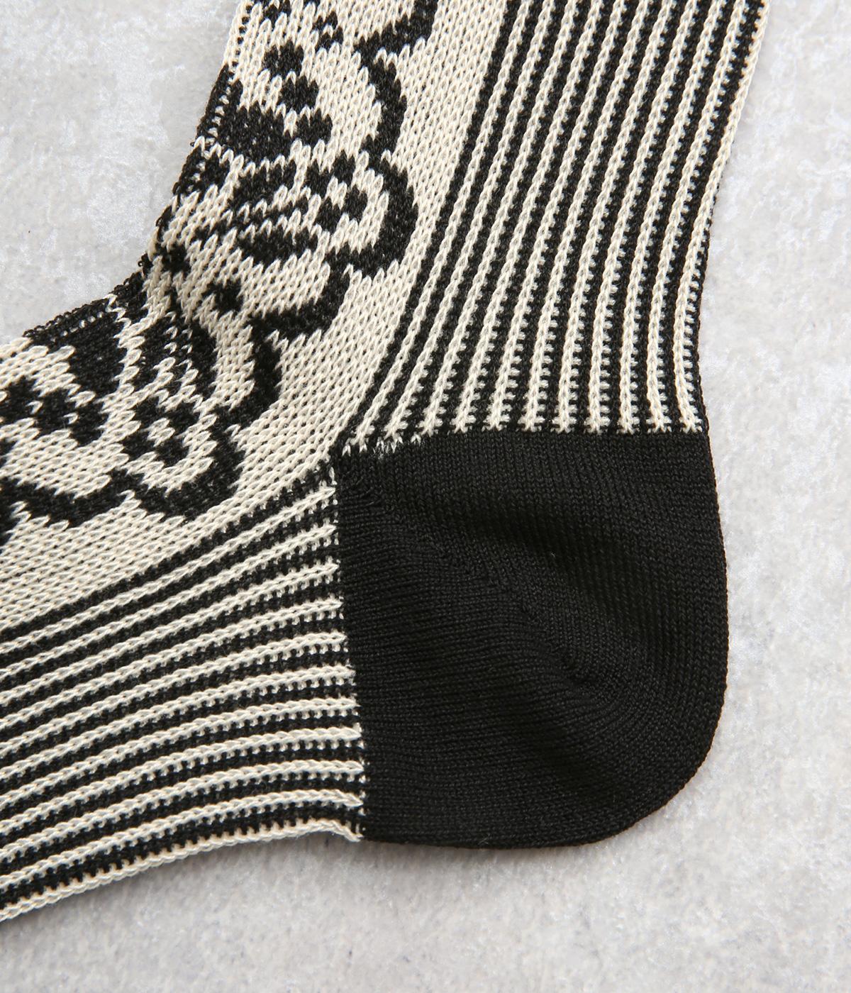 パーティの華やかな光景をイメージした、足元のワンポイントになるソックス。フロントは花柄、後ろはストライプと、前後で印象が変わってどこから見てもお洒落に。シックな配色なのでコーディネートに取り入れやすいのも魅力。