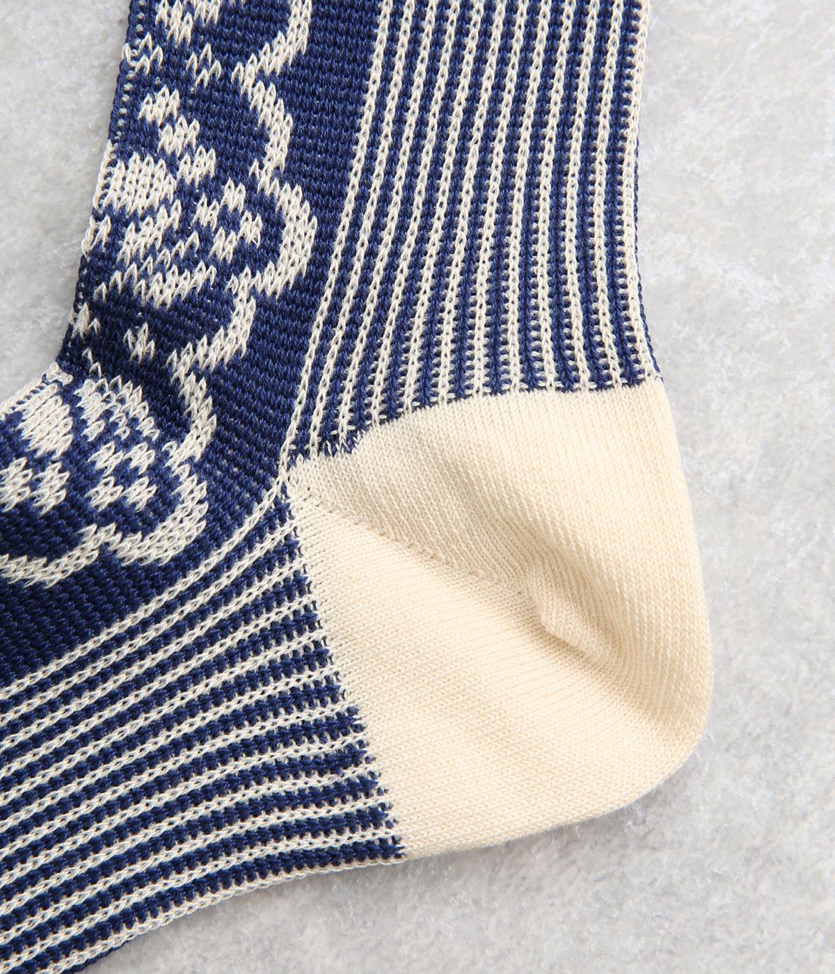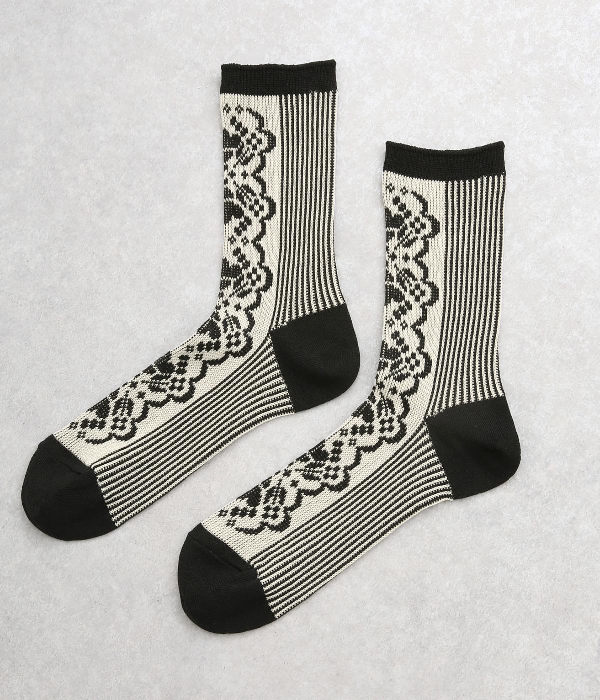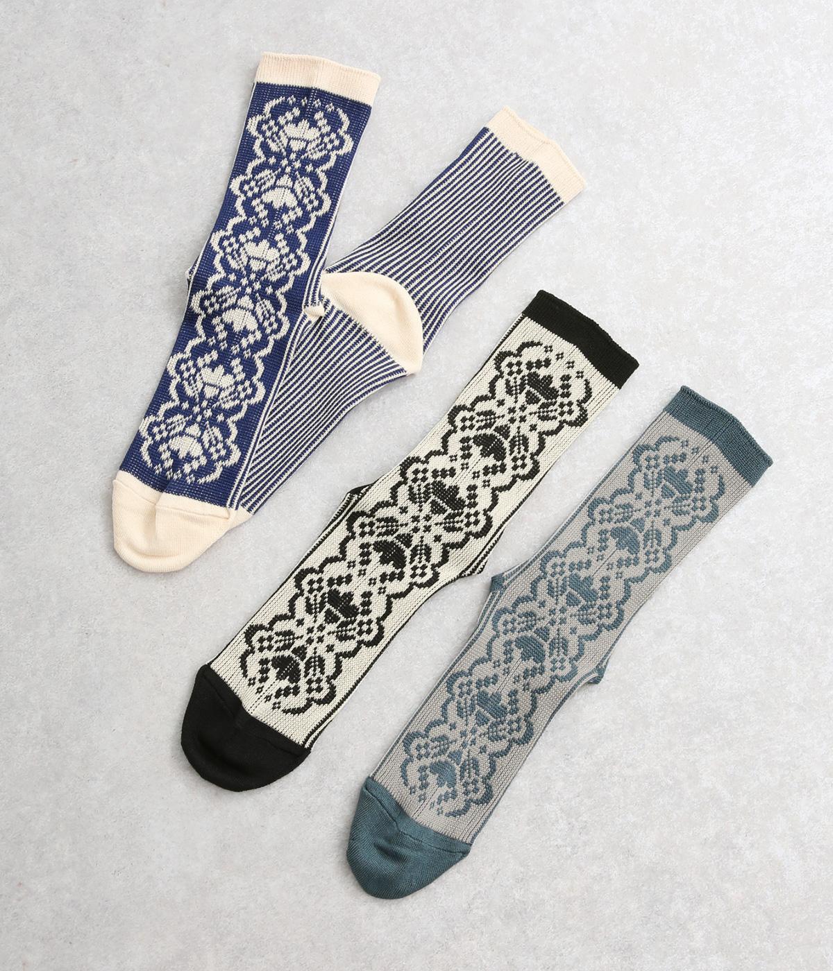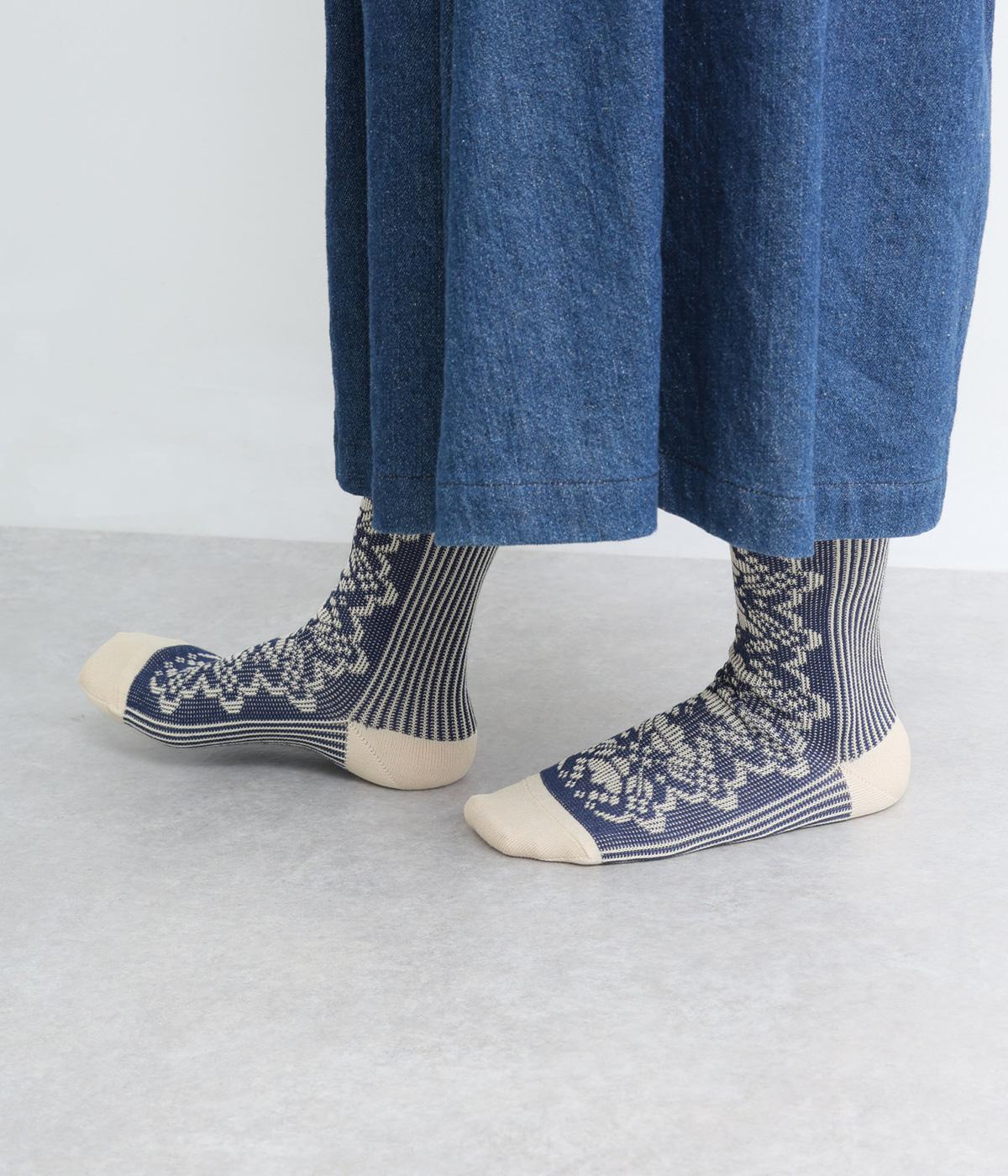 パーティの華やかな光景をイメージした、足元のワンポイントになるソックス。フロントは花柄、後ろはストライプと、前後で印象が変わってどこから見てもお洒落に。シックな配色なのでコーディネートに取り入れやすいのも魅力。