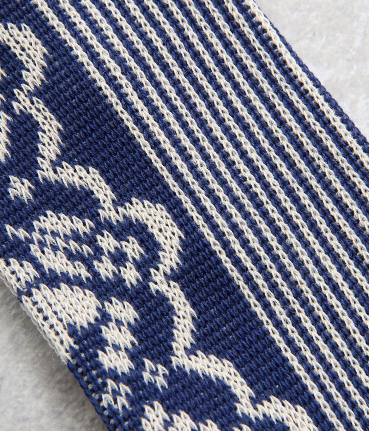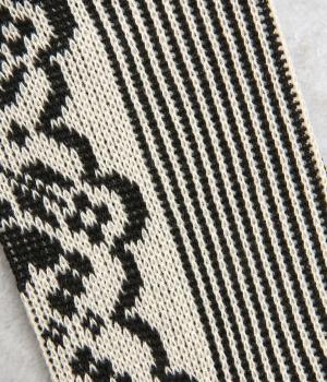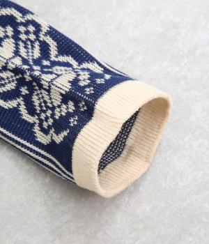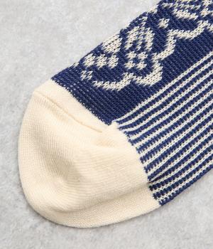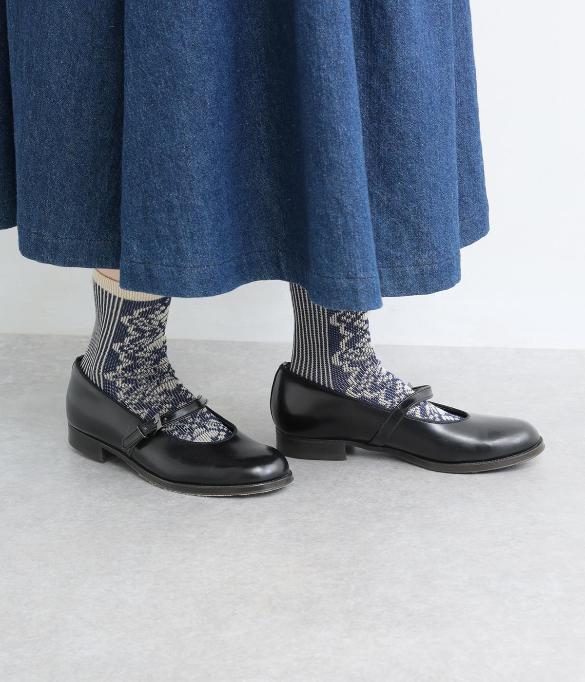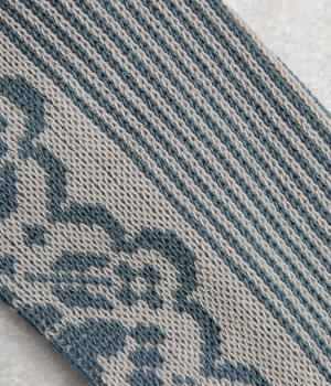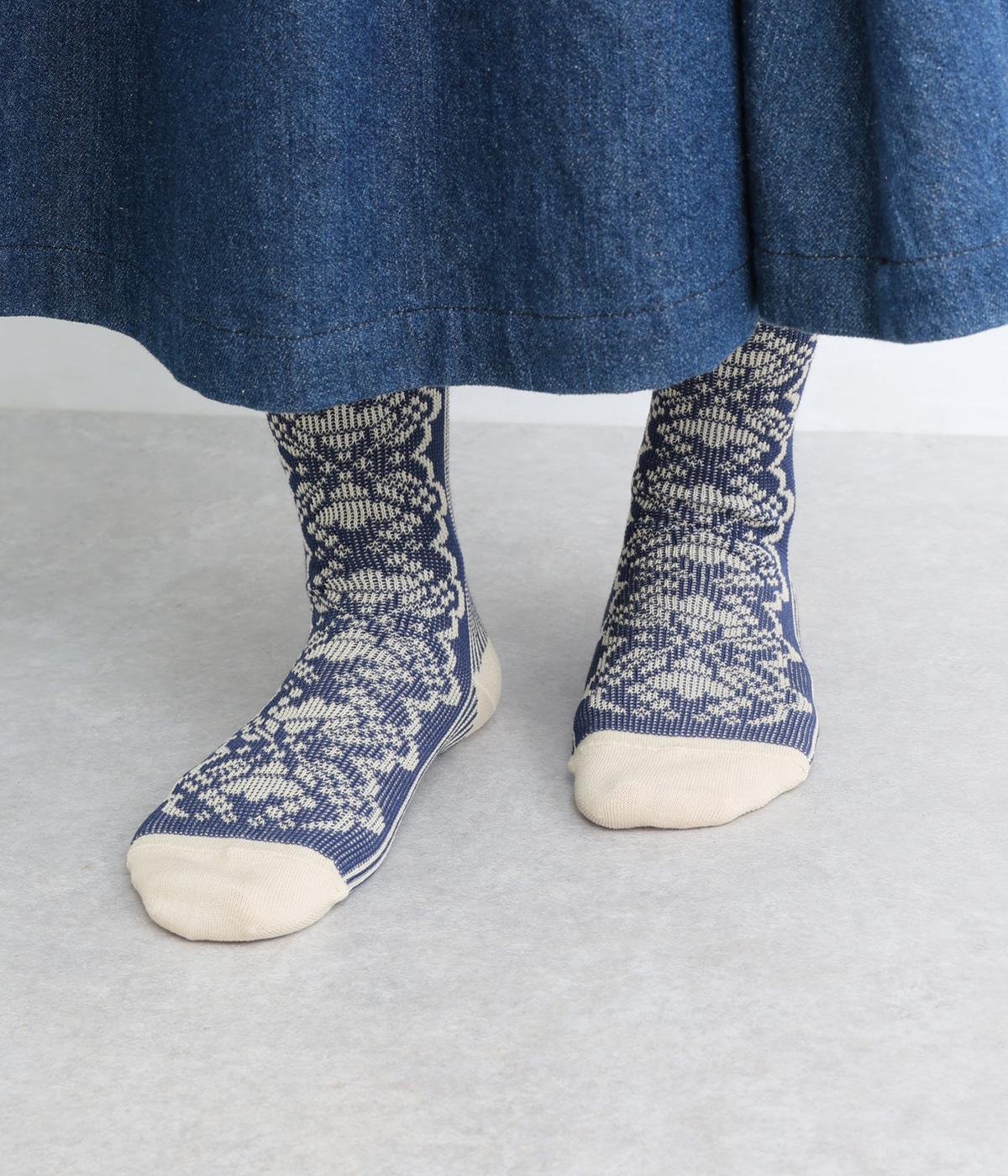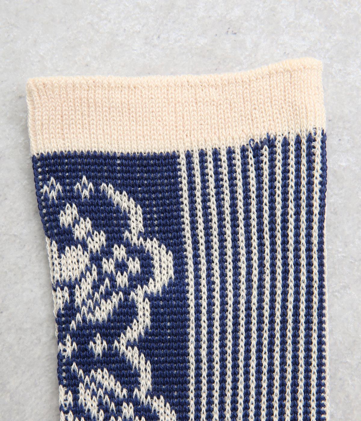 パーティの華やかな光景をイメージした、足元のワンポイントになるソックス。フロントは花柄、後ろはストライプと、前後で印象が変わってどこから見てもお洒落に。シックな配色なのでコーディネートに取り入れやすいのも魅力。