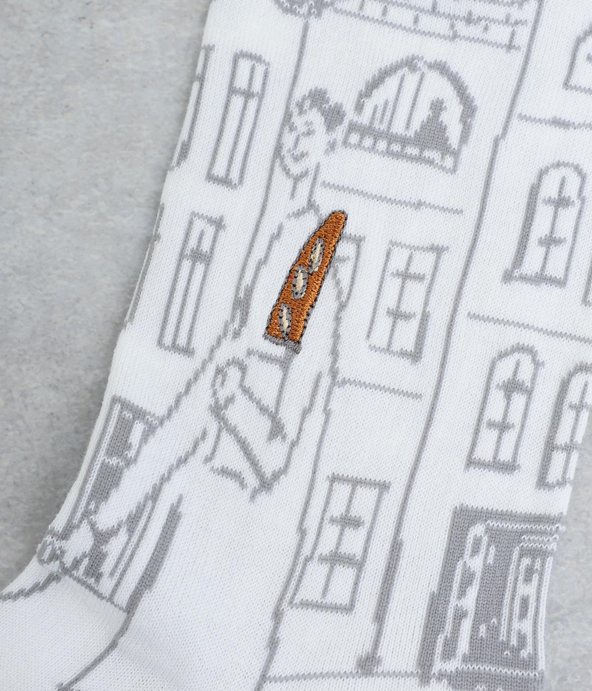 海外のような素敵な街並みと犬を散歩させるおしゃれな女性がデザインされたソックスです。フランスパンや鳥の色使いがポイントに。ベースはやさしい色合いなので、派手すぎずコーディネートになじみやすいのも◎です。
